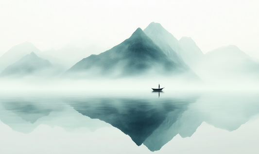 Silent Expanse – Self-adhesive digital wallpaper in Japandi style with boat & fog