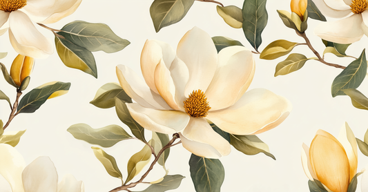 Magnolia Grace – Self-adhesive digital wallpaper with large-format magnolias in cream, gold, and olive green