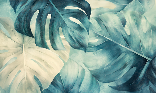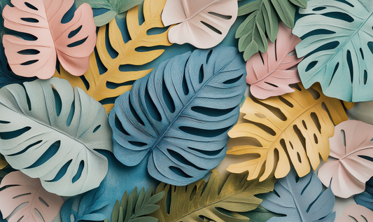 Color Tropic – Self-adhesive digital wallpaper with stylized monstera and palm leaves in sorbet colors