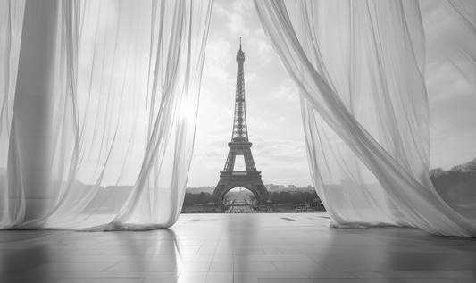 Parisian Whispers - Self-adhesive digital wallpaper with Parisian silhouette behind curtains