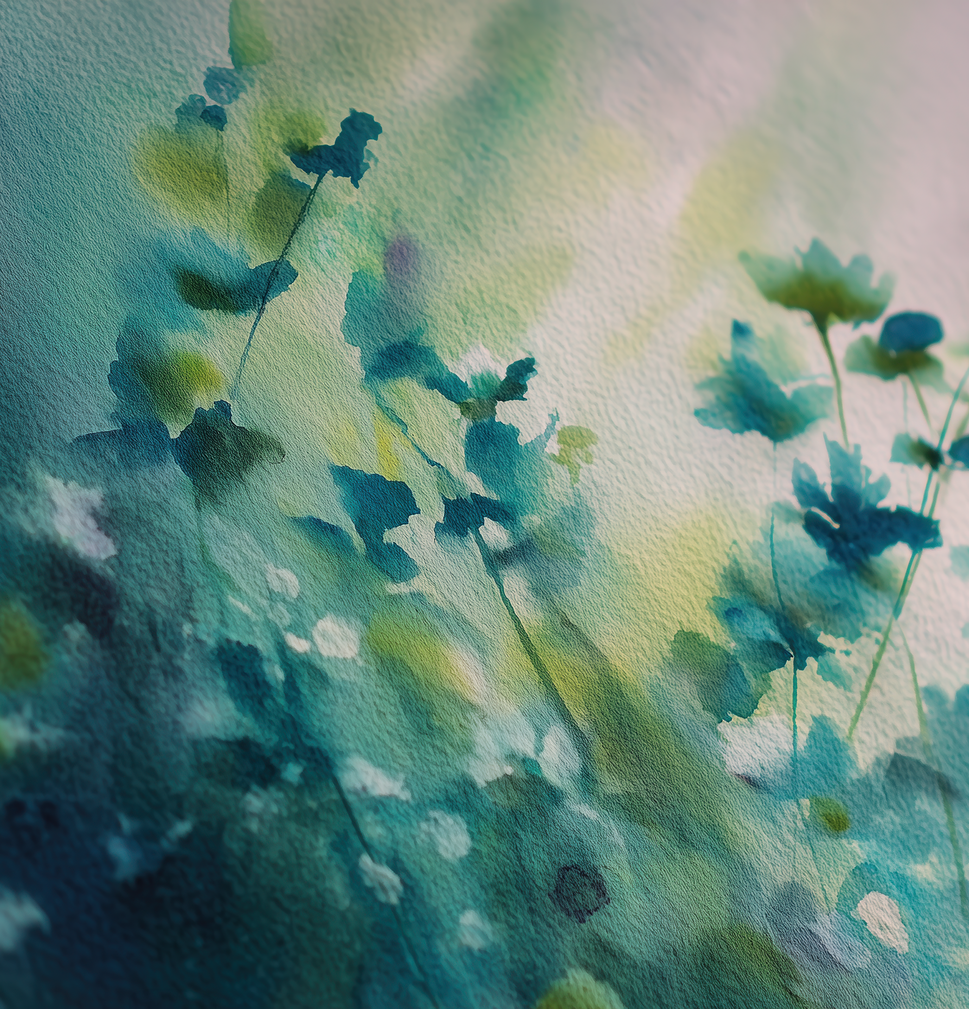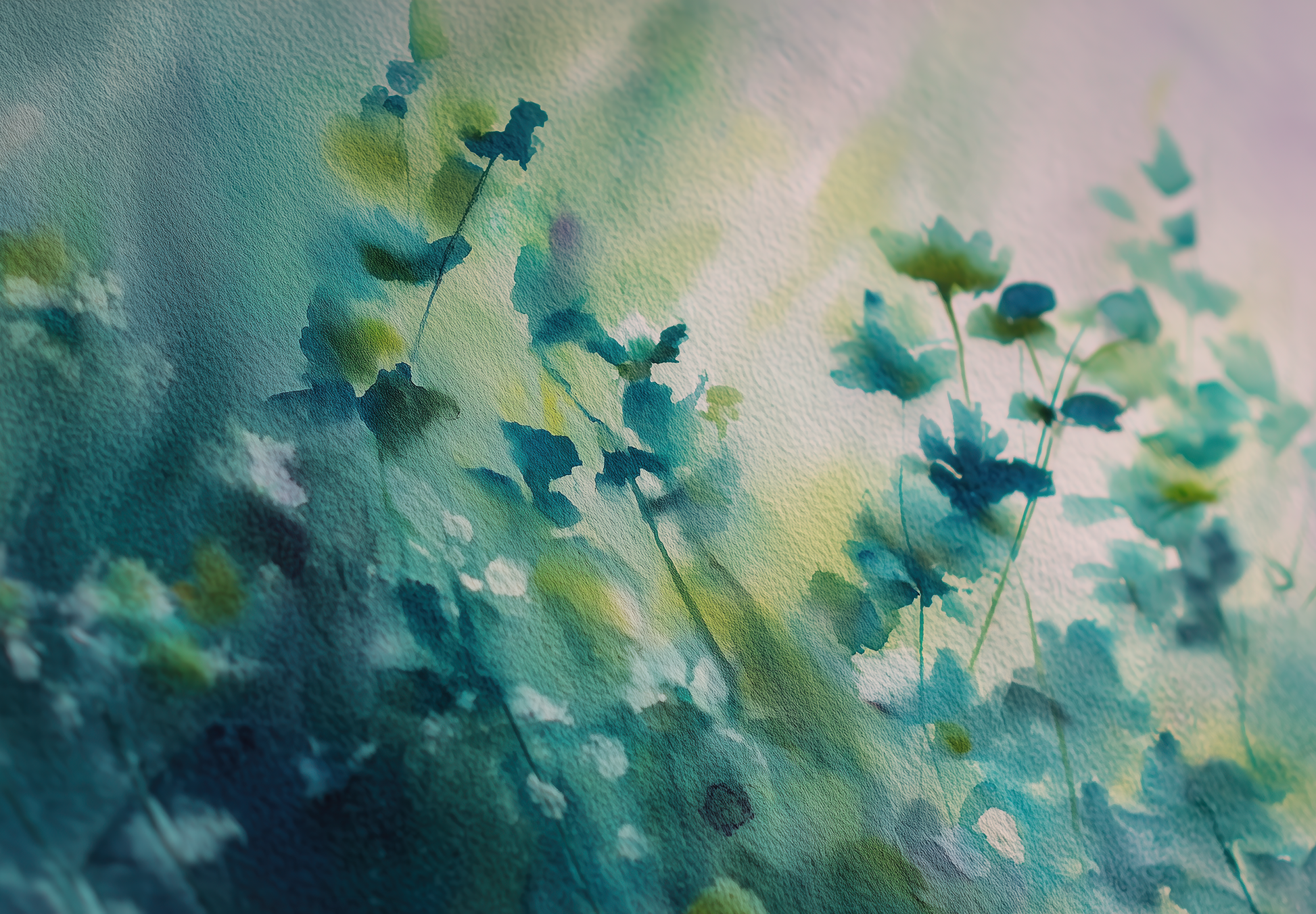 This digital wallpaper appears like a breathing brushstroke—fine, airy, and full of movement. In delicate watercolor gradients, leaves and grasses in shades of green, turquoise, and blue dance across the textured wallpaper. The image is deliberately diffused—like a fleeting glimpse of a summer meadow in the morning light. The texture of the paper is noticeably visible, lending the motif artistic depth. Ideal for rooms that should exude a calming, gentle atmosphere—such as bedrooms, relaxation rooms, or spa areas. This wallpaper is understated yet full of character: a quiet homage to nature in its most fleeting form.