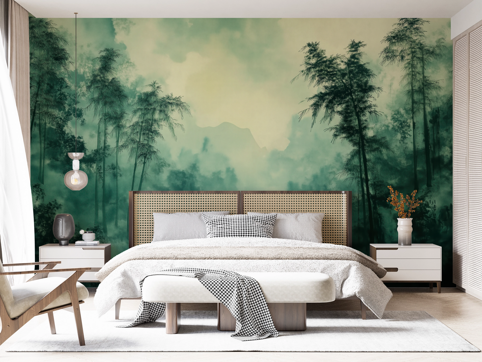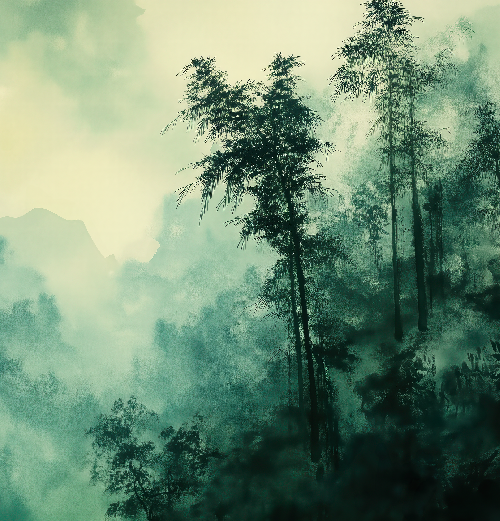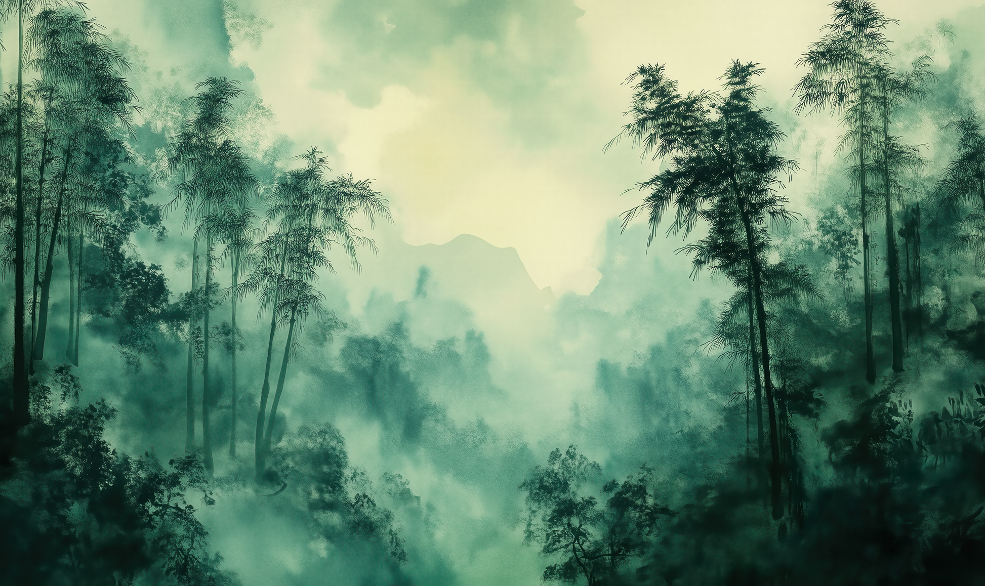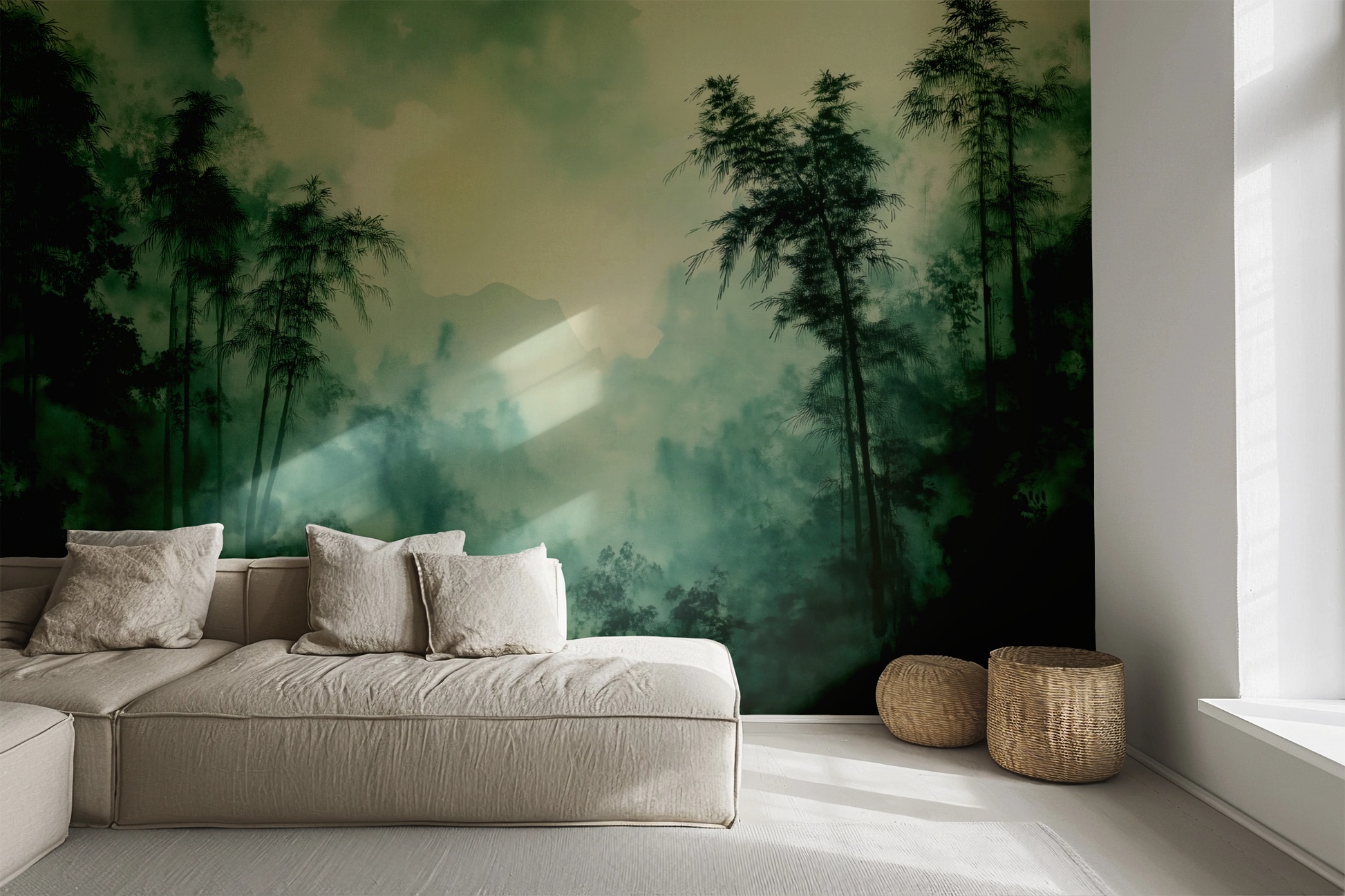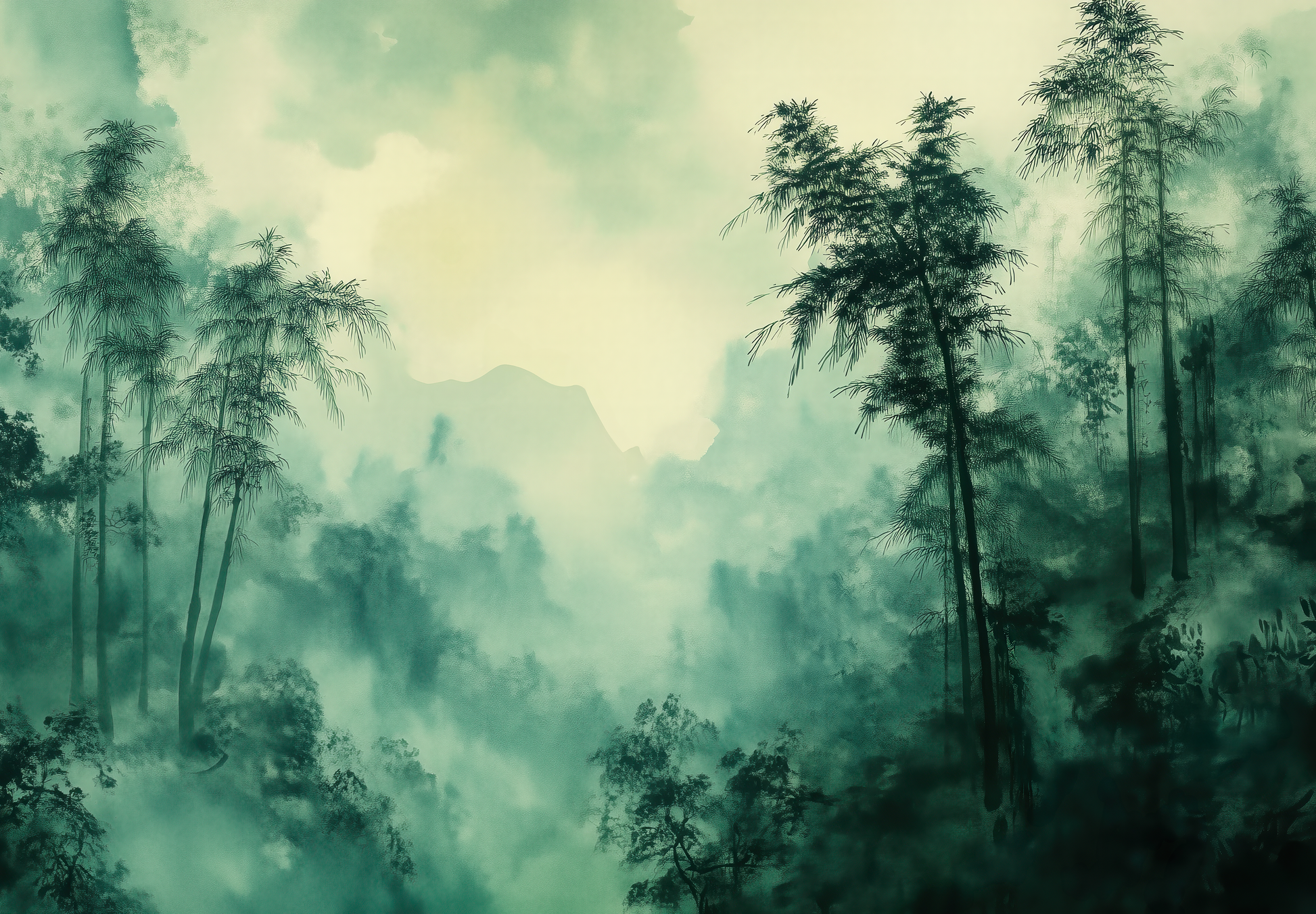 This atmospheric wall design captures the quiet magic of a bamboo forest shrouded in morning mist. Delicate green tones blend with transparent light that gently filters through the tall, slender bamboo trunks. The gradient of light and shadow creates a calming, almost meditative depth—like a window into a tranquil, Far Eastern world.
