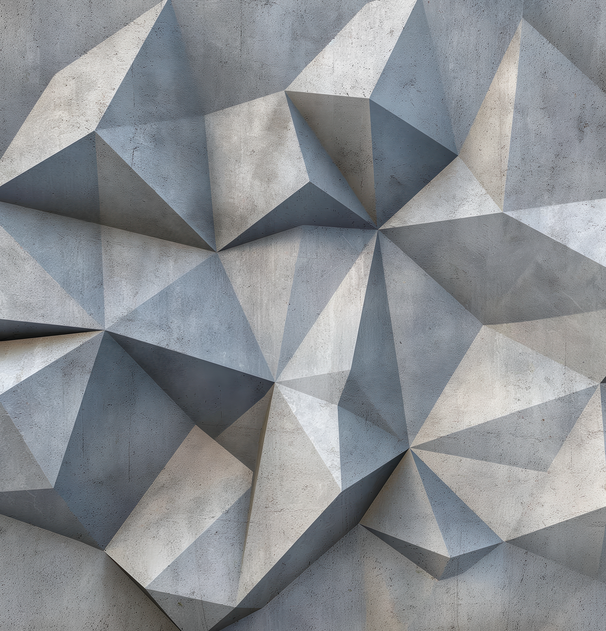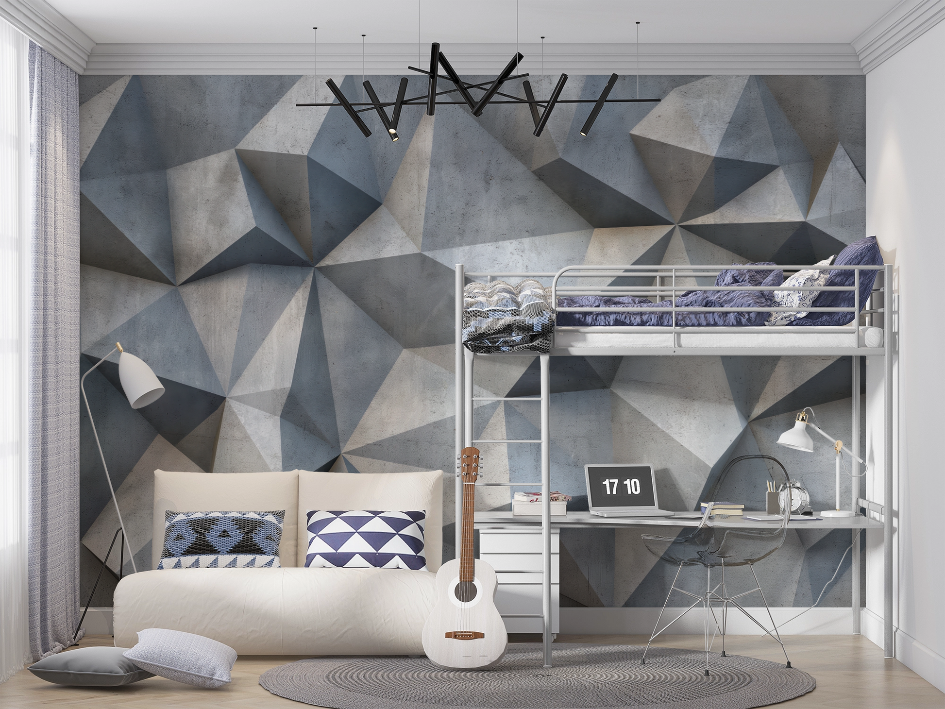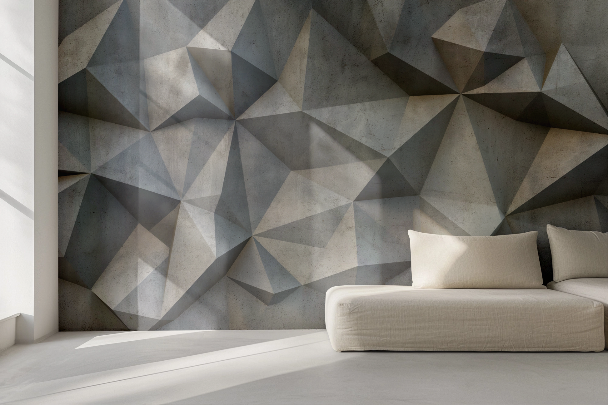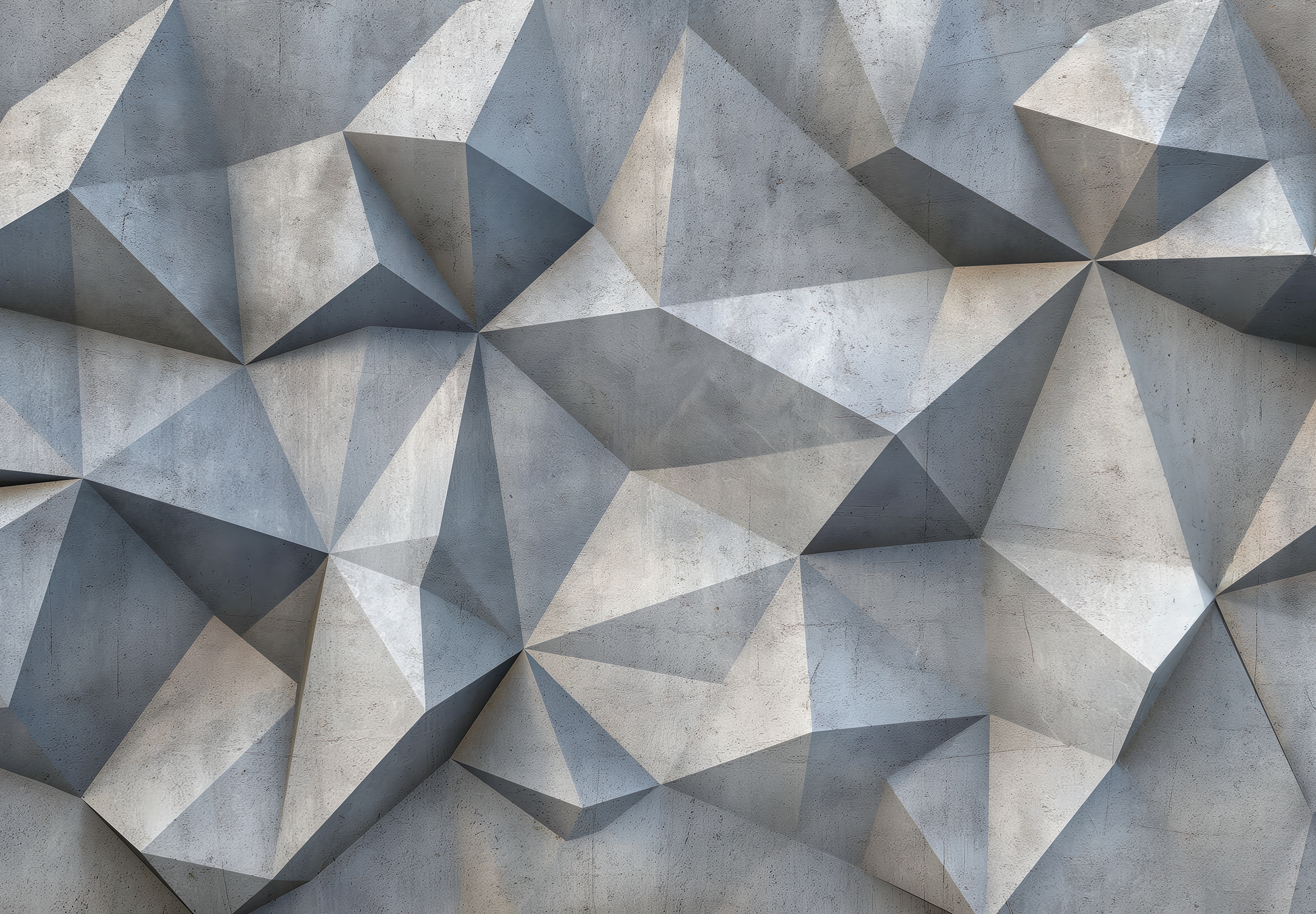 This digital wallpaper lends the room an expressive architectural presence. The surface resembles polished concrete, revealing a sophisticated interplay of faceted triangles. The clean edges, sharply defined joints, and shimmering shades of gray create an almost sculptural effect—as if a wall of crystalline concrete were unfolding before the eye. The color palette ranges from light concrete gray to cool steel blue to muted taupe, interspersed with soft shadow gradients. Depending on the light, the design unfolds into a dramatic, almost three-dimensional depth—ideal for modern lofts, urban offices, or spaces with strong design aspirations.