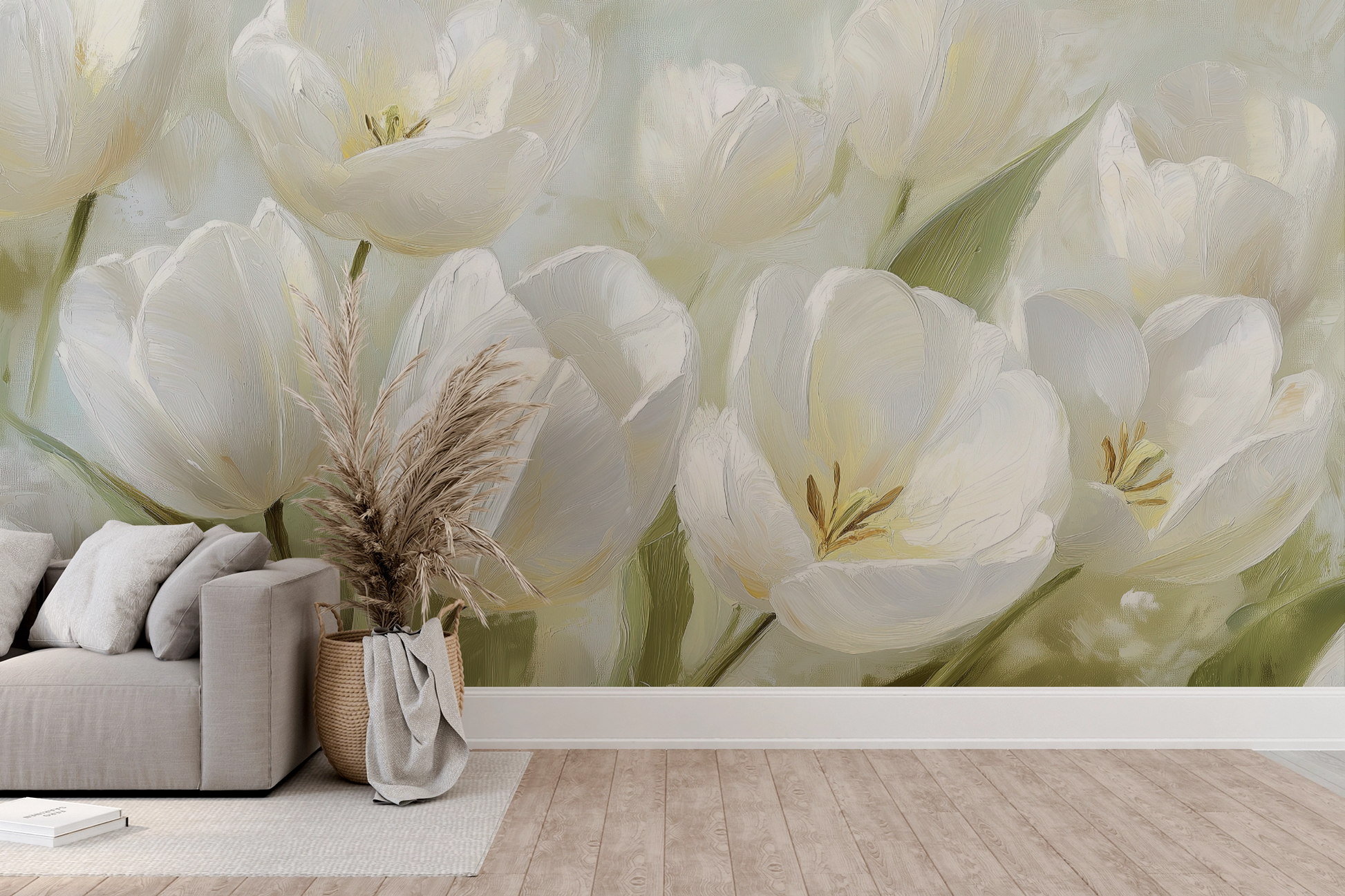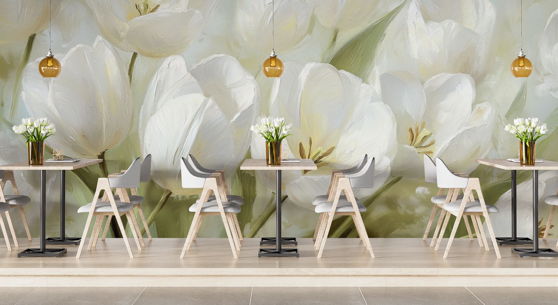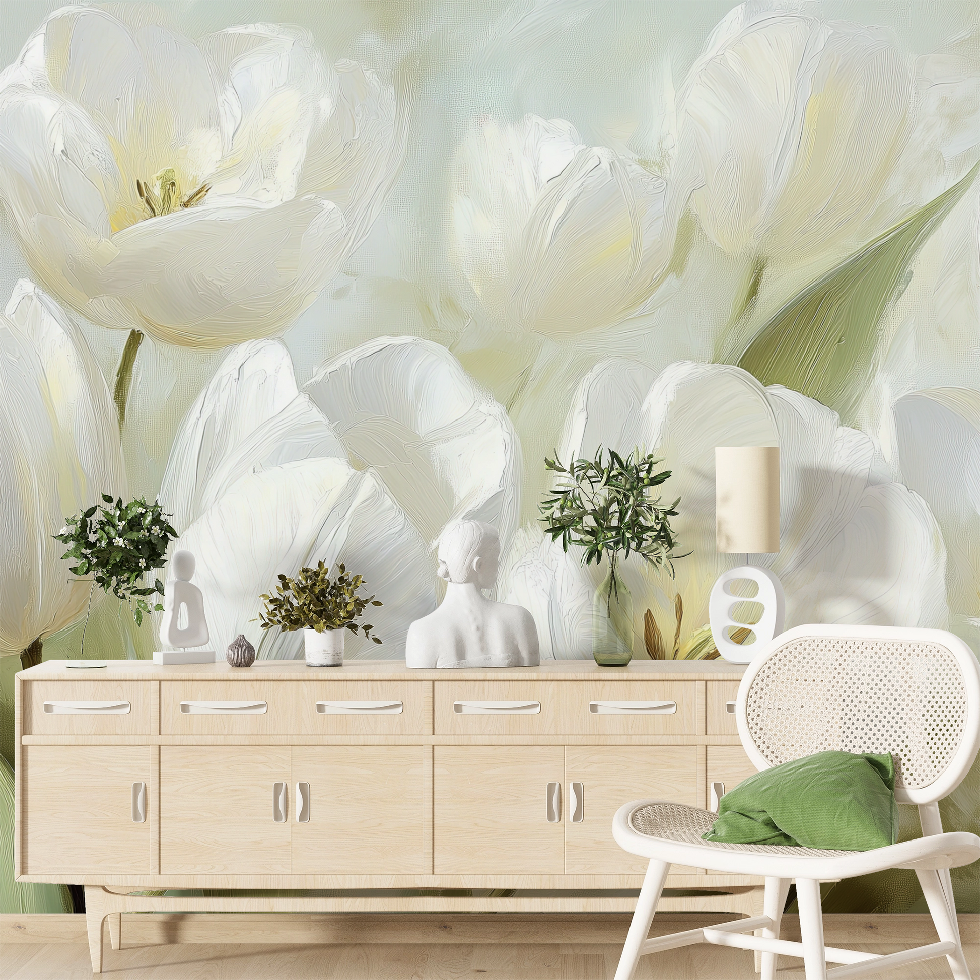 Blanche de Jardin – Self-adhesive wallpaper with white tulips and quiet elegance