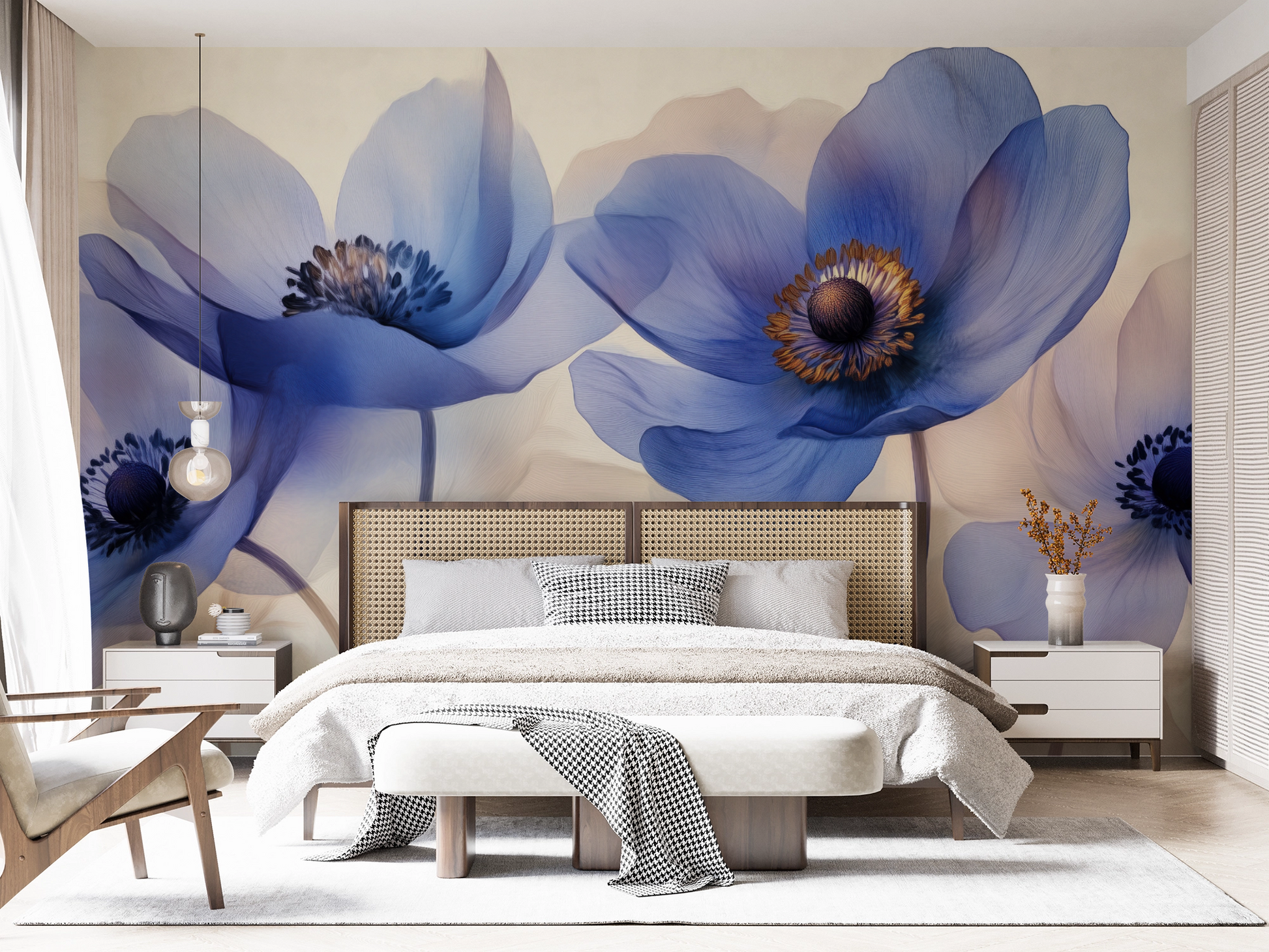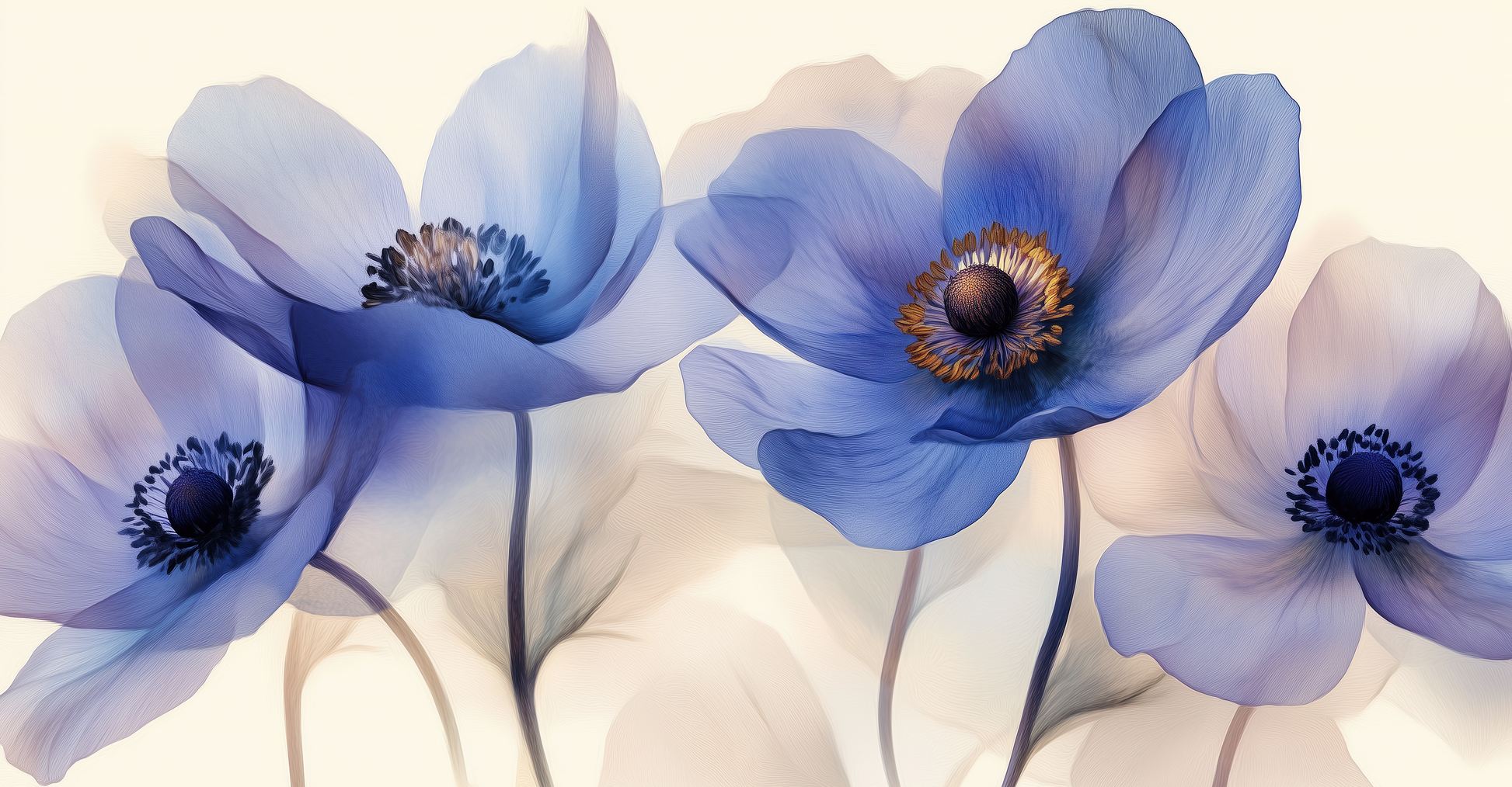 This self-adhesive digital wallpaper brings a floral lightness to any room: Delicate anemones in lavender, cornflower, and sky blue shades unfold against a light-filled background, as if painted from the finest silk. The transparent petals appear weightless and lend the room a poetic serenity. Ideal for bedrooms, dressing rooms, or stylish living areas that exude a soft, elegant touch with a hint of naturalness. The design looks particularly harmonious when combined with light wood, natural textiles, and soft pastel shades.