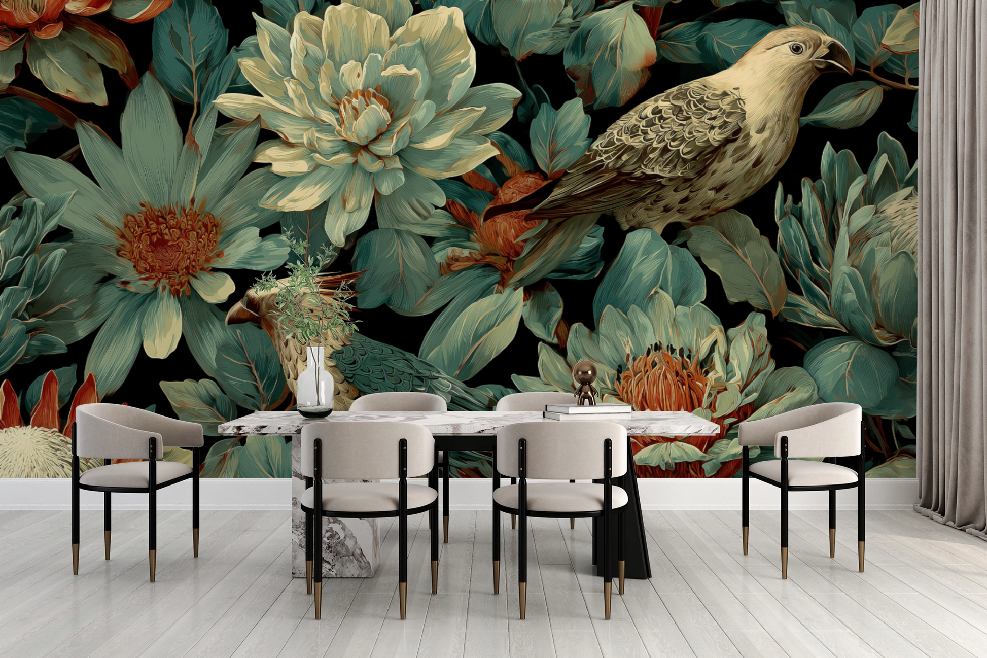 An opulent interplay of flora and fauna: This digital wallpaper depicts a paradisiacal scene in which richly illustrated tropical birds perch amidst lush botanical blossoms. The combination of exotic parrots and parakeets with graphic magnolias, lotus, and protea blossoms creates a fascinating tension between the depiction of nature and design aesthetics. The dark background enhances the luminosity of the colors – from cool turquoise green to warm sandy beige to deep terracotta. The motif is reminiscent of hand-colored copperplate engravings or high-quality fabric prints and creates a dramatic yet elegant atmosphere. Ideal for interiors with a touch of exoticism, character, and sensuality. Whether as an eye-catcher in the living room, an extravagant wall in a boutique, or a decorative statement in the office – this wallpaper creates spaces that tell stories.
