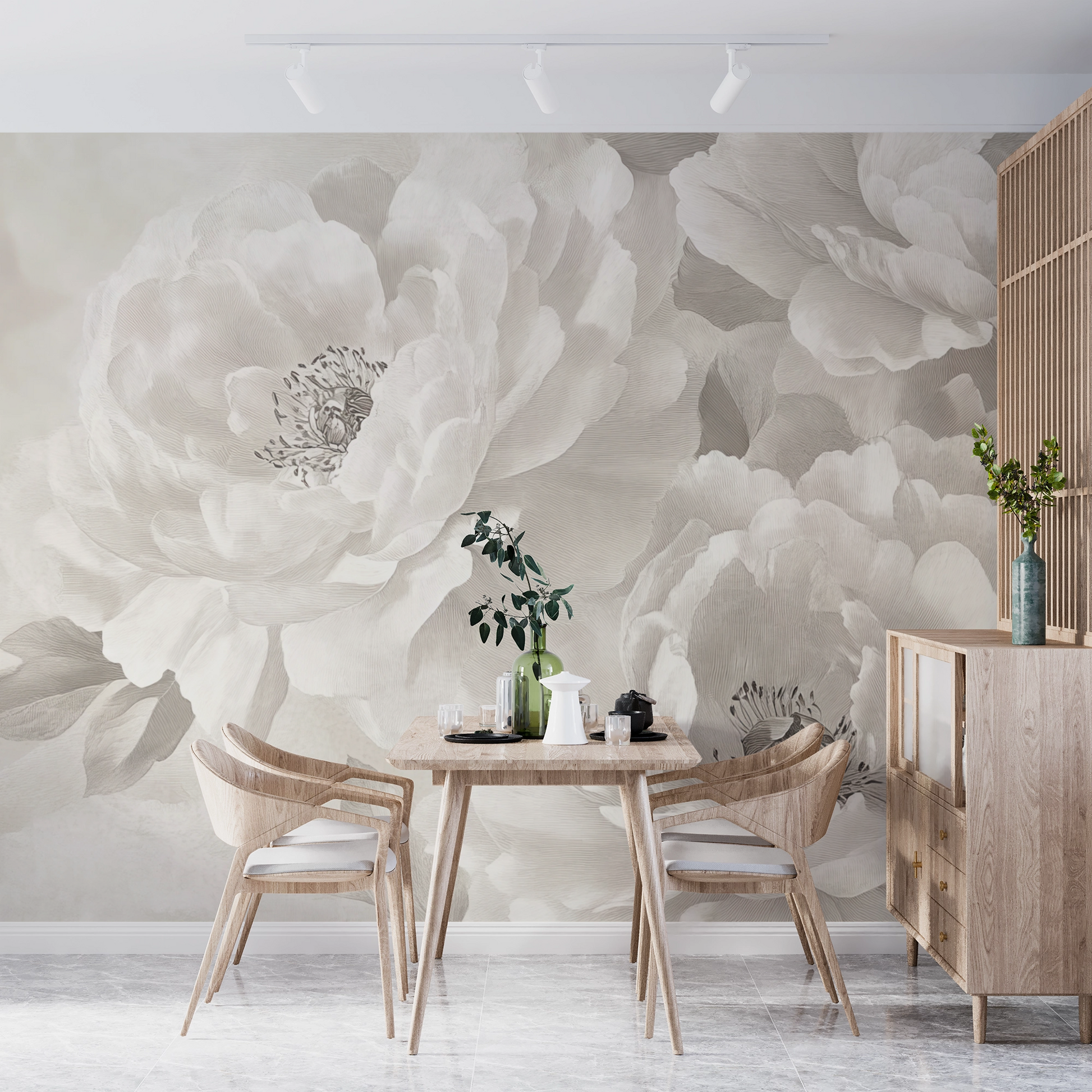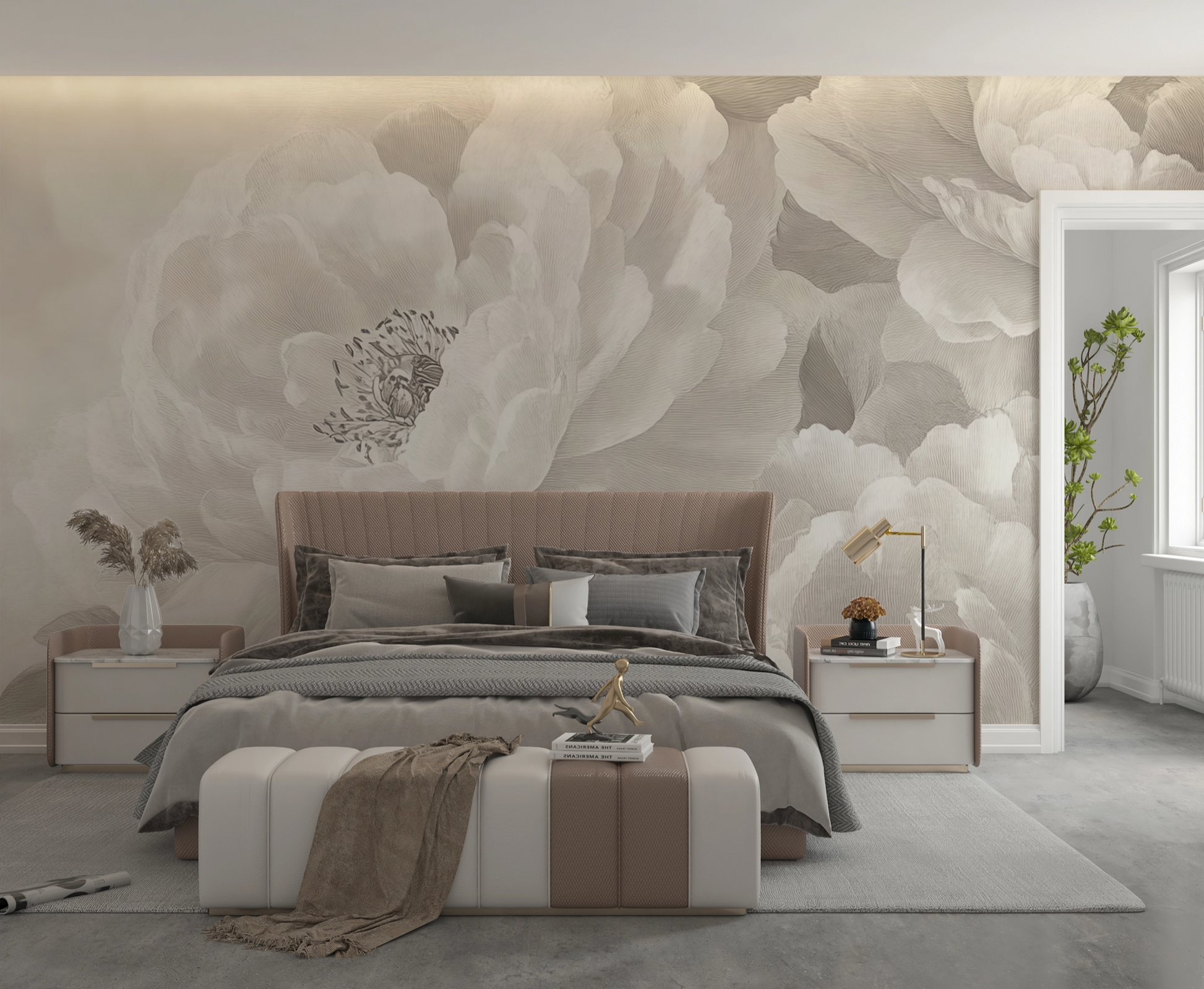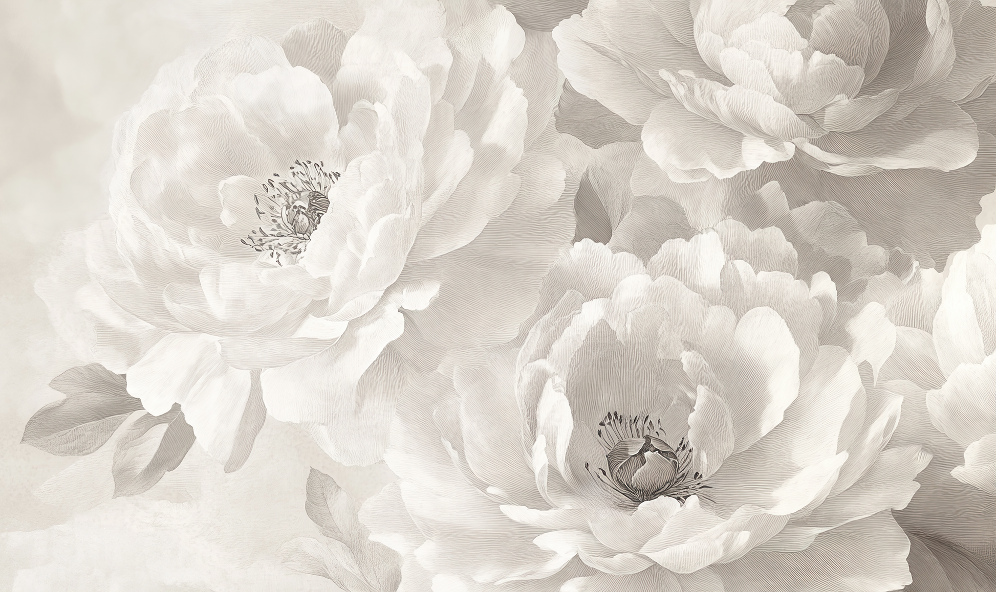 This mural combines classic elegance with modern restraint. "Flower Poetry in Sepia" features finely illustrated peonies in warm natural and sepia tones—a composition full of harmony, grace, and quiet power. The hand-drawn lines and delicate shading give the motif an almost textile feel—like a floral work of art on high-quality paper. This digital wallpaper is perfect for calm, stylish interior designs—from elegant bedrooms to sophisticated living rooms or bathrooms. It brings lightness, depth, and timeless sophistication to the wall and combines beautifully with light natural materials, muted colors, or minimalist furnishings.