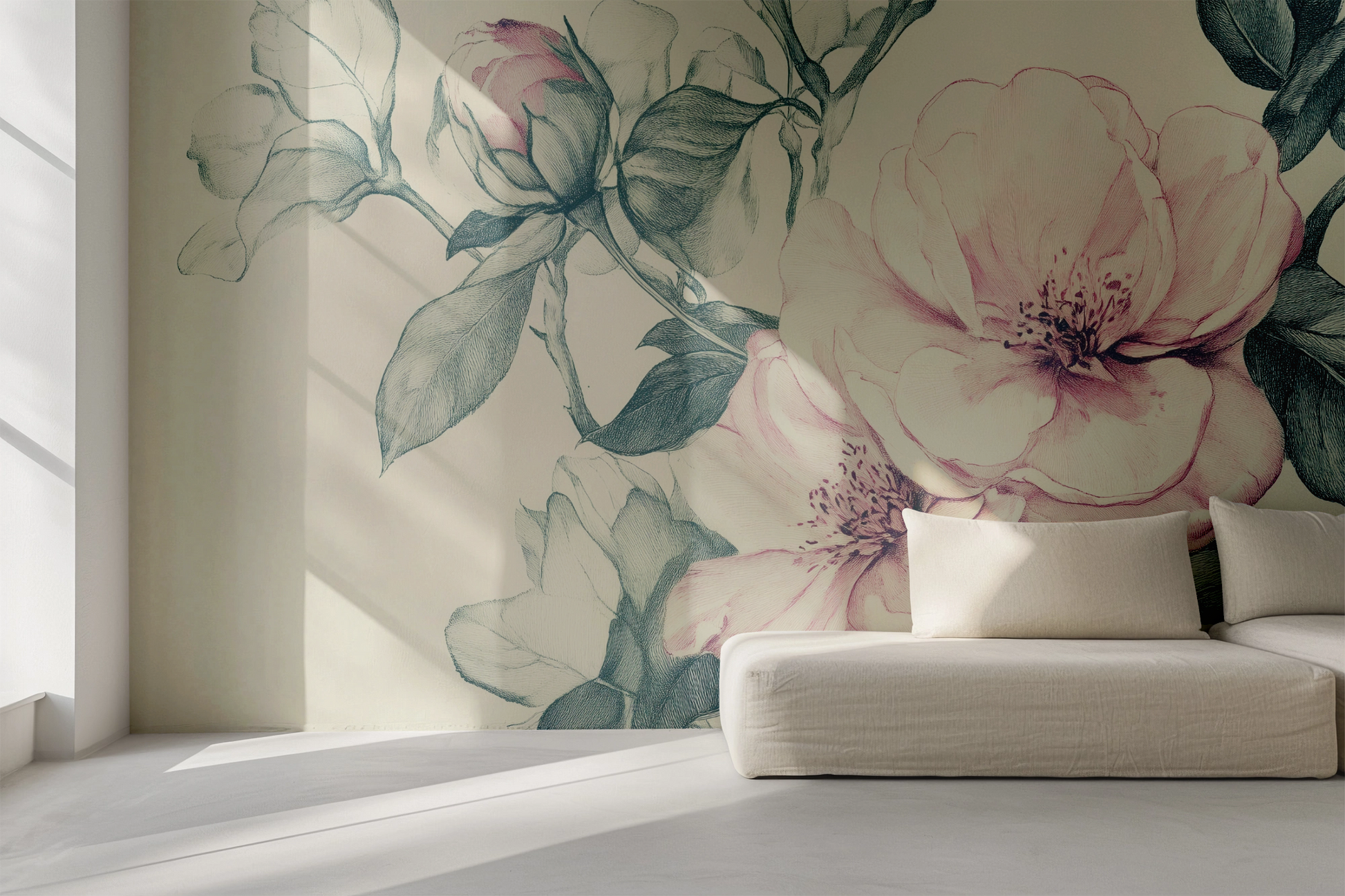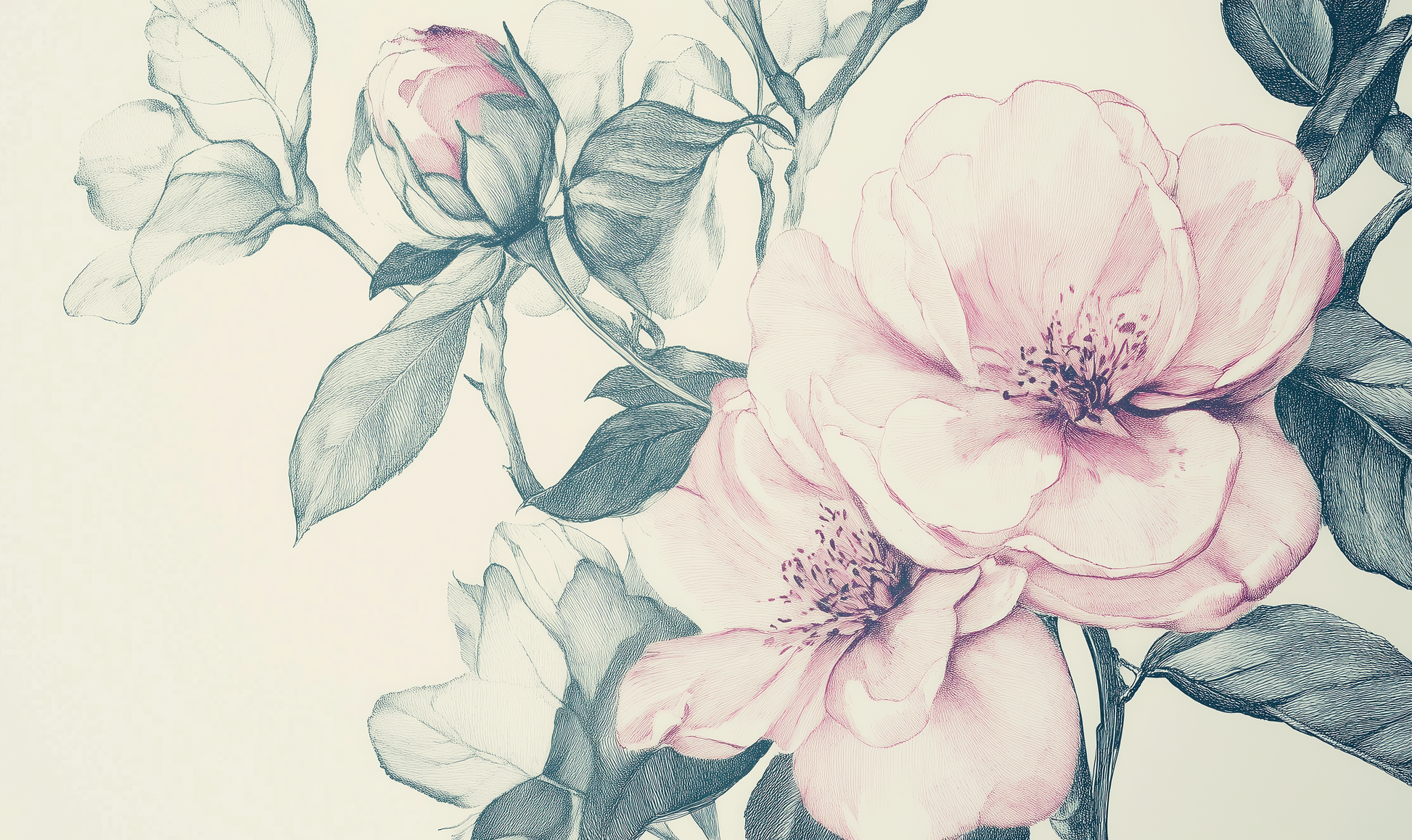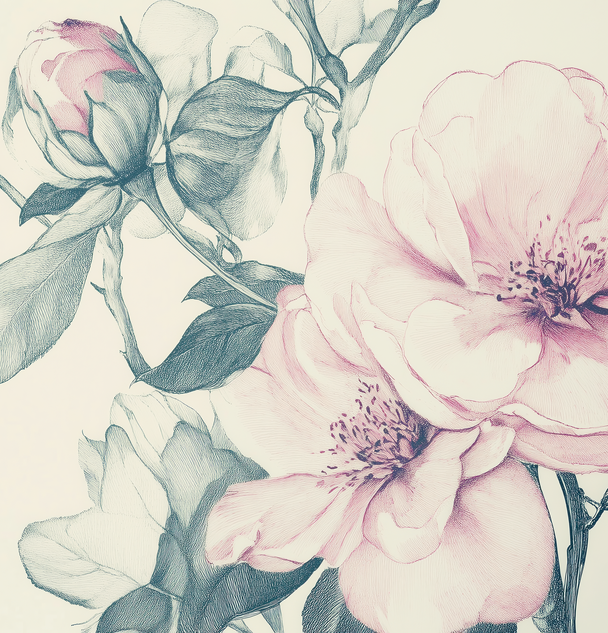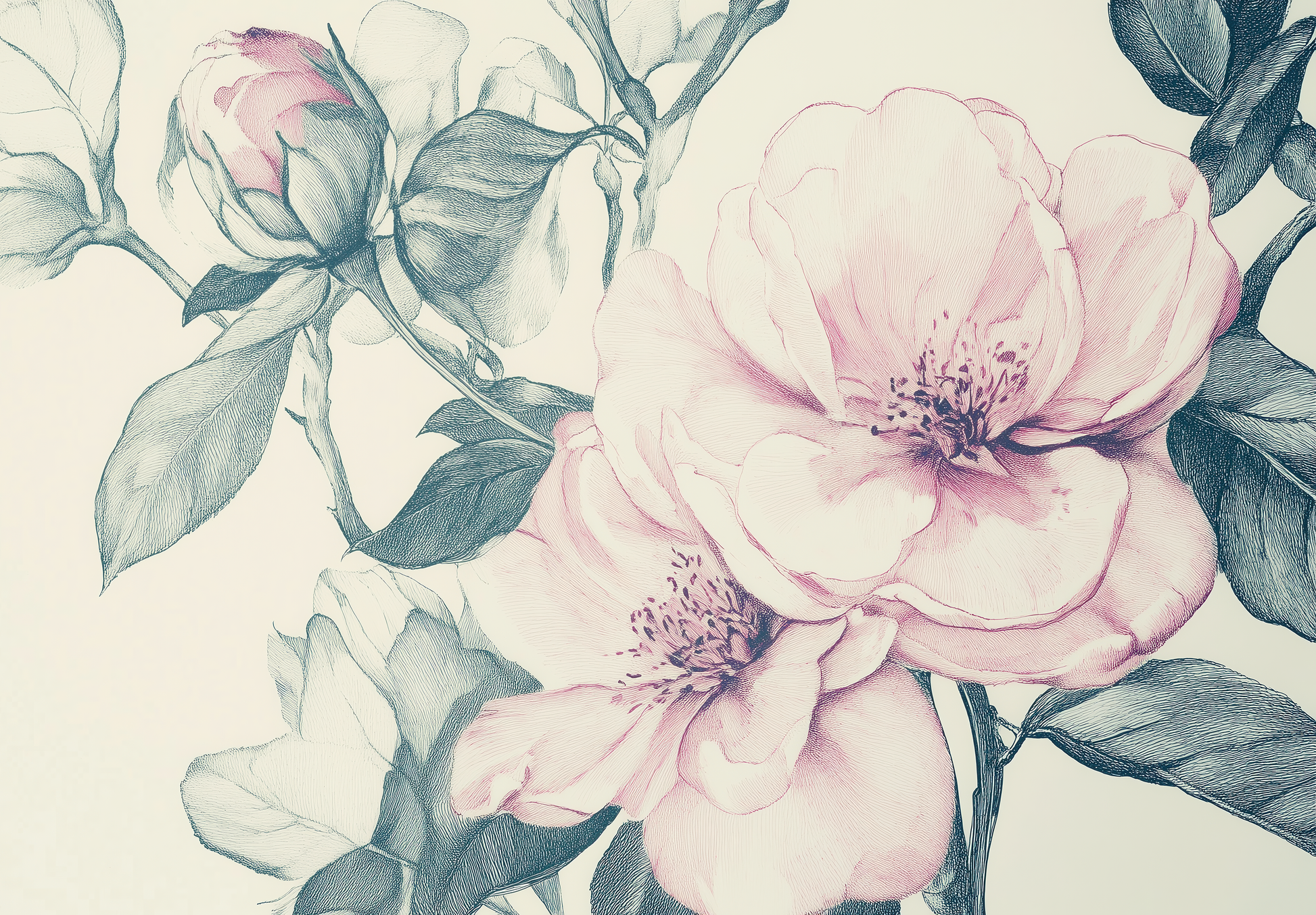 Finely drawn lines and delicate rose tones combine in this botanically inspired floral motif to create an elegant wall mural with a vintage flair. The combination of illustrative precision and romantic color scheme makes Botanique Rosé a stylish highlight for living rooms or bedrooms with artistic aspirations. Ideal for lovers of refined aesthetics and floral elegance.