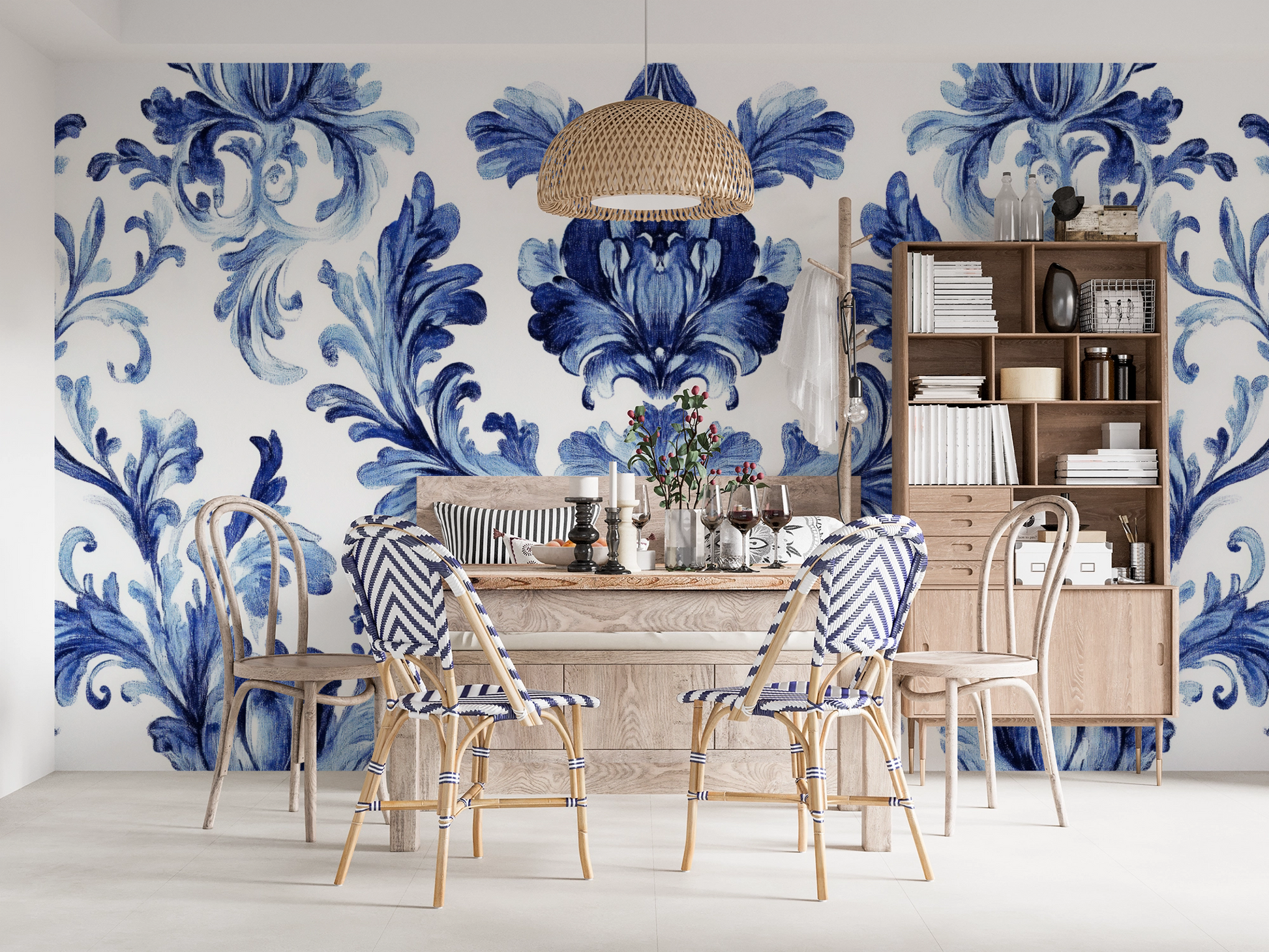 Experience classic elegance reinterpreted: Château Bleu is a self-adhesive digital wallpaper inspired by the wallpapers of 18th-century French mansions. The detailed ornament unfolds in a clear blue and white contrast – traditional yet modern. The fine lines lend the design a timeless nobility that adds sophisticated depth to any room. This wallpaper brings French flair to a wide variety of interior design concepts: ideal for elegant period apartments, boutique hotels, stylish bedrooms, or as a sophisticated accent in the dining room. Château Bleu combines classic ornamentation with modern lightness – for anyone seeking home decor with history and style.