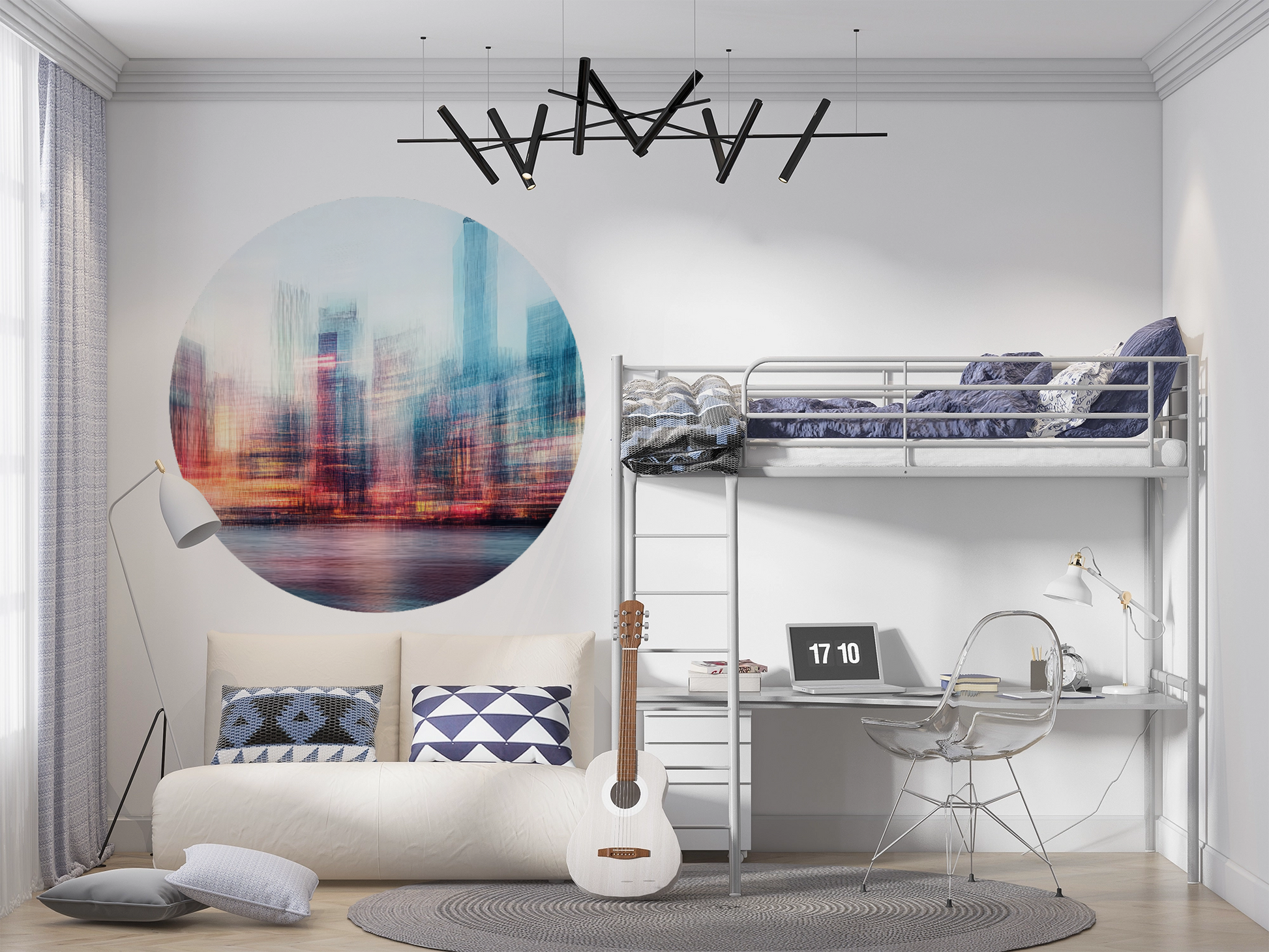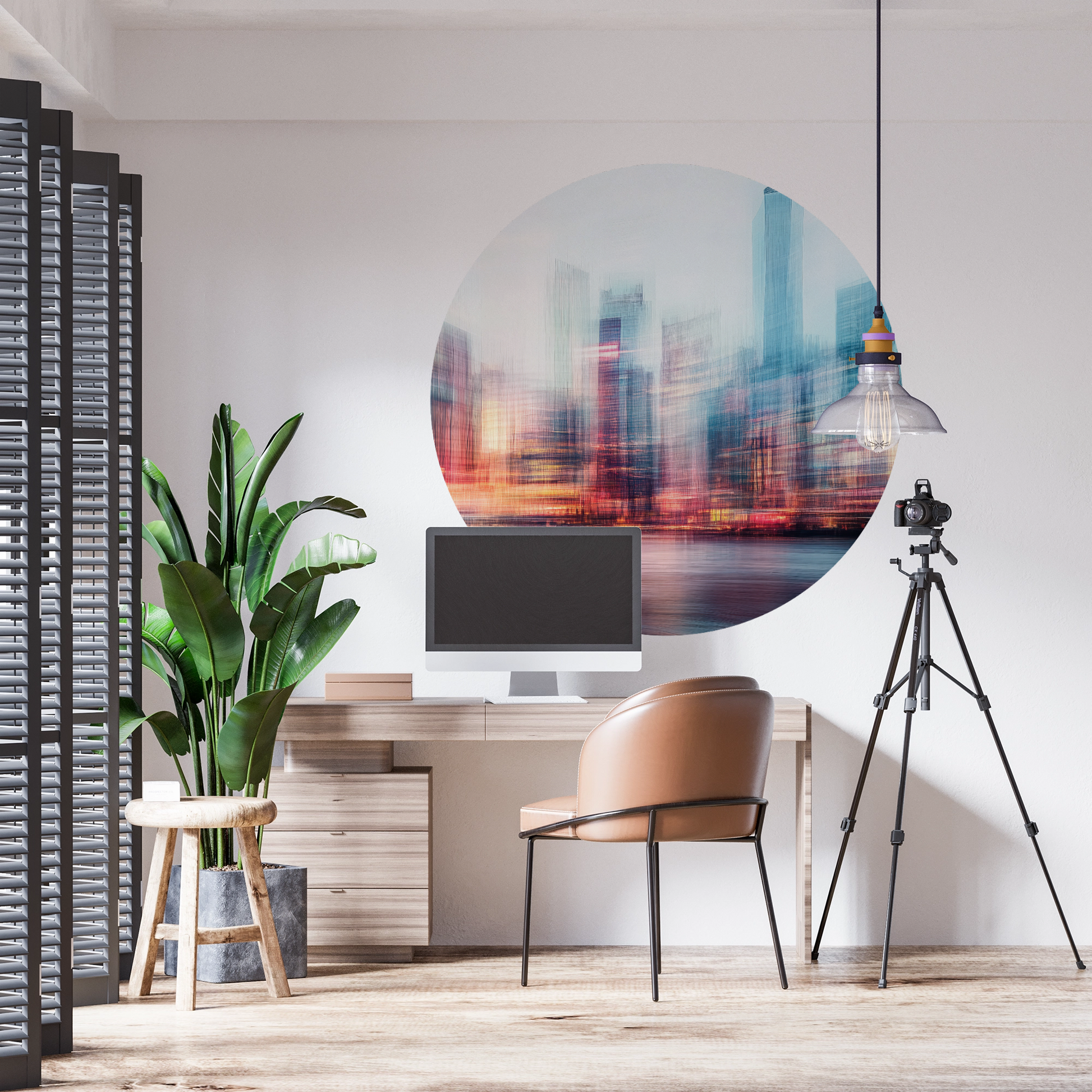 "City Glow" is a visual poem to modern city life—pulsating, vibrant, and full of movement. The stylized skyline, captured in abstract movement and vibrant colors, lends the motif a dynamic depth that transforms any room into a stage for urban energy. Ideal for modern living and work spaces, this design brings cosmopolitan elegance to your wall without being overpowering. The color palette of soft blues, rosé nuances, and warm light yellow conveys a sense of a big city at sunset.