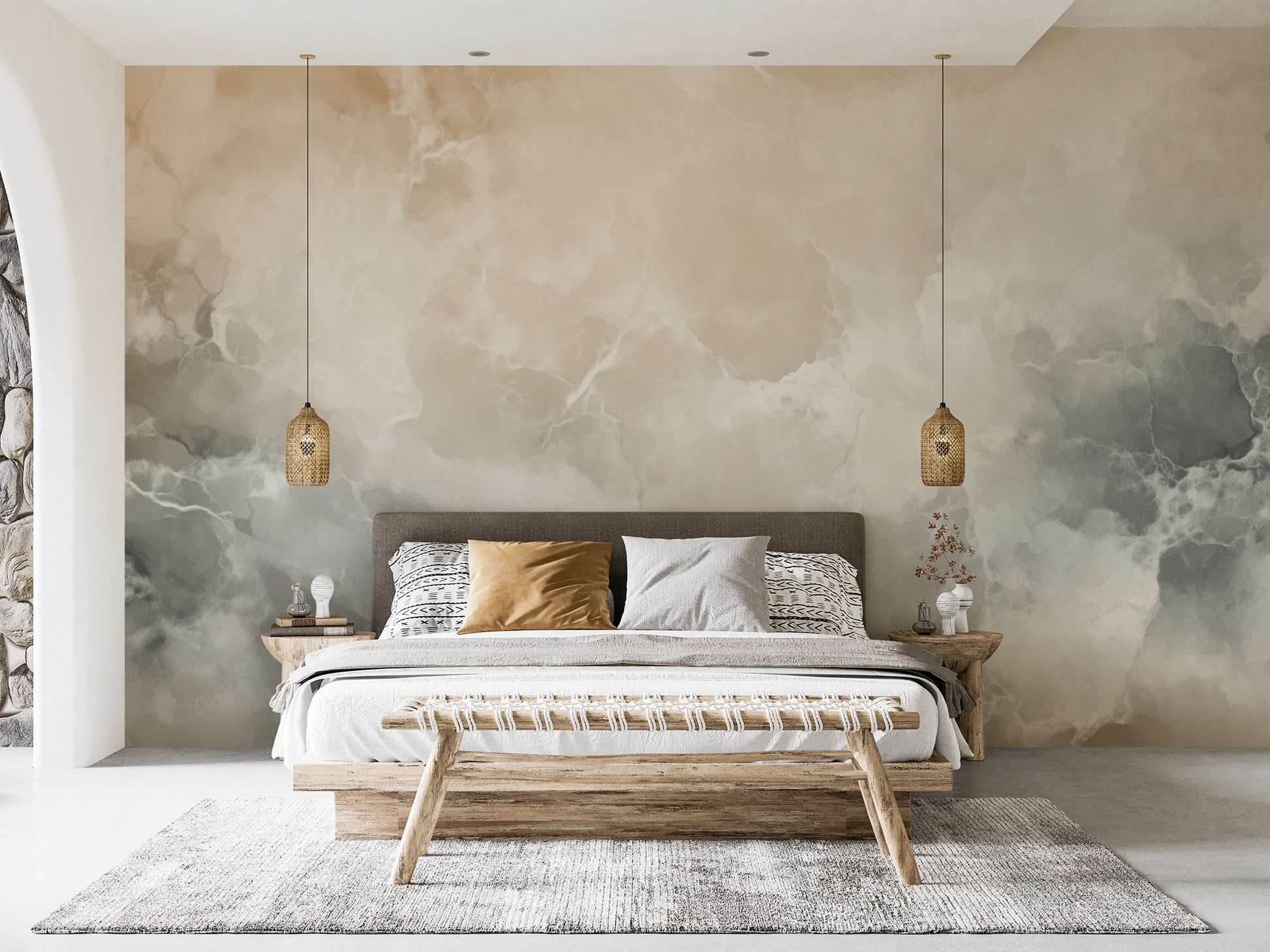 Cloud Veil is a poetic digital wallpaper that creates a special atmosphere with delicate color gradients, a finely textured surface, and light-filled depth – like a painting of clouds, fog, and a mineral landscape. The colors – beige, sand, mist gray, and stone blue – flow softly into one another, giving the wall a sense of breathing calm. The abstract composition lends the room a sense of lightness and meditative clarity without being decoratively overloaded. Cloud Veil is ideal for bedrooms, spa areas, entryways, or as a visual counterbalance in open-plan living spaces. Perfect for soft minimalism, Japandi, or urban natural interiors—for spaces with a quiet presence and artistic depth.