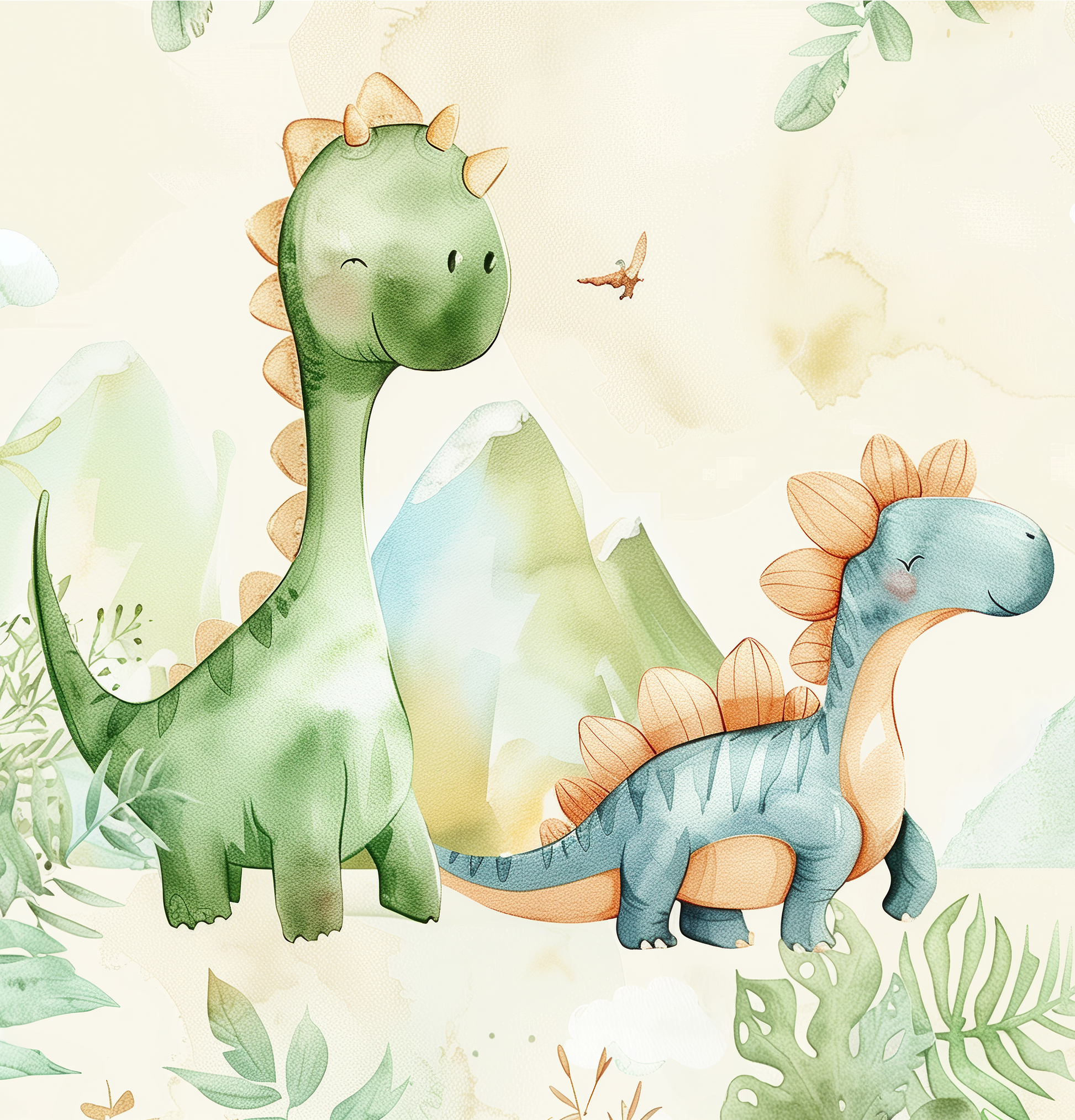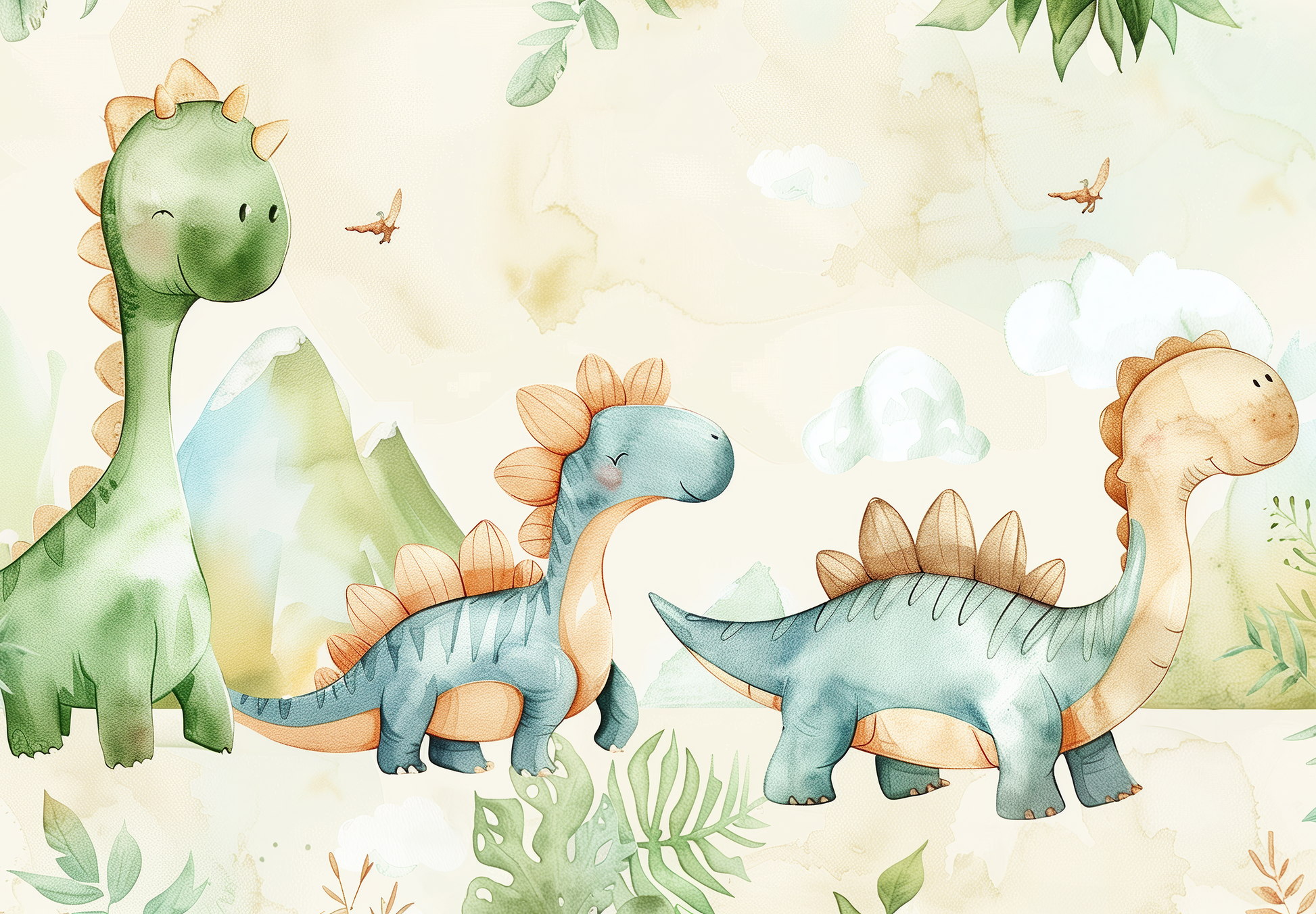 This lovingly illustrated children's wallpaper brings cheerful dinosaurs with gentle characters directly into the nursery. The hand-drawn prehistoric companions march through a soft fantasy landscape of palm trees, mountains, and small clouds – all without noise, but with plenty of charm. The color palette of delicate green, muted turquoise, warm beige, and a hint of apricot was deliberately chosen to create a harmonious atmosphere of calm, security, and a warm atmosphere. Ideal for baby rooms, toddler rooms, or play areas where child-friendly design with stylish restraint is required. The wallpaper complements wooden furniture, natural textiles, and modern interior design concepts. Thanks to its self-adhesive backing, the wallpaper can be applied easily and cleanly – ideal for parents who want to combine design with ease.