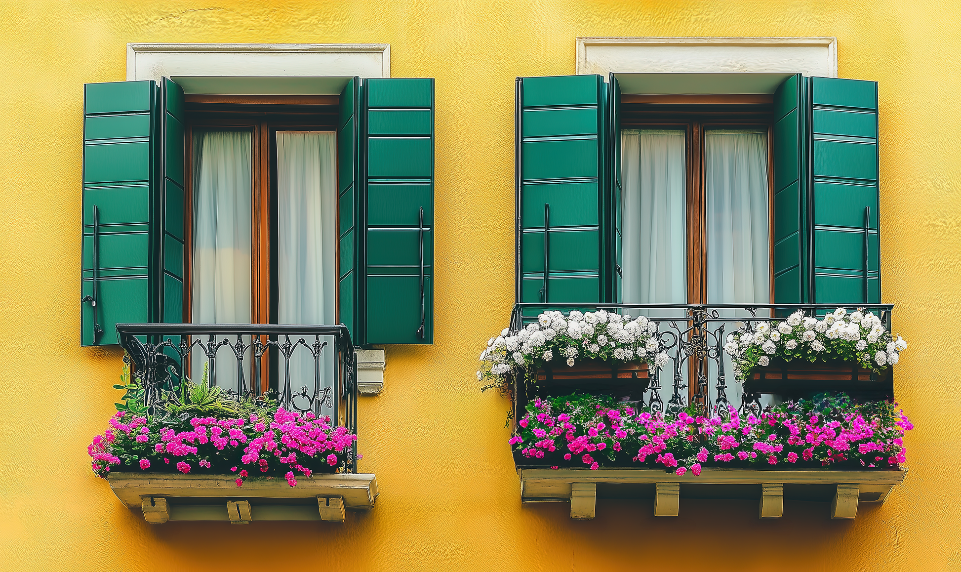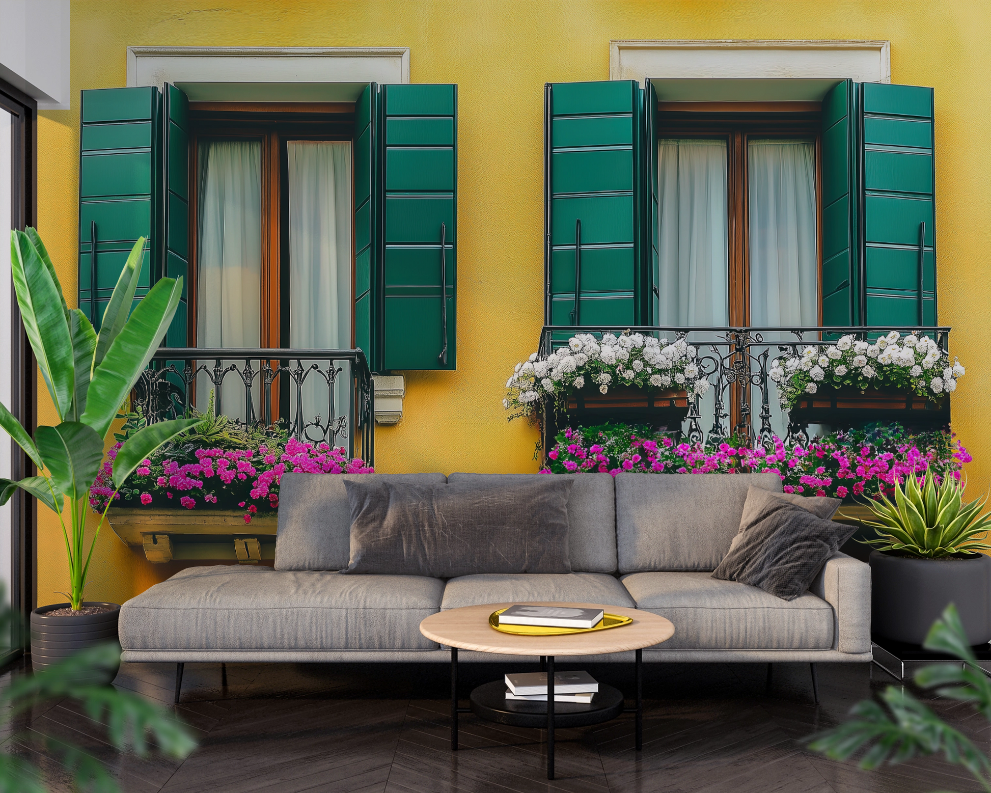 Two stylized old town windows with green shutters and flowering balconies glow against a sunny facade – like a captured summer day in Italy. The mural combines color, light, and atmosphere to create a backdrop full of joie de vivre, tranquility, and warmth. Whether as an accent in modern living concepts or as a charming detail in restaurants and reception areas – this motif brings a sense of southern style, style, and authenticity to any room.