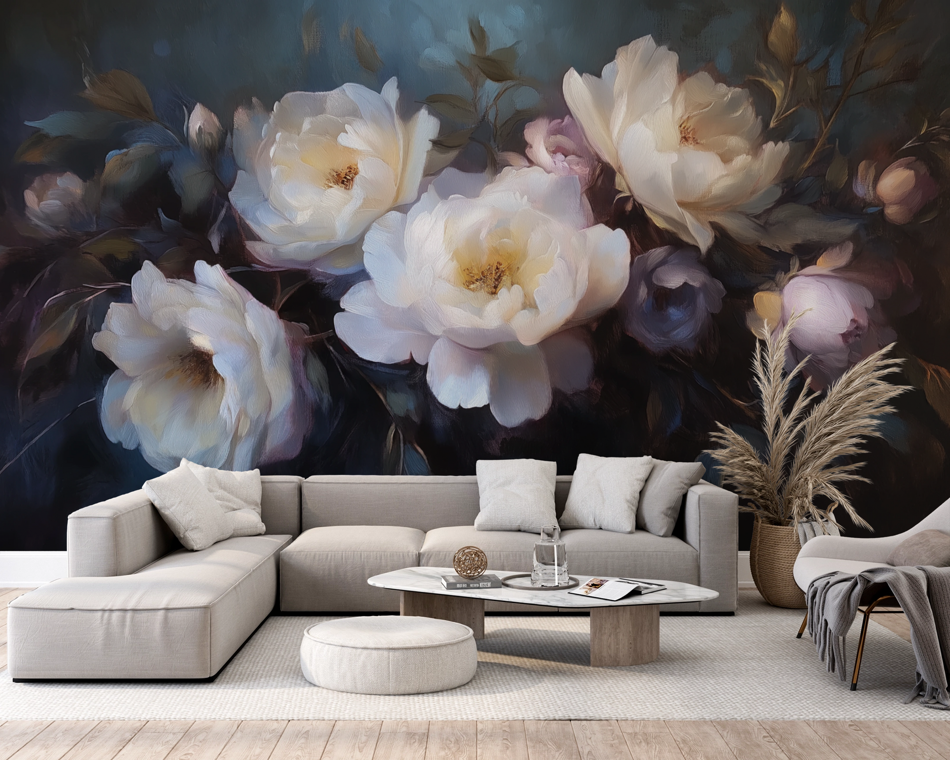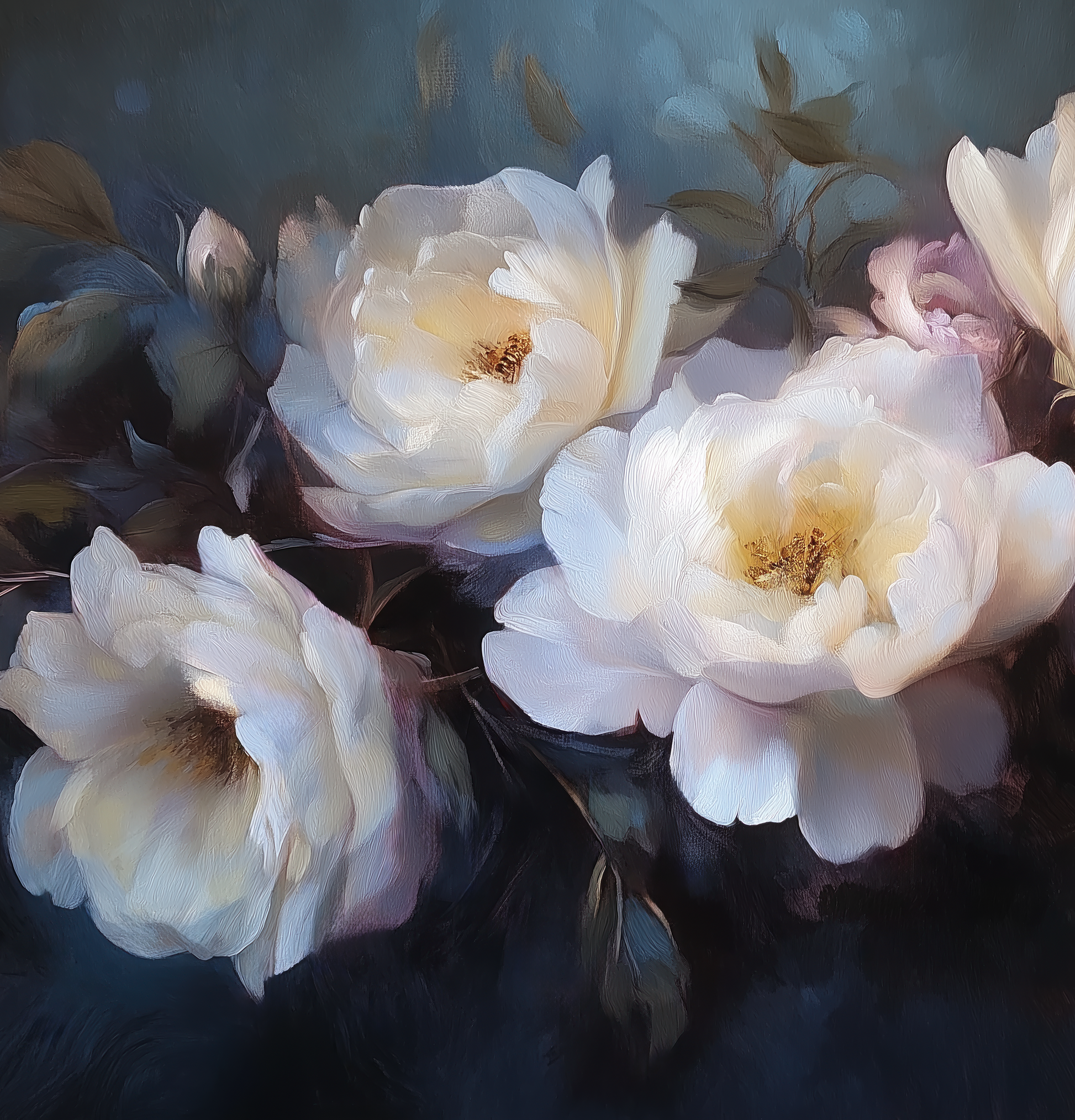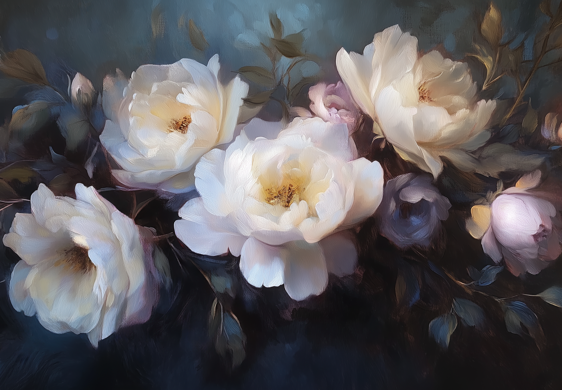 As if sprung from a baroque still life, "Velvet Bloom" unfolds its sensual effect in a rich interplay of dark depth and soft light. The creamy white blossoms with delicate rose and lavender shimmers glow mysteriously against the velvety background – a visual poem for lovers of classic elegance with a modern twist.