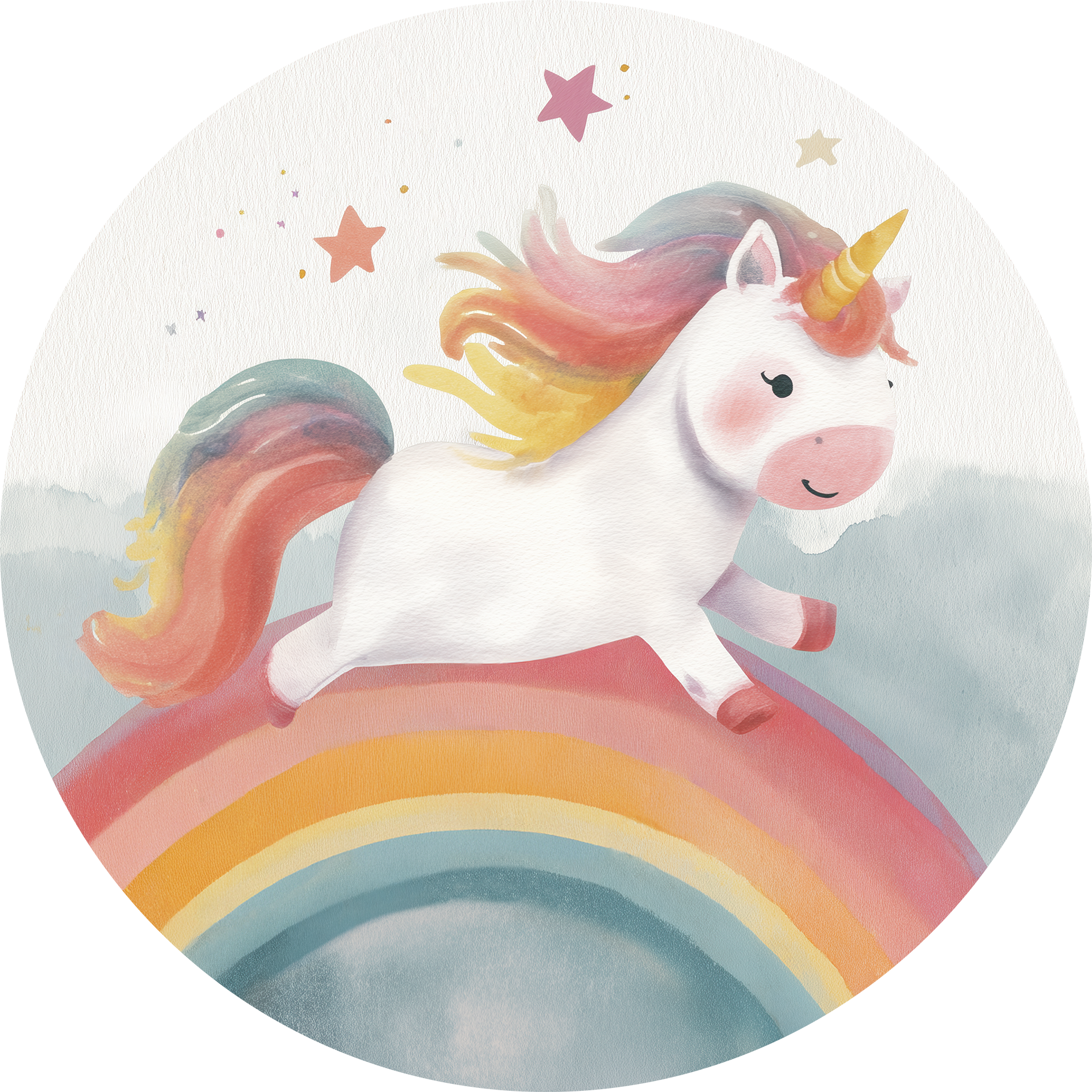 Ein fröhliches Einhorn galoppiert über einen bunten Regenbogen, umgeben von zarten Sternen und weichen Pastellfarben.