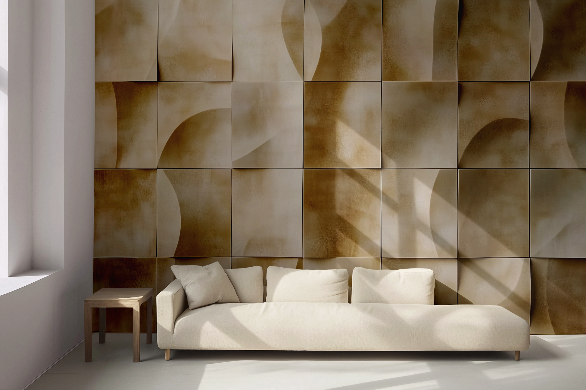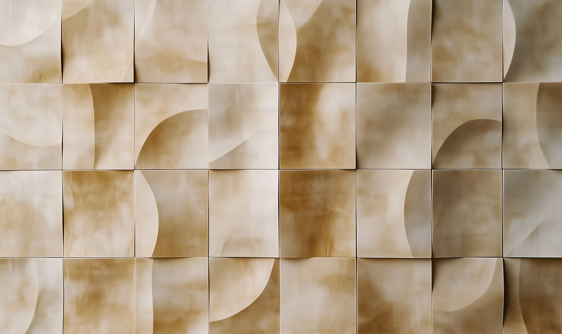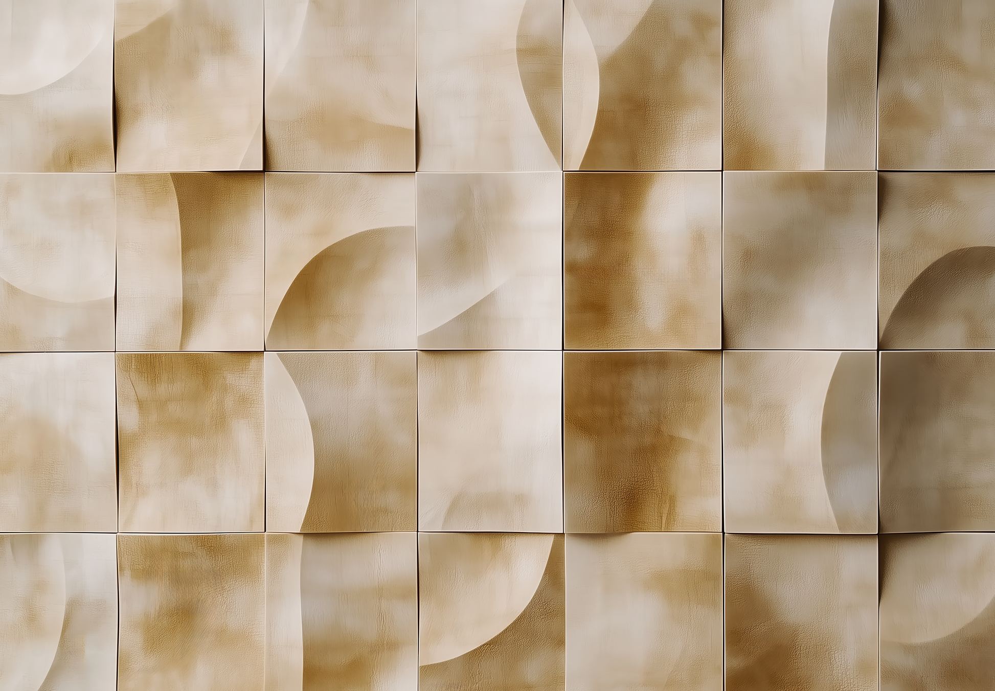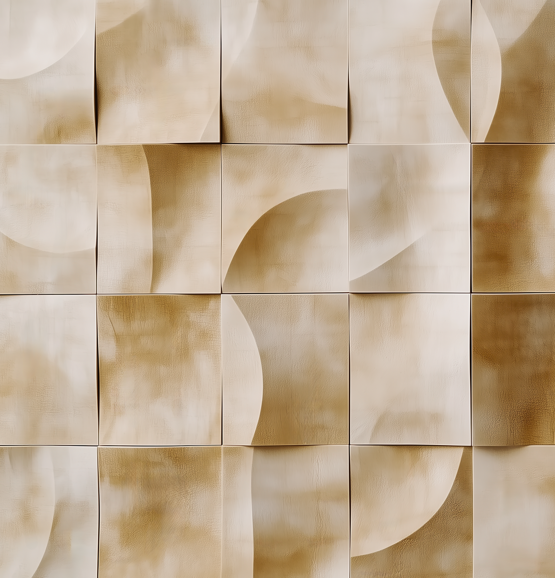 This wall motif combines soft sand tones with a sophisticated textured relief effect, whose geometric arrangement creates a calm, rhythmic effect. The gently curved shapes, sometimes flat, sometimes sculptural, evoke memories of dune landscapes, the play of light in Mediterranean architecture, or modern clay reliefs.