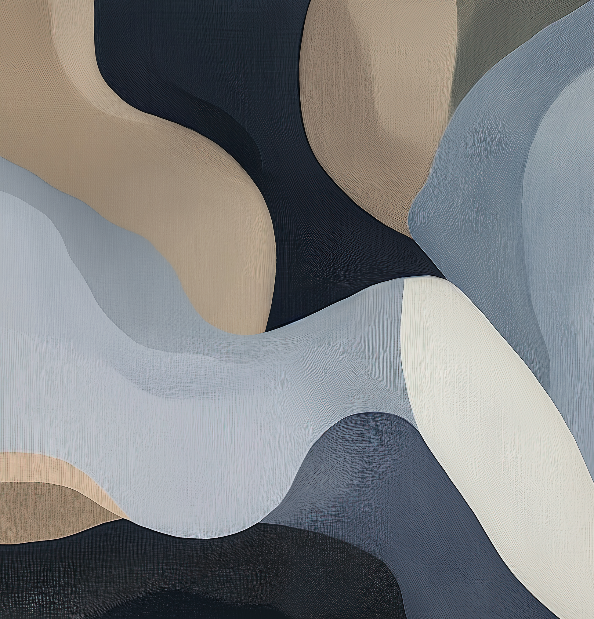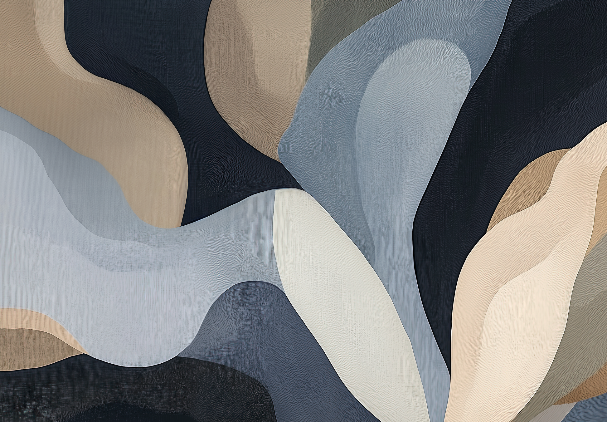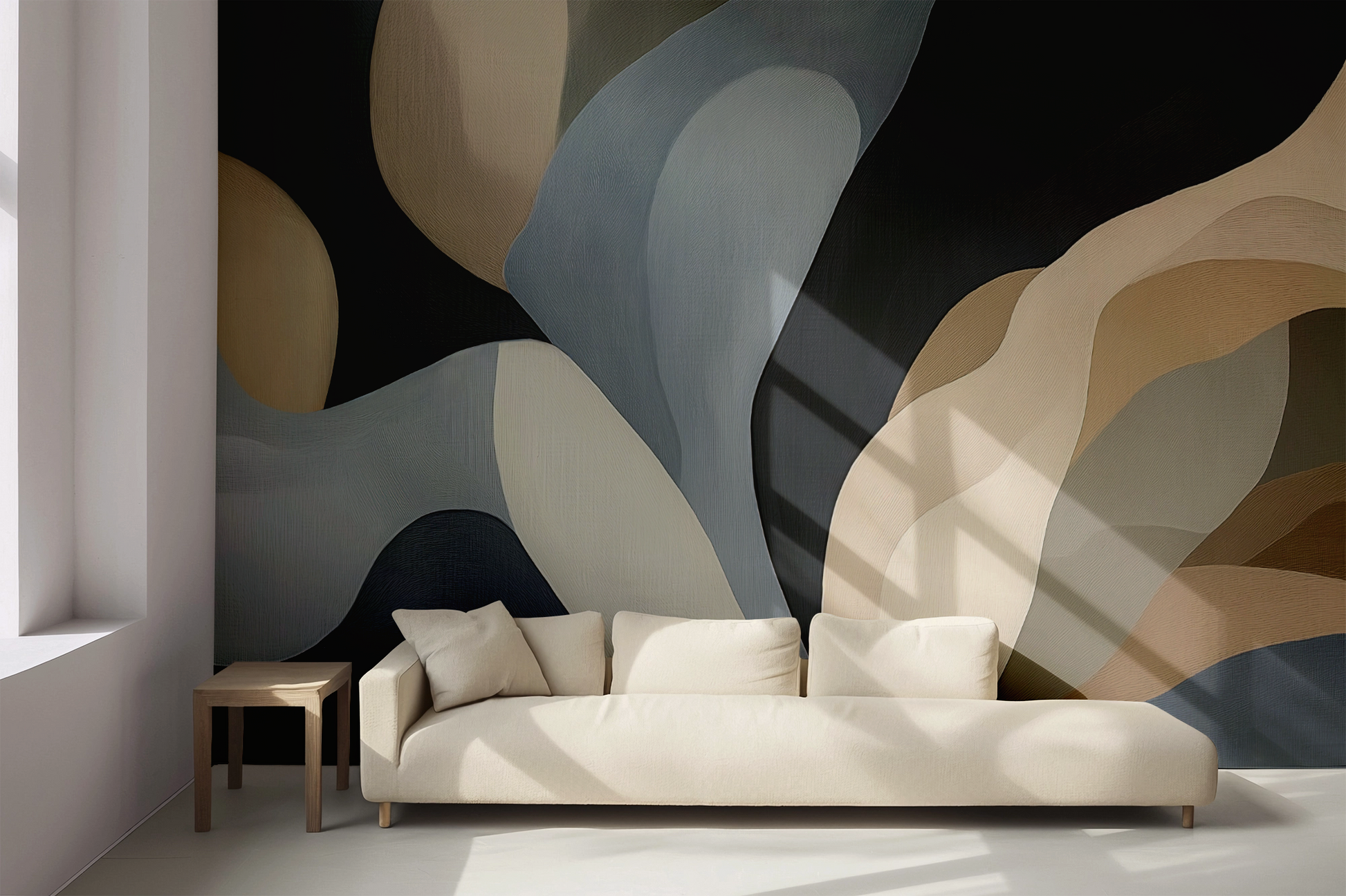 This modern wall design unfolds its effect through gently flowing forms and harmonious earth tones in beige, gray, blue, and cream. The abstract composition evokes landscapes of light and shadow, creating a calm, stylish atmosphere with artistic depth. The soft gradients and textured surface lend the motif a textile, almost hand-painted feel.