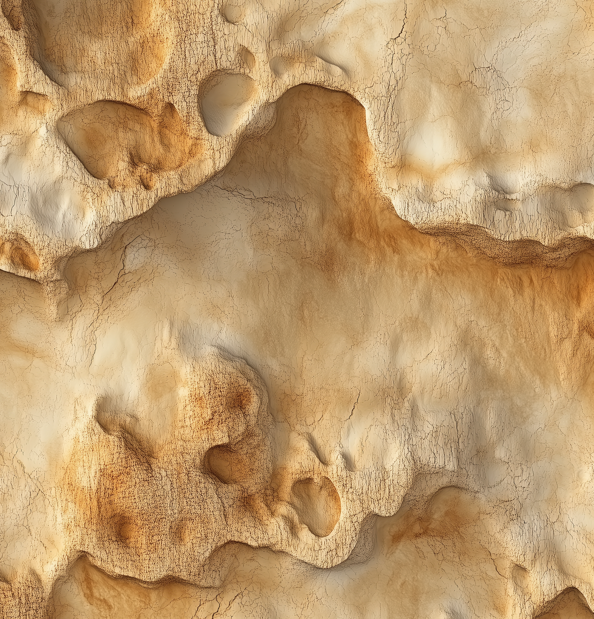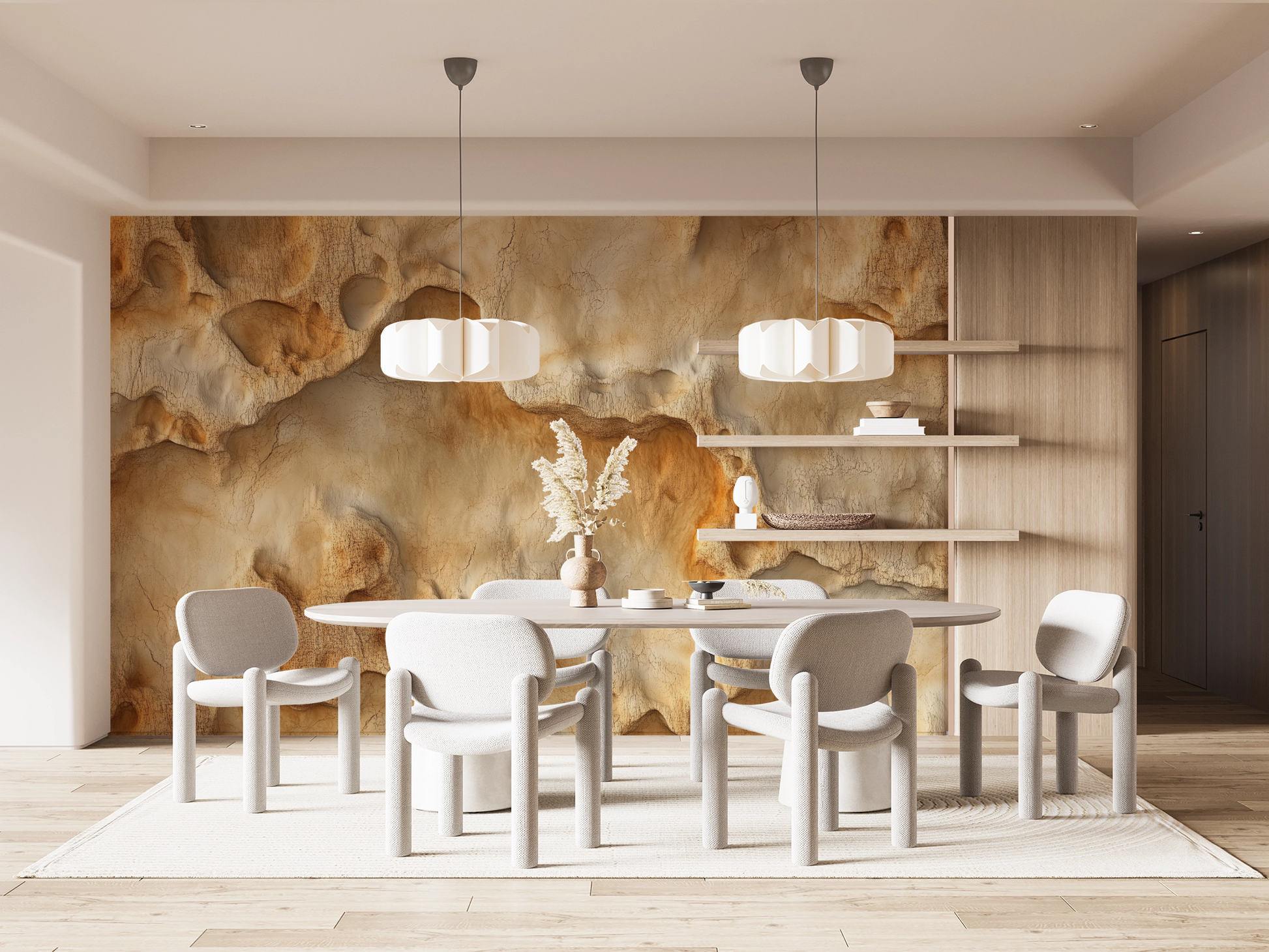Fossile Forme is a self-adhesive designer wallpaper that feels like a geological journey through time – inspired by eroded rock layers, fossil structures, and the natural patina of weathered rock faces. This motif brings archaic depth and earthy elegance to modern interior concepts. The surface appears shaped by wind, water, and time: fine cracks, mineral inclusions, and a relief-like texture convey the impression of a naturally grown mural. Warm beige tones, chalky transitions, and subtle ochre accents create an atmosphere that is both grounded and expressive. Fossile Forme is ideal for spa zones, urban retreats, or minimalist living spaces. The wallpaper brings calm, a sculptural effect, and a sense of primal power – without being loud.