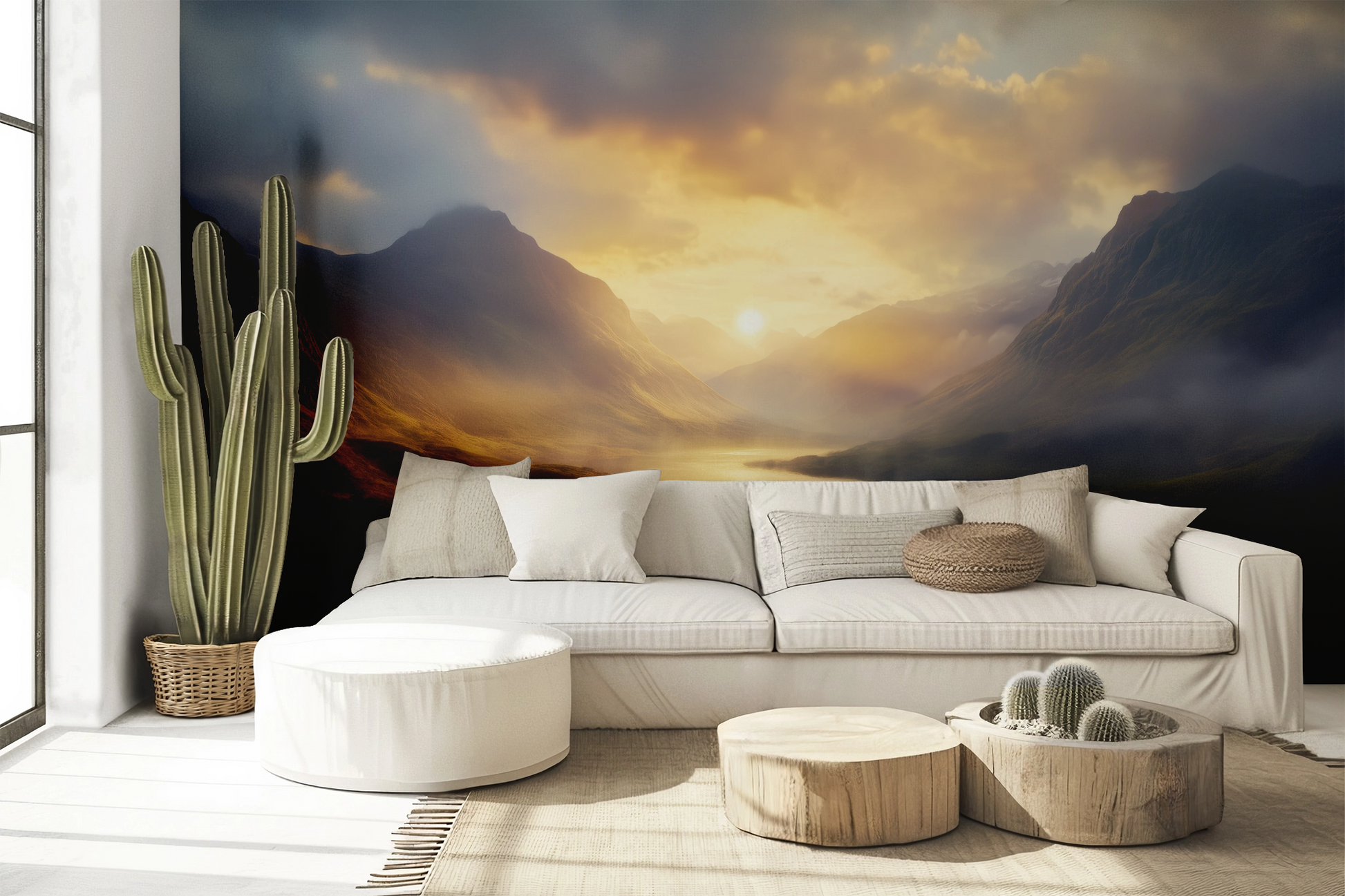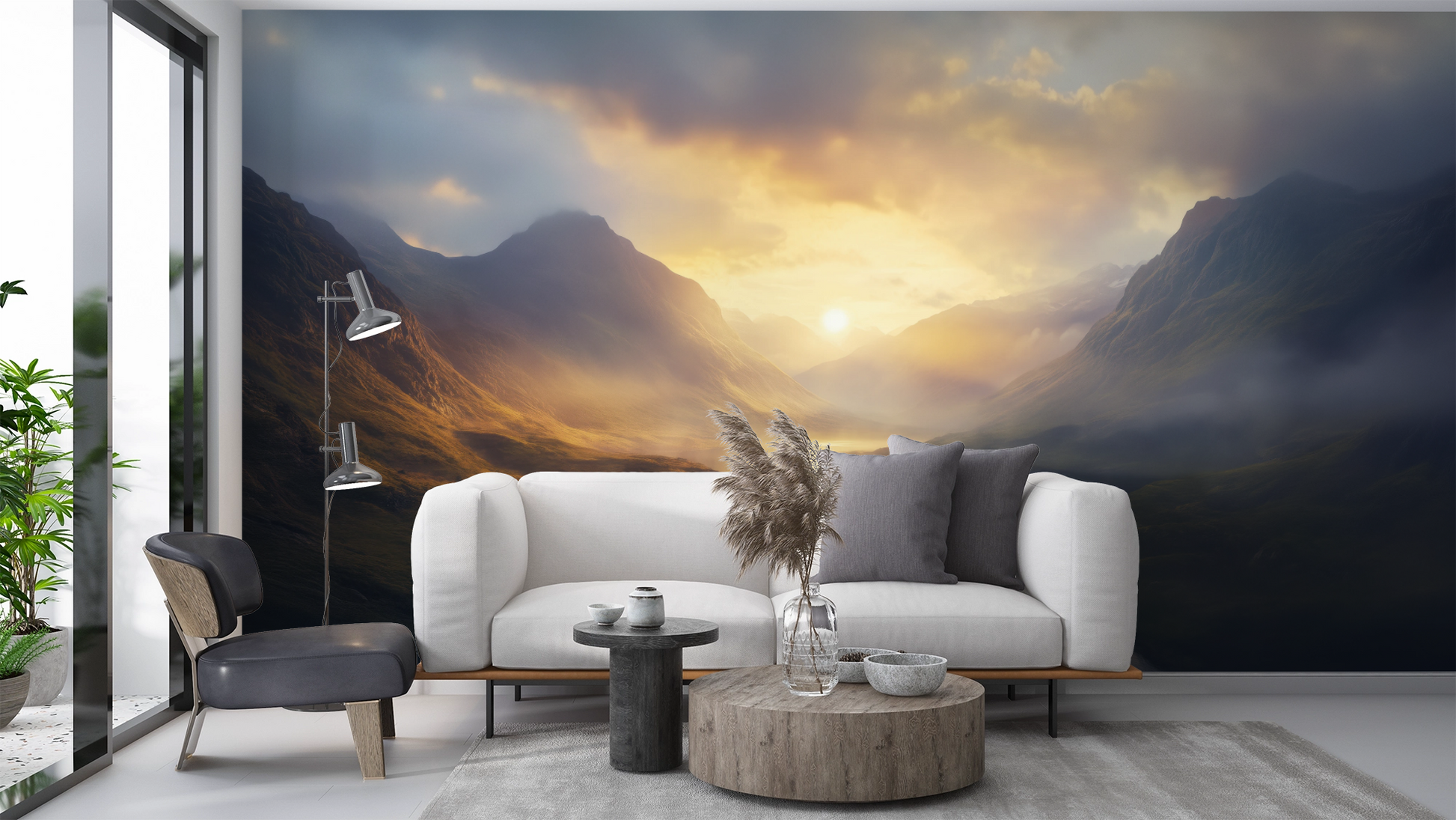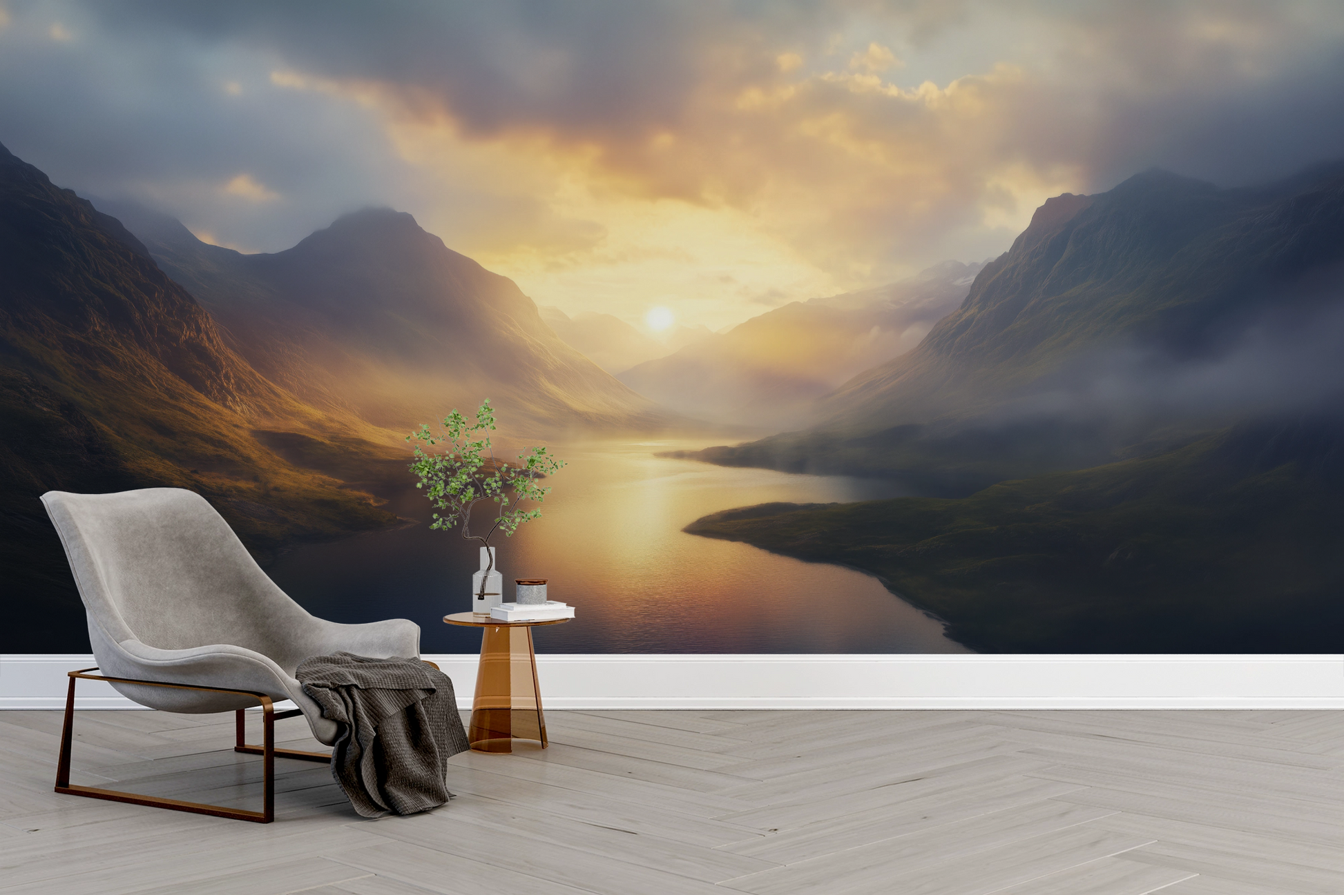 Golden Fjord is a self-adhesive digital wallpaper that brings tranquility, depth, and natural expanse to any room. The panorama depicts a tranquil mountain lake in the warm evening light, surrounded by majestic mountains, gentle mist, and golden reflections on the water. The harmonious color scheme of soft blue, misty gray, and warm gold creates a meditative spatial effect—like a quiet moment amidst untouched nature. Golden Fjord is perfect for bedrooms, living rooms, reading areas, or spa zones where an atmosphere of serenity and grounding is desired. Thanks to the self-adhesive backing, the wallpaper can be applied easily, bubble-free, and without paste—for a calm, powerful interior design with a sense of depth.