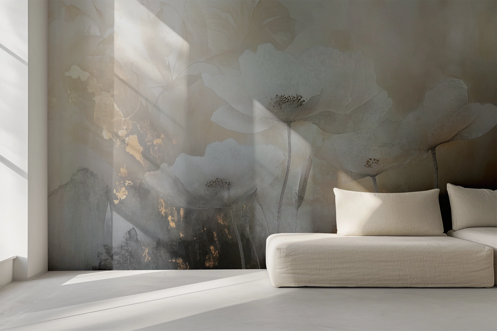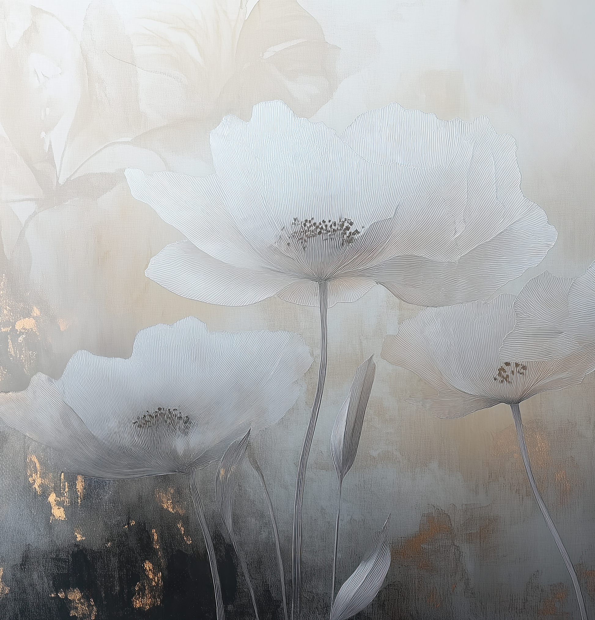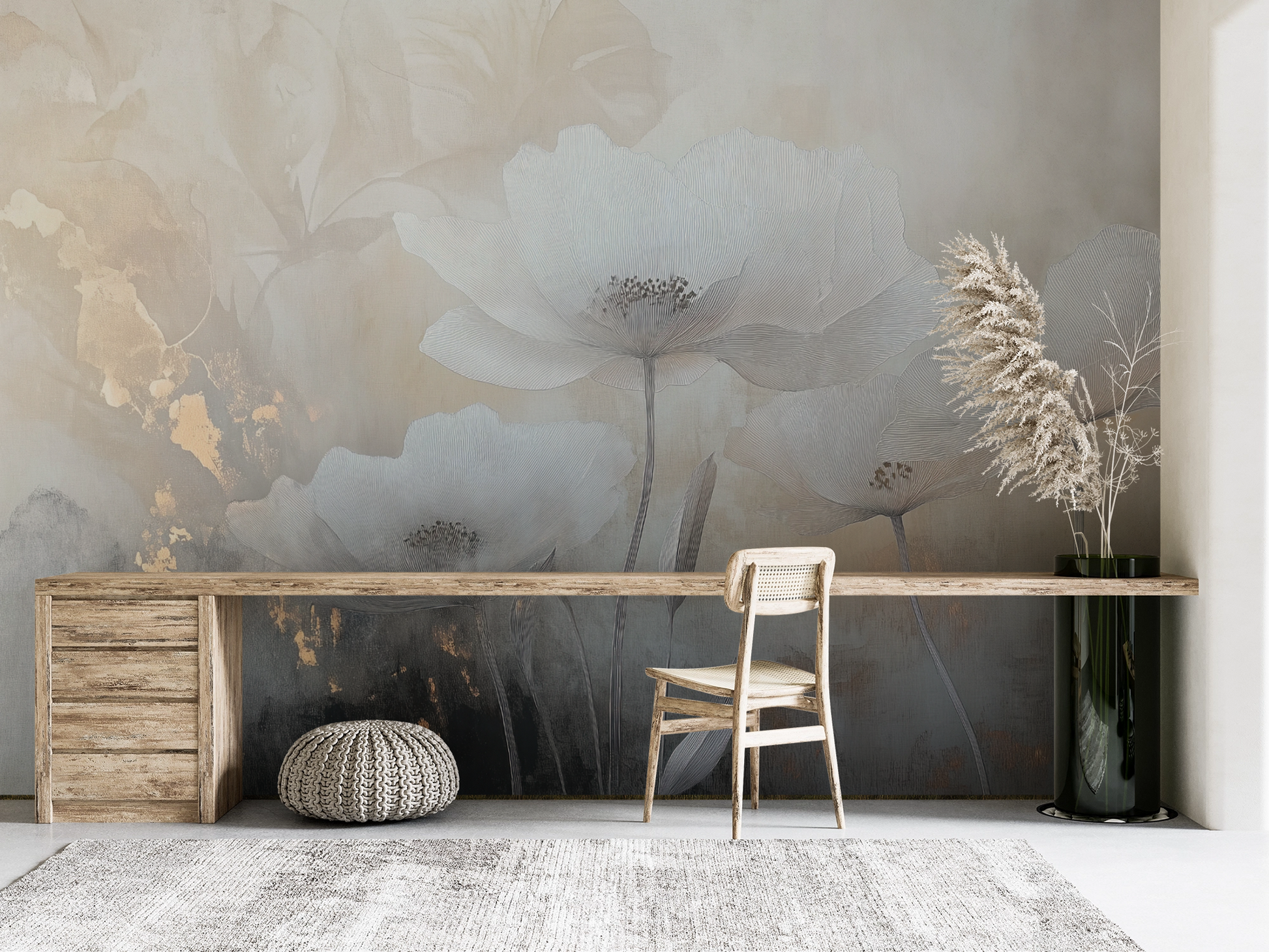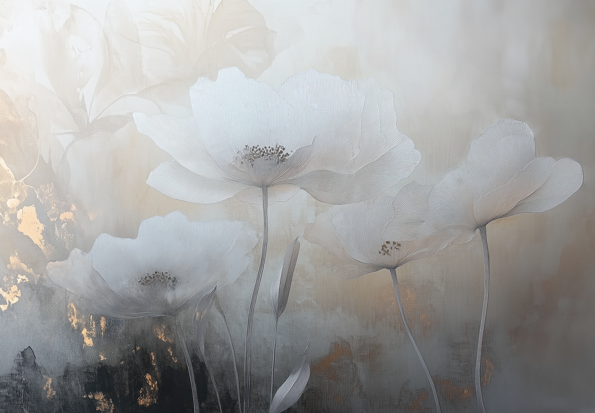 This elegant floral wallpaper combines the delicacy of floral patterning with the subtle elegance of metallic highlights. Delicate blossoms in natural white float on a cloudy background of creamy taupe, silvery mist, and soft rose. Fine golden details lend the design a luxurious depth – like sunbeams touching delicate petals at dawn. Silent Bloom is poetic, understated, and yet modern. This stylish mural is perfectly suited to tranquil living spaces, elegant bedrooms, or minimalist entrance areas. The wallpaper blends particularly beautifully with natural materials such as oak, linen, stone, or matte silver accessories – creating a stylish, warm, and calming atmosphere. Printed on self-adhesive material, the design is easy to apply – no paste or effort required. Ideal for modern interior concepts with high aesthetic and quality standards.