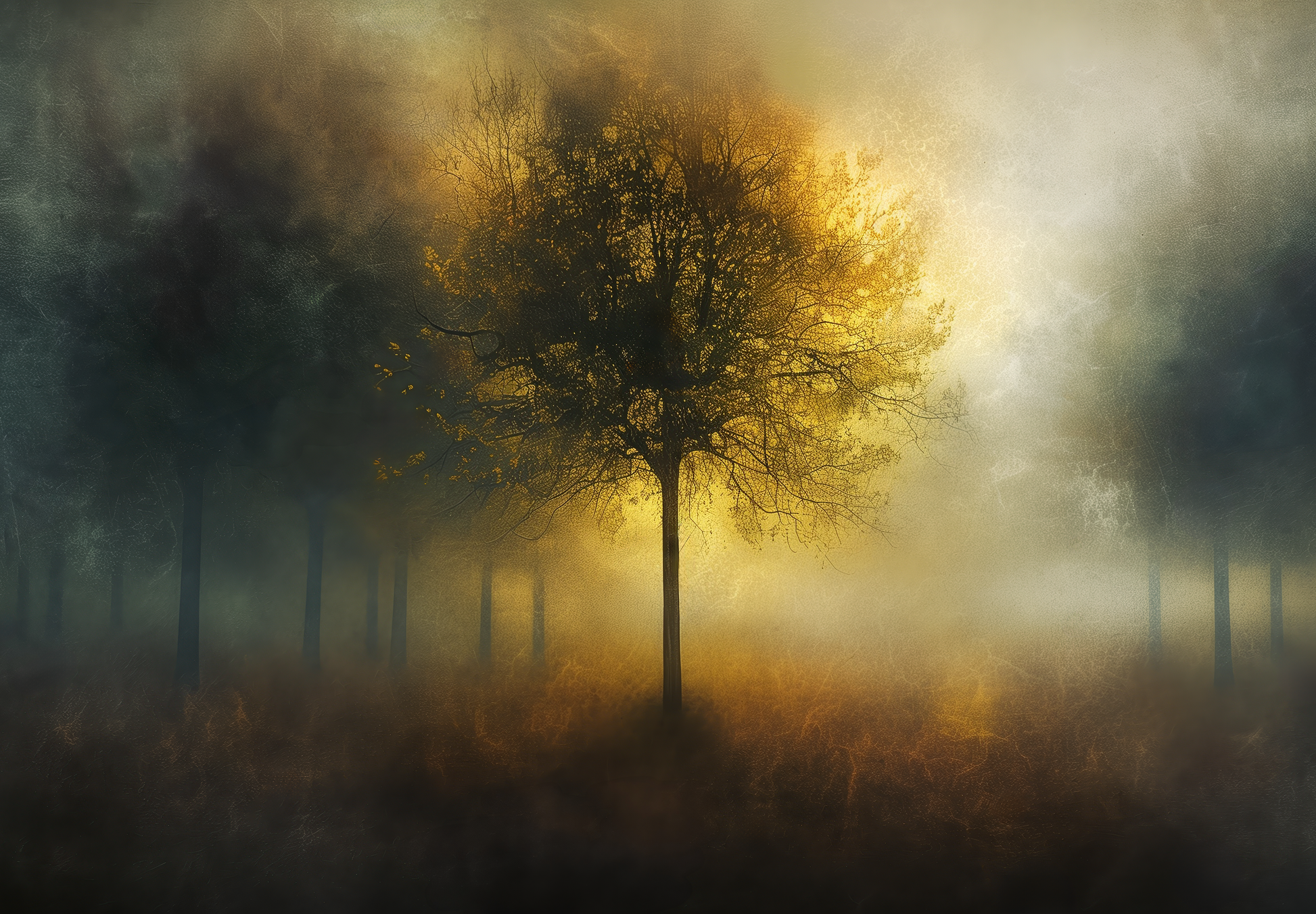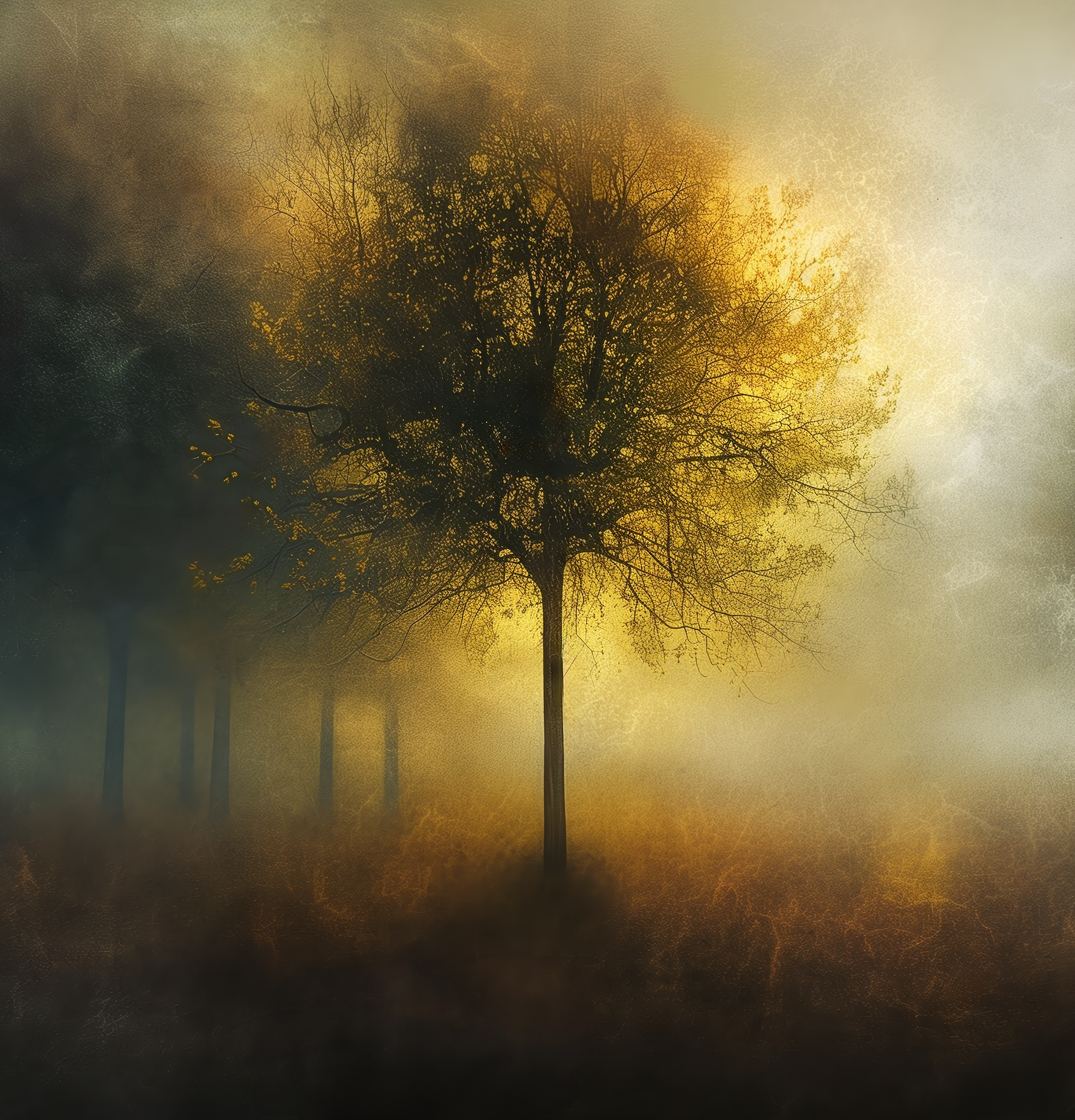 A single tree stands at the center of a mystical forest, bathed in golden light that gently drifts through the mist. The composition radiates calm, depth, and an almost spiritual power.