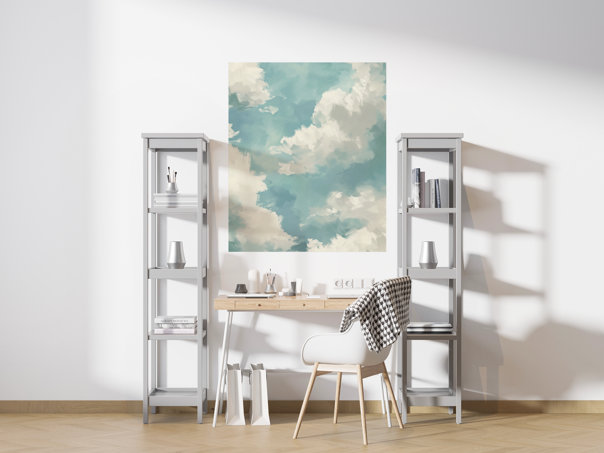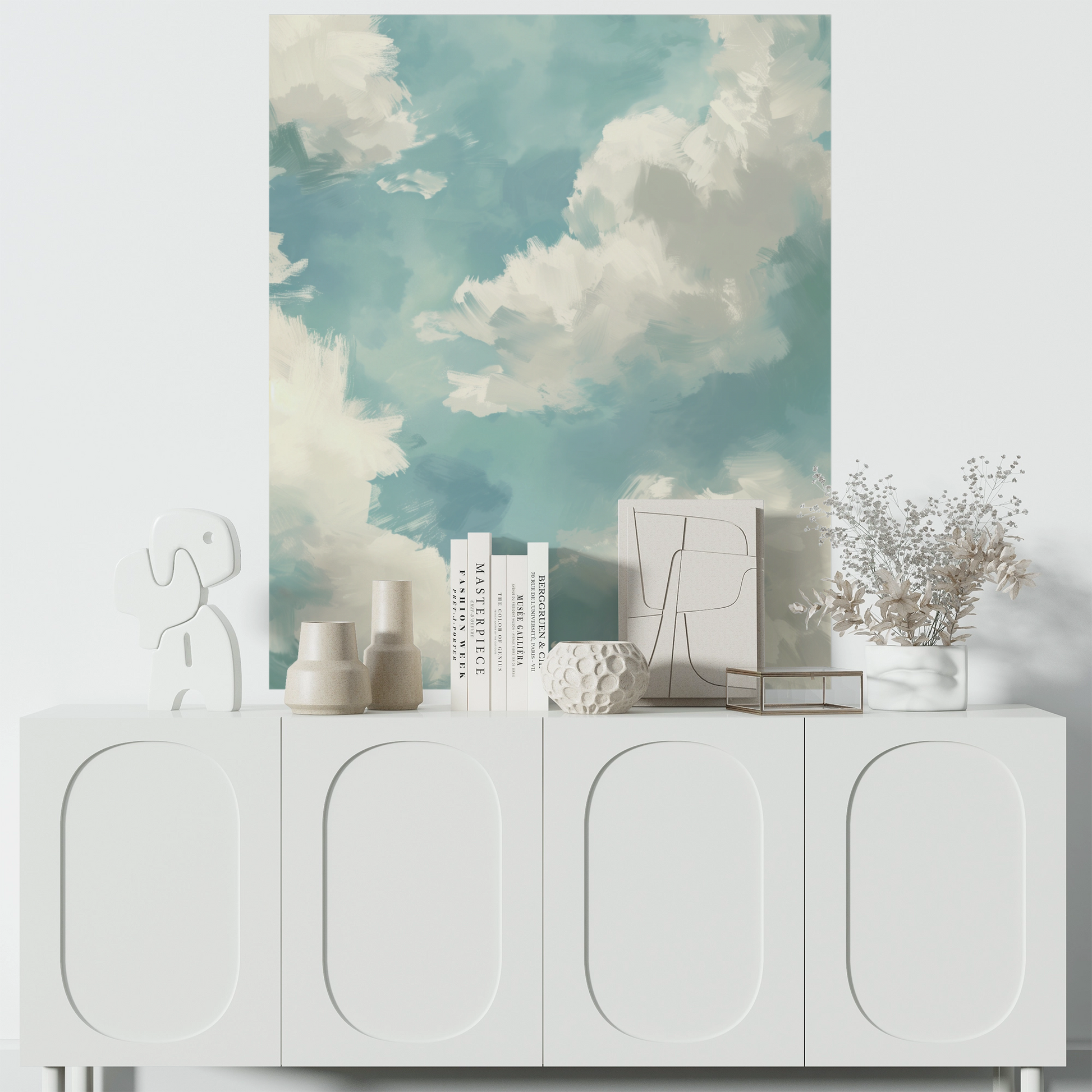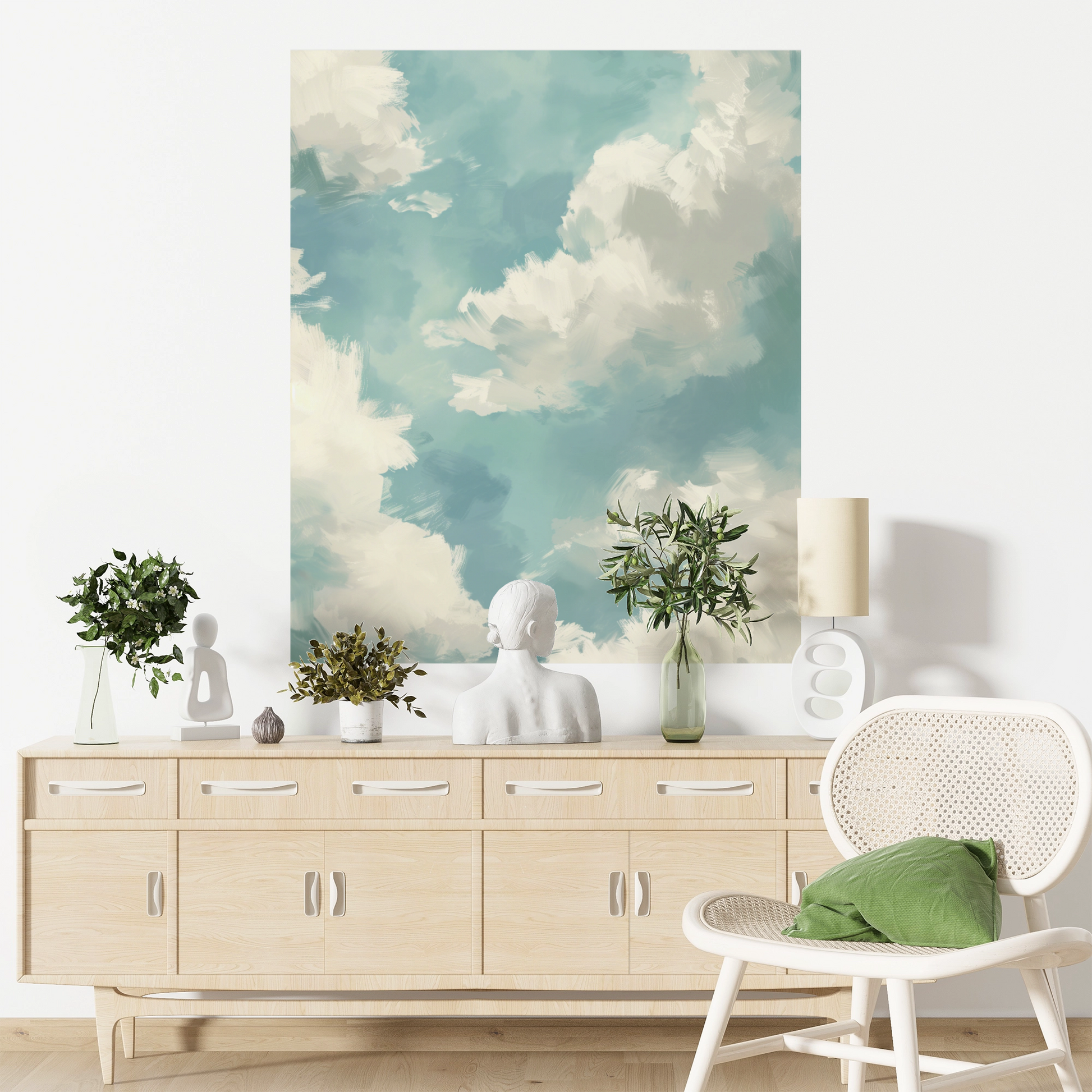 Airplay captures the lightness of a cloudy summer day. Loosely placed, pastel-colored brushstrokes create a cloudy sky image that hovers between dream and reality. The watercolor-like rendering in soft blue and cream tones lends the motif a calming depth and invites contemplation. This self-adhesive digital wallpaper in portrait format is ideal as a standalone decorative piece—ideal for living rooms, bedrooms, or creative corners. Airplay brings expansiveness, light, and a poetic atmosphere to any room.