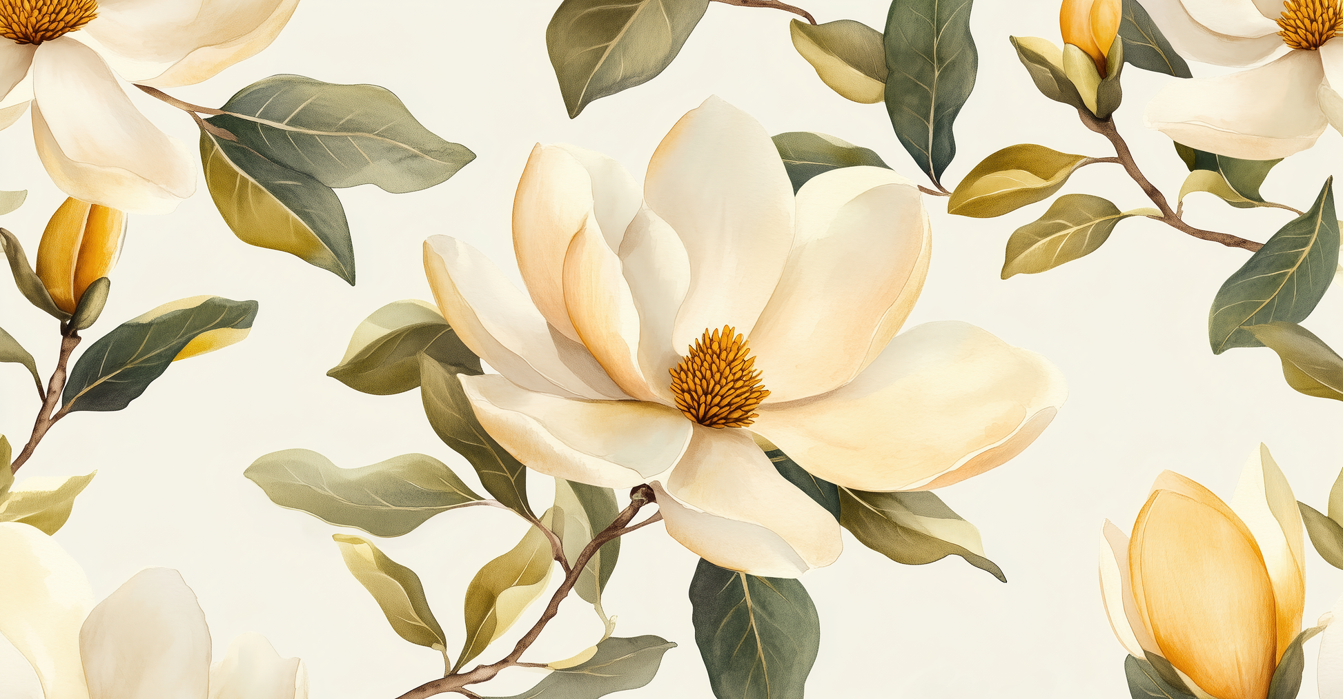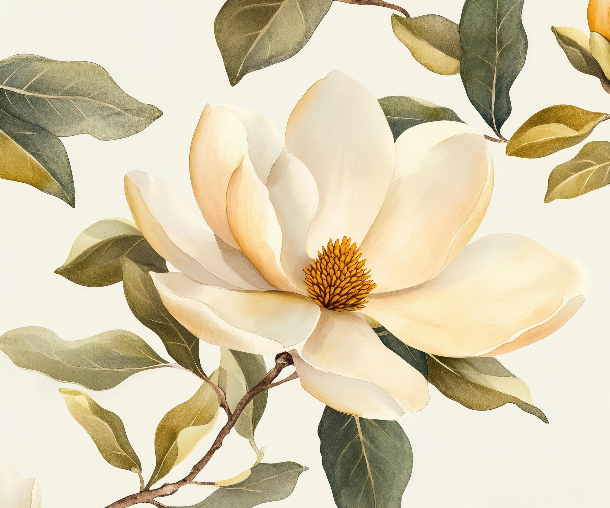 • Motif: large, cream-white magnolia blossoms in watercolor style