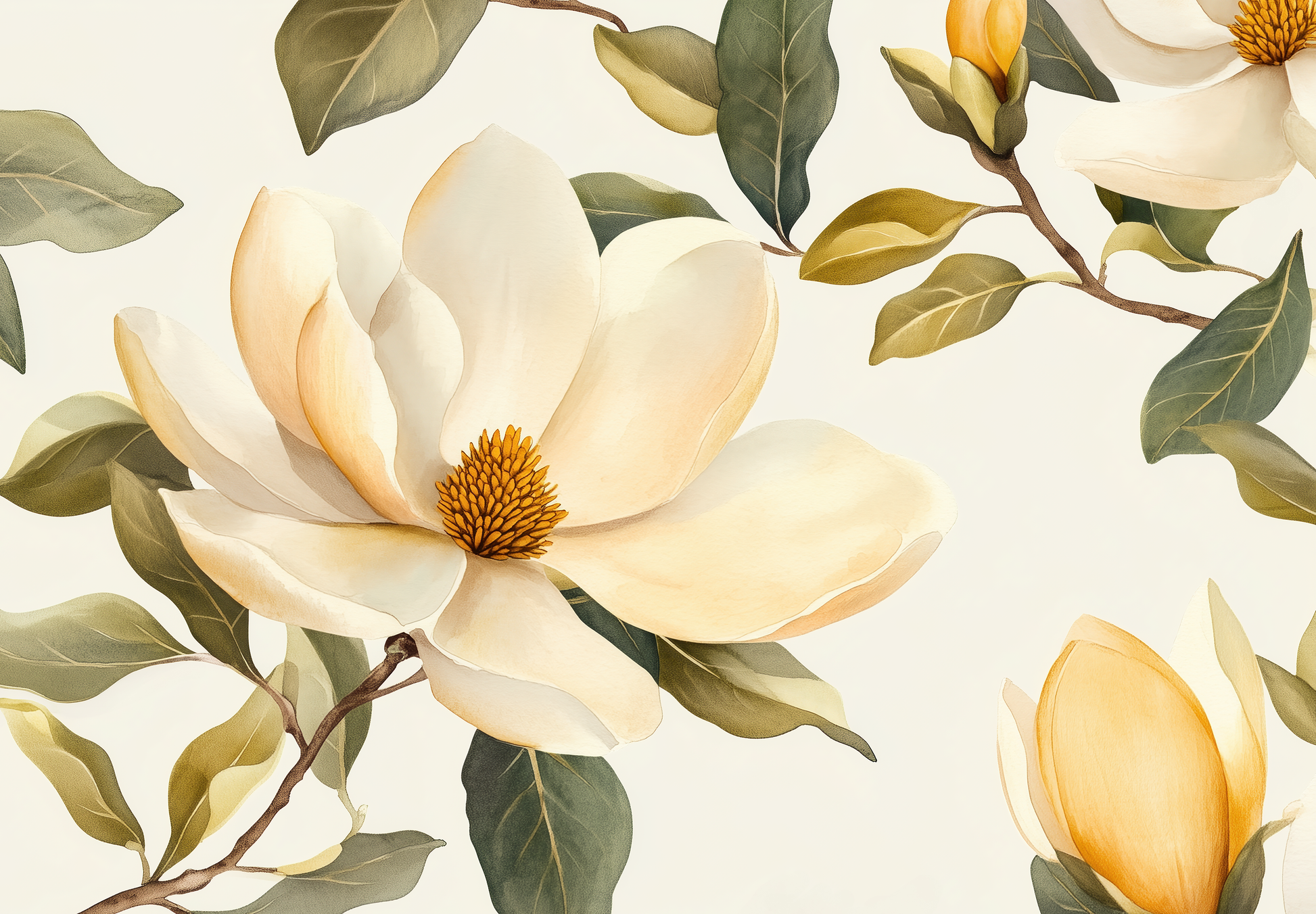 "Magnolia Grace" brings the quiet poetry of nature directly to the wall. The artfully watercolored magnolias unfold with delicate grace and luxurious restraint. The harmonious color scheme of soft cream, warm golden beige, and muted green tones exudes calm, clarity, and style. This digital wallpaper is ideal for rooms demanding elegance and refinement—whether as an eye-catcher in a modern interior or as a harmonious companion to classic living concepts. The gentle blossoms make a floral statement without being obtrusive and blend seamlessly into calm, natural color schemes. Perfectly combined with linen fabrics, light wood furniture, or gold accents—for an overall look that is both calming and sophisticated.