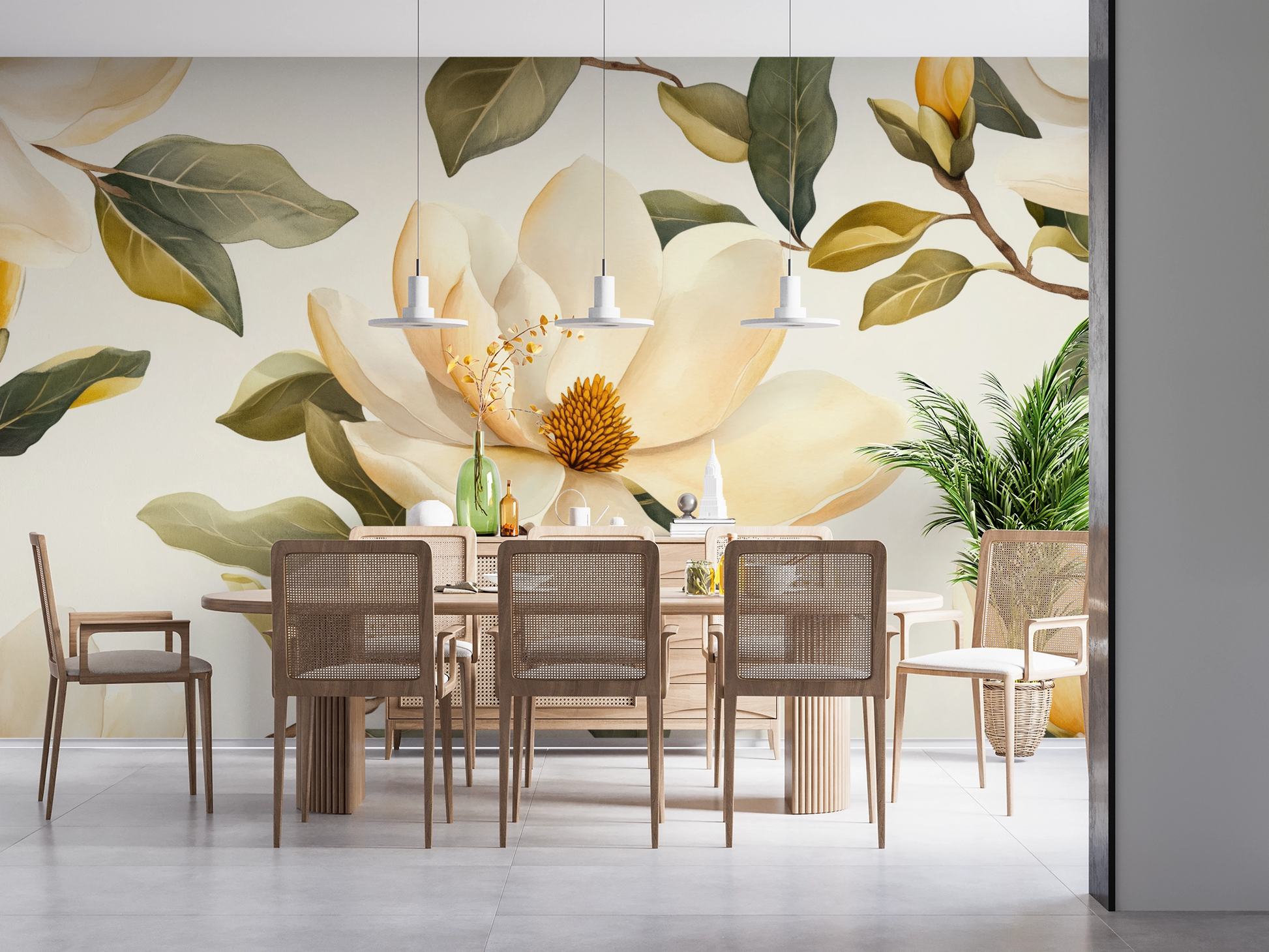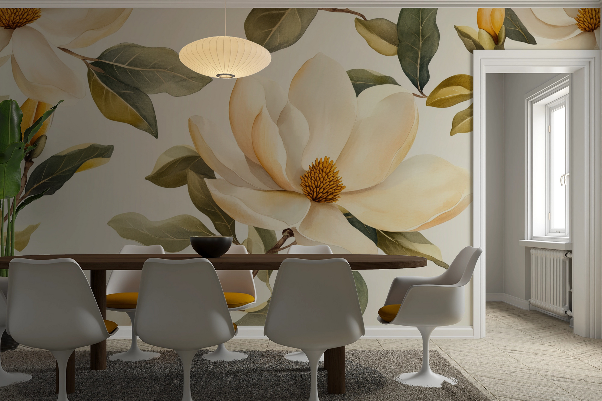 Magnolia Grace – Self-adhesive digital wallpaper with large-format magnolias in cream, gold, and olive green