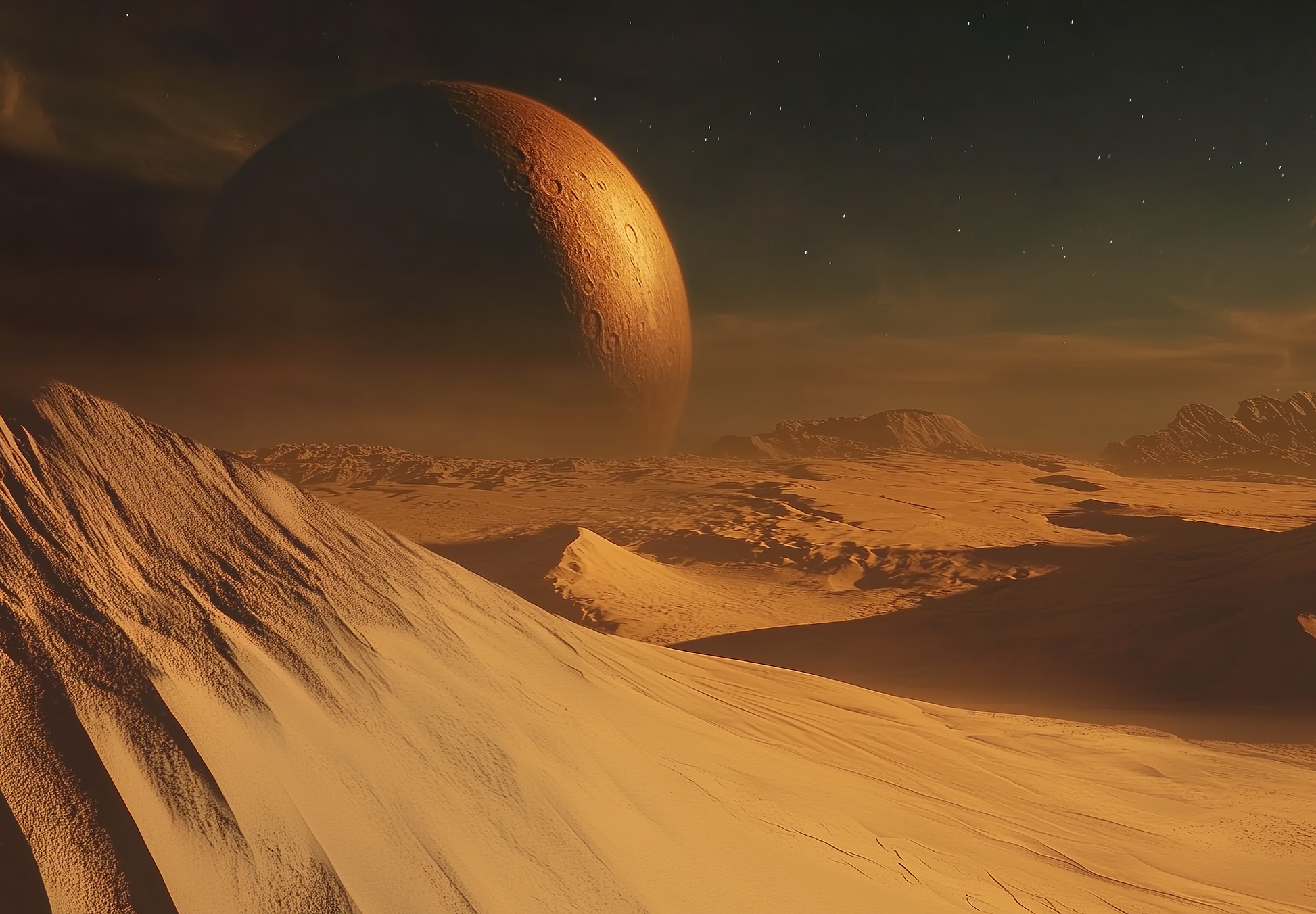 "Mars Light" is a visual adventure for the wall: A futuristic desert landscape, bathed in warm copper light, opens the view into another world – somewhere between science fiction, the power of nature, and meditative silence. The soft dune structures, combined with the deep reddish-brown of a distant celestial body, create an atmosphere of deceleration and expansiveness. This digital wallpaper is ideal for those who aren't satisfied with the ordinary – perfect for modern living spaces, creative work environments, boutique hotels, or studios with bold vision. A true statement of forward-thinking, design awareness, and aesthetic strength.