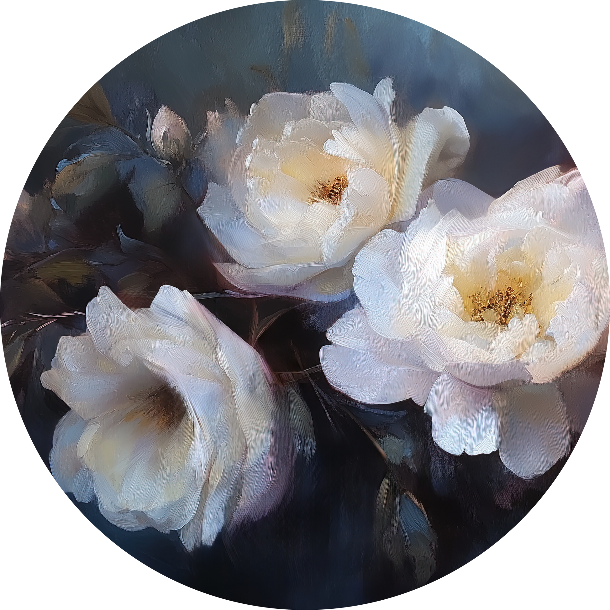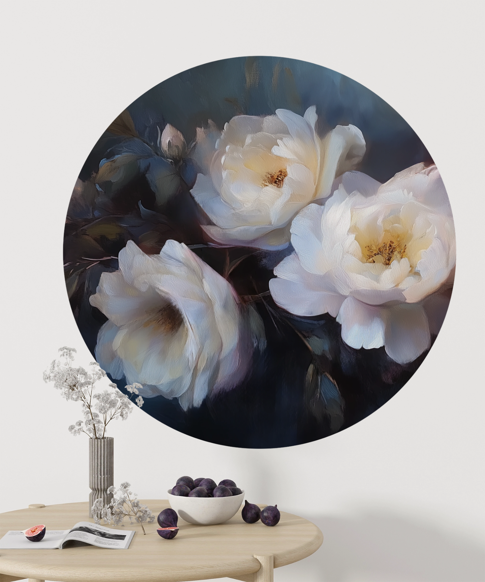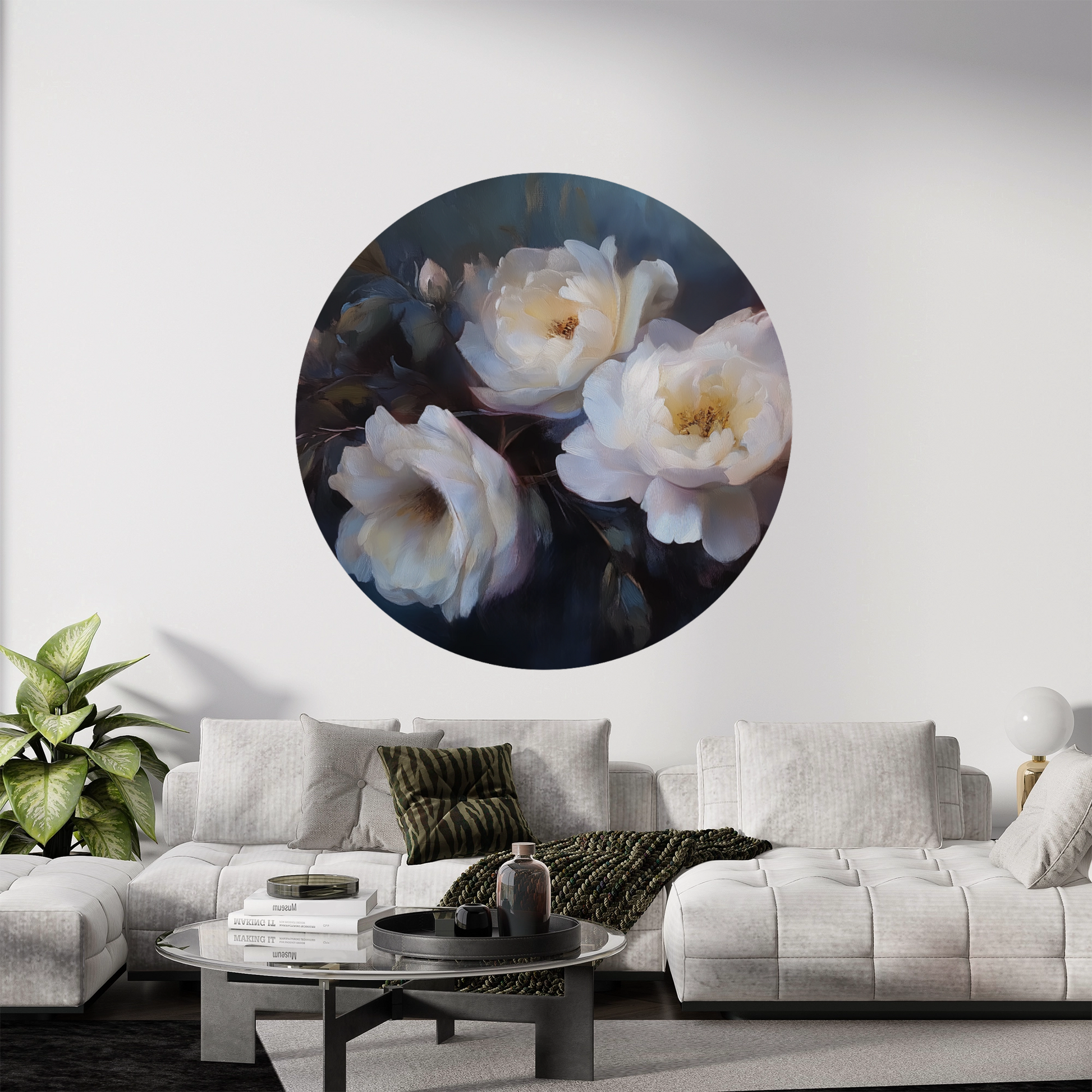 Softly lit white blossoms unfold against a dark, velvety background like luminous dreams in the night. This floral-romantic design is reminiscent of a classic still life and brings an elegant, almost mystical atmosphere to any room. The meticulously detailed depiction of the roses and buds lends the motif depth and a touch of nostalgic nobility – ideal for rooms with character where aesthetics and tranquility go hand in hand. Perfect for bedrooms, boutiques, reading lounges, or as an artistic highlight in modern interiors with a vintage flair. Round mural (Dot) – self-adhesive, circular.