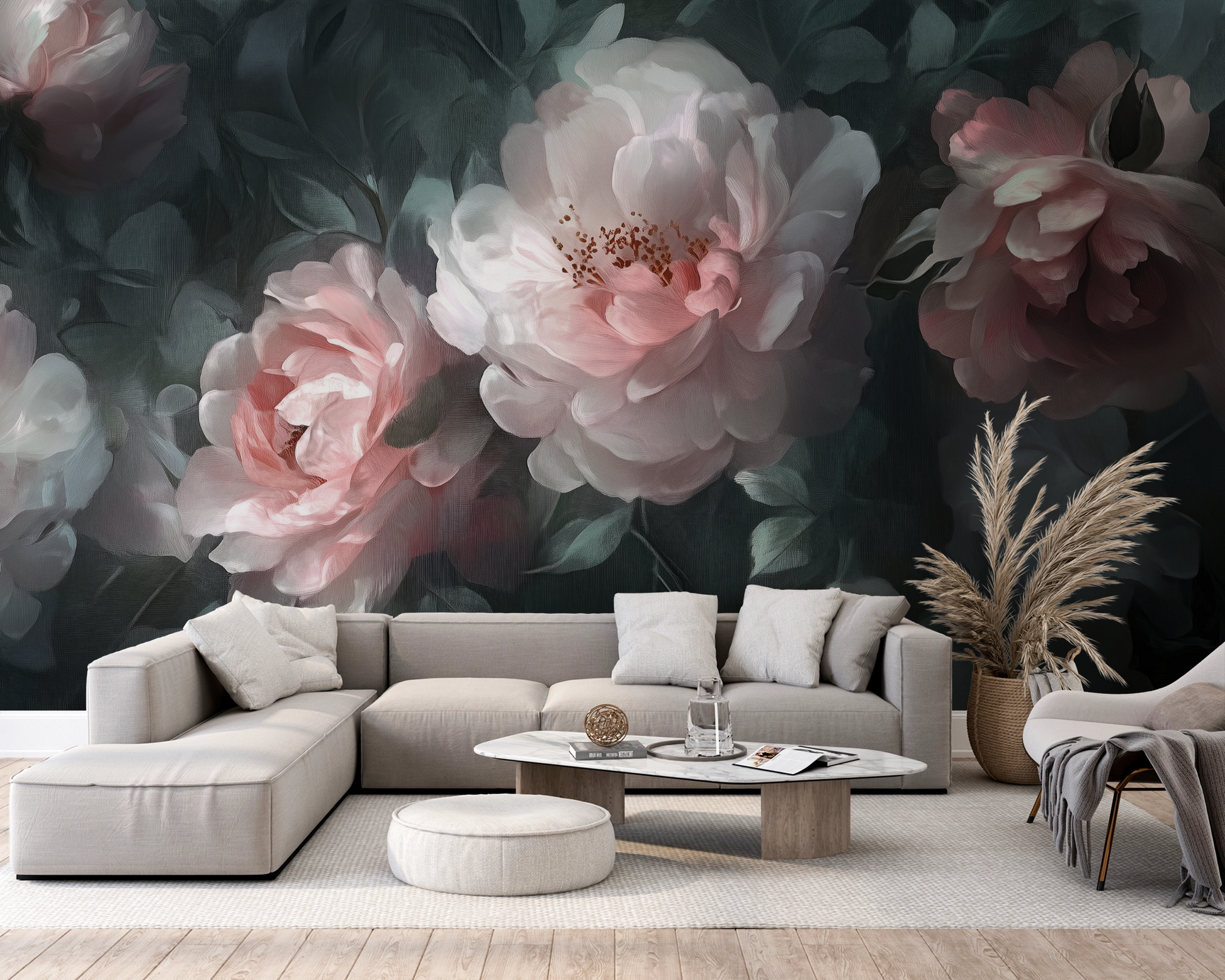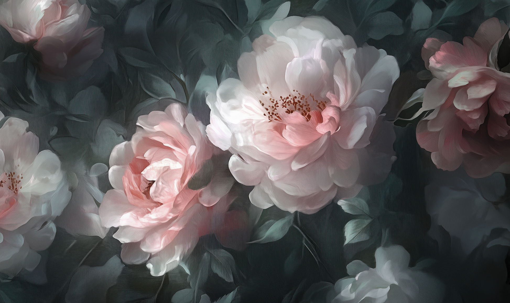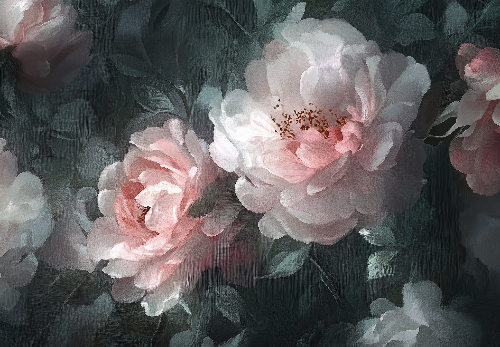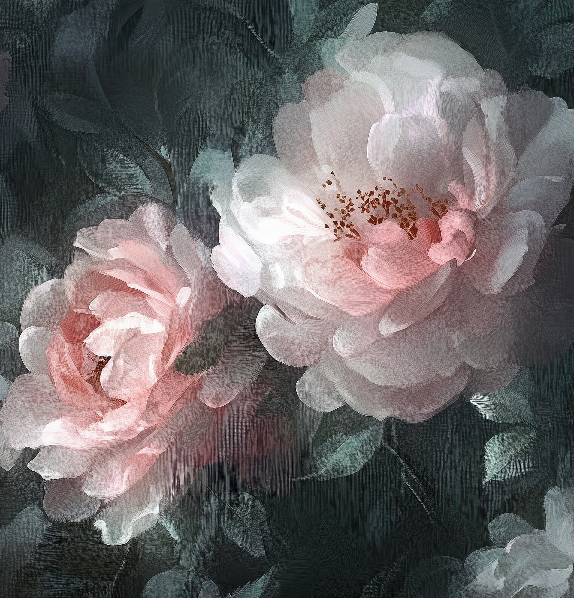 The design invites you into a tranquil garden moment, captured in the transition between day and night. The delicate, pastel peony blossoms appear like luminous souls in this composition, embedded in mysterious, dark foliage that conveys depth, protection, and tranquility.
