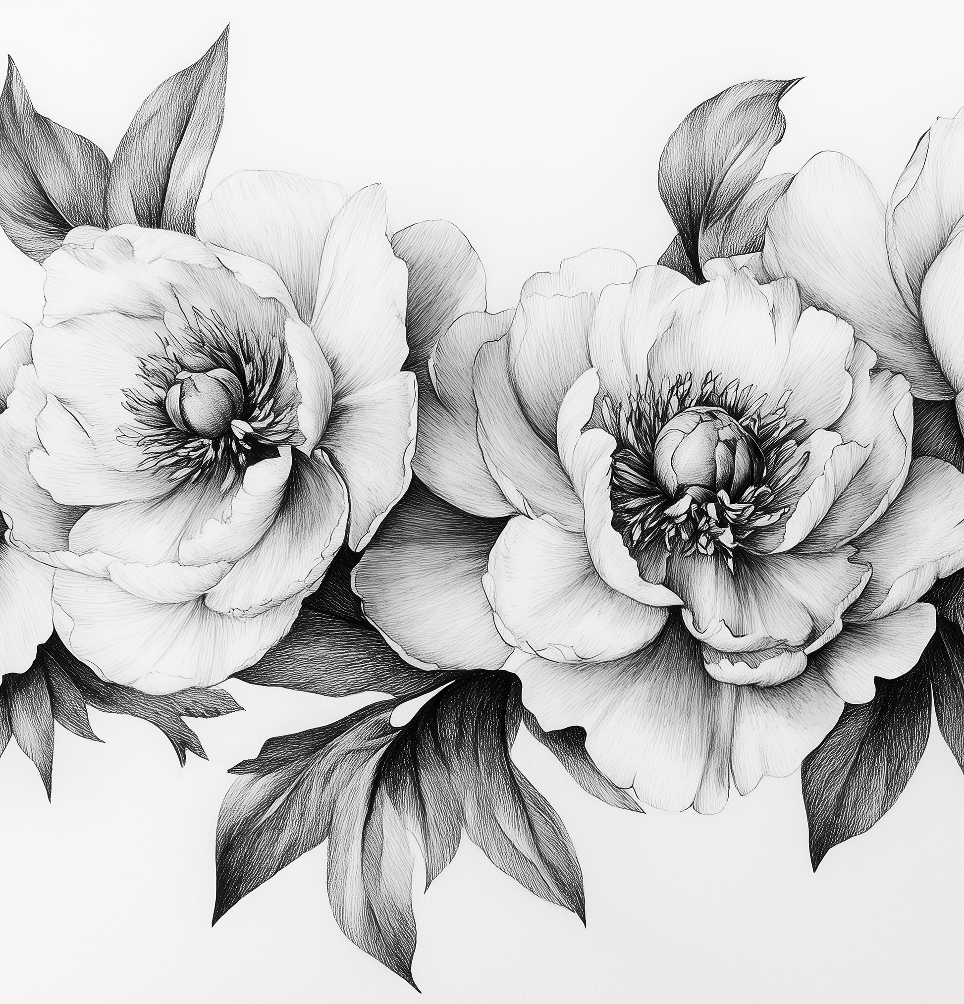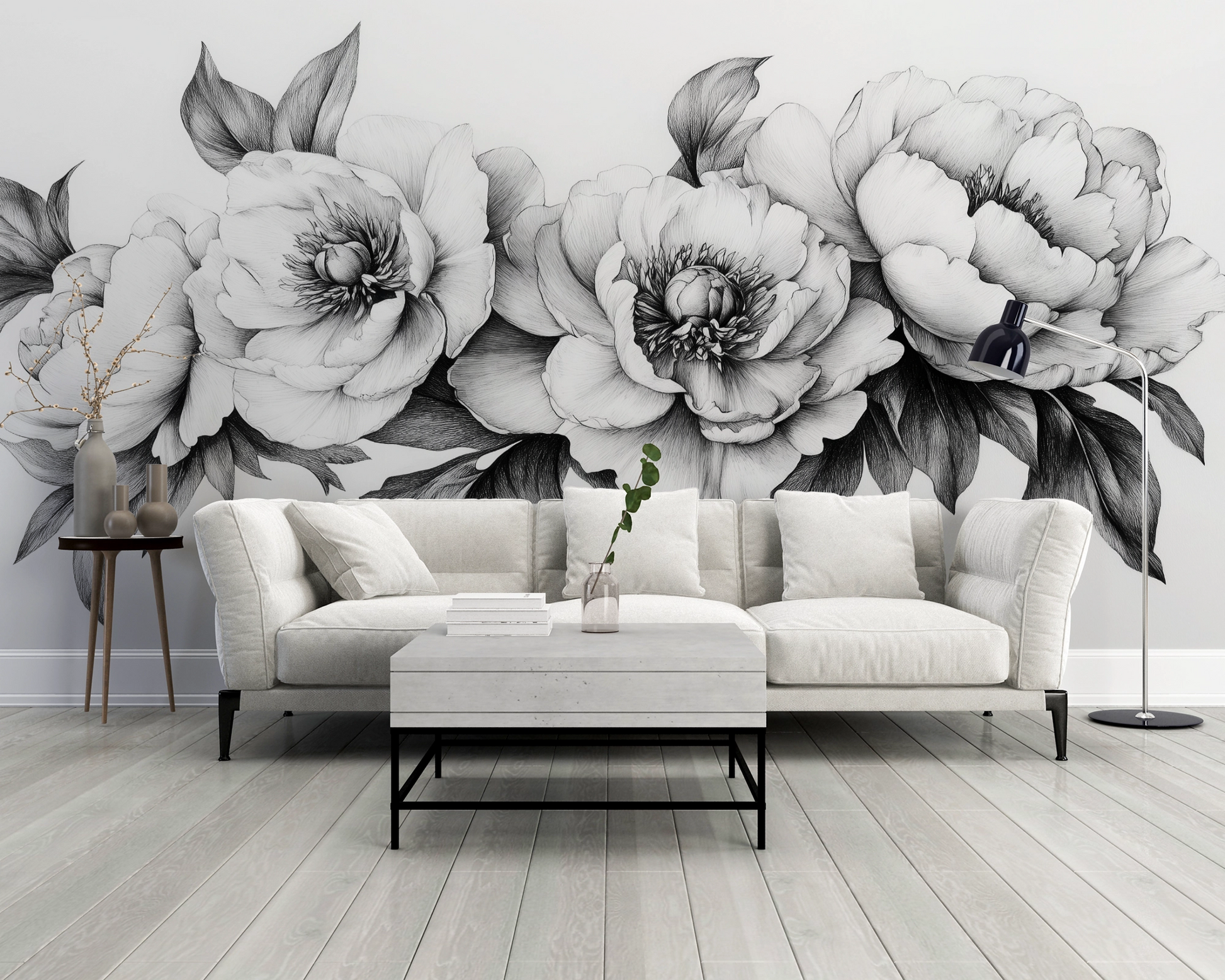 This delicate floral illustration showcases the beauty of the peony in its purest form. Reduced to black and white, its effect unfolds through precise lines, soft shading, and harmonious balance. Its minimalist appeal makes this design a timeless highlight – both for modern interiors and rooms with an artistic flair. Whether as an accent wall in the living room, a tranquil haven in the bedroom, or a stylish statement in the home office – "Flora Noir" combines nature and aesthetics in an inspiring way.