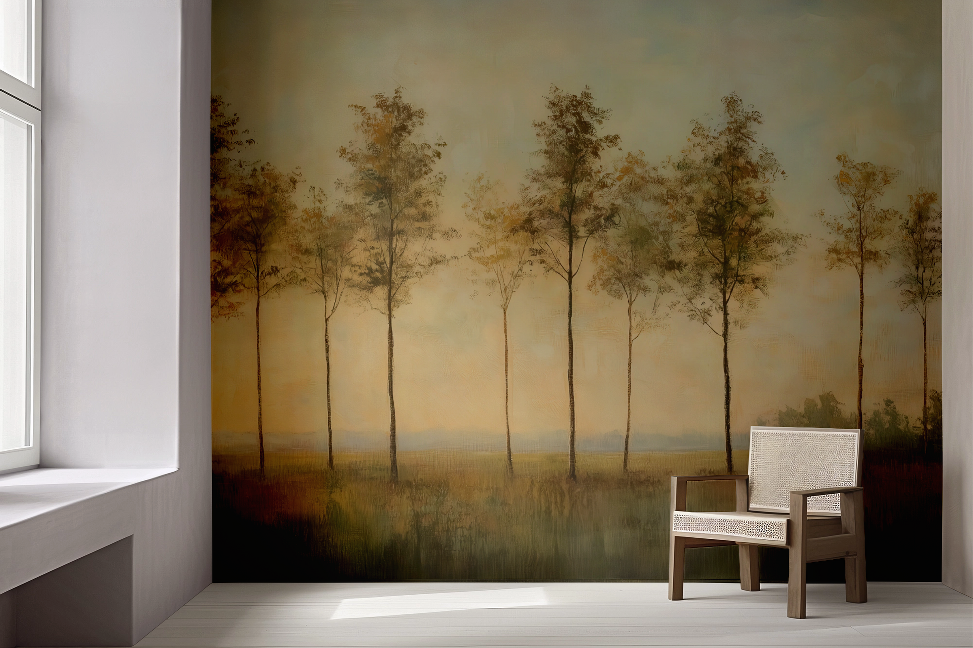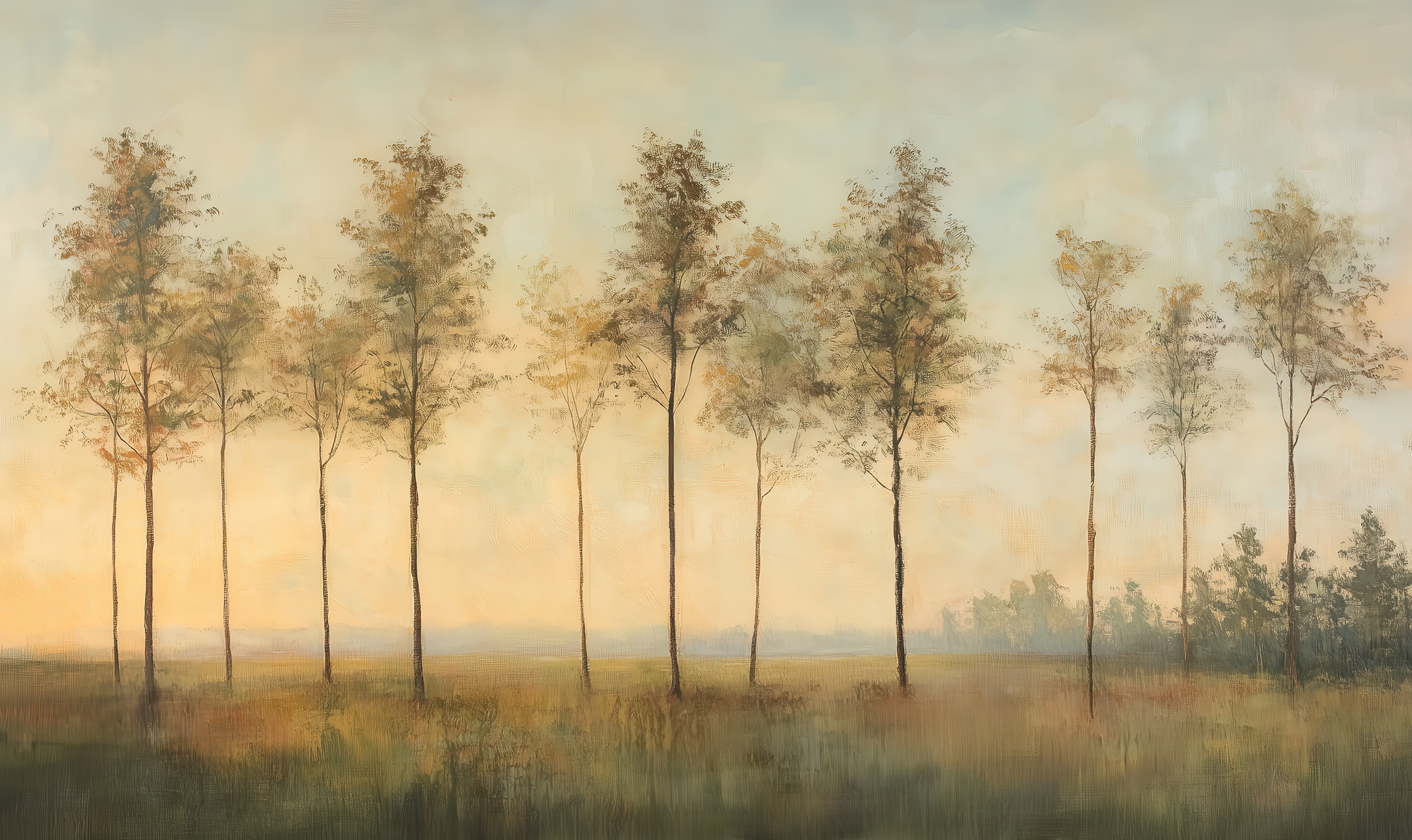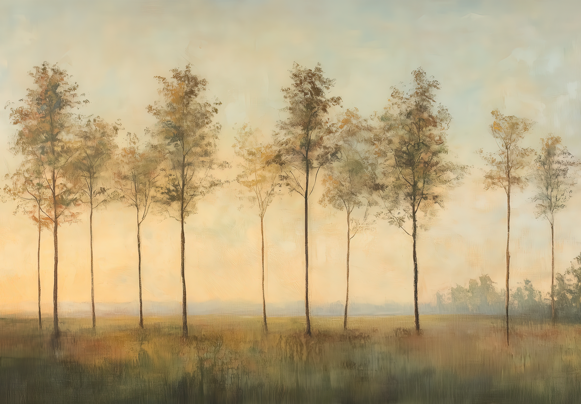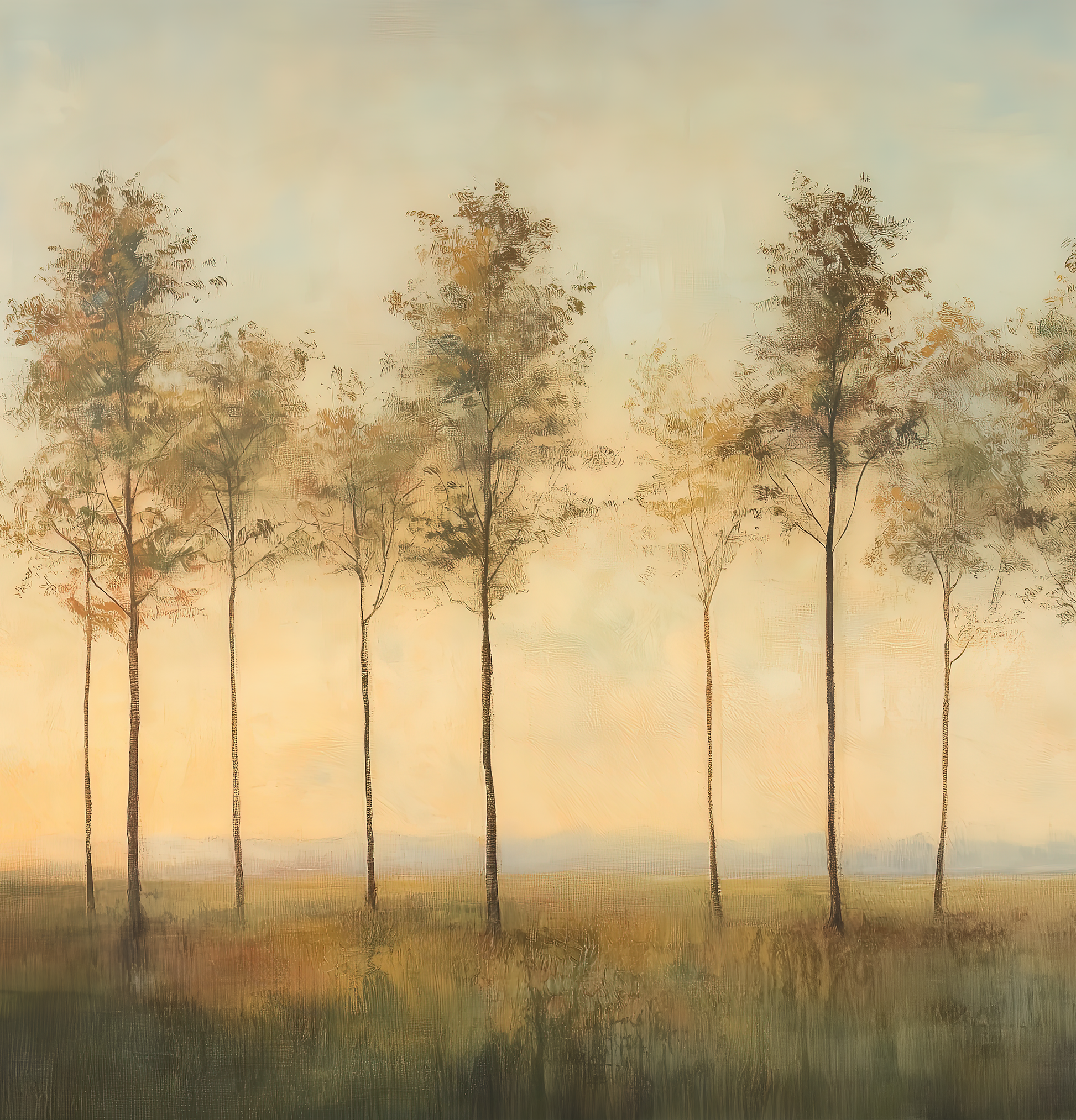 Delicate as the first breath of day, this impressionistic landscape depicts a row of slender trees stretching in gentle harmony across a vast, peaceful plain. The warm pastel tones of sky and earth blend into one another, lending the image a calm, almost meditative mood. The composition appears light, airy, yet grounded—like a quiet moment in nature, captured between dusk and dawn.