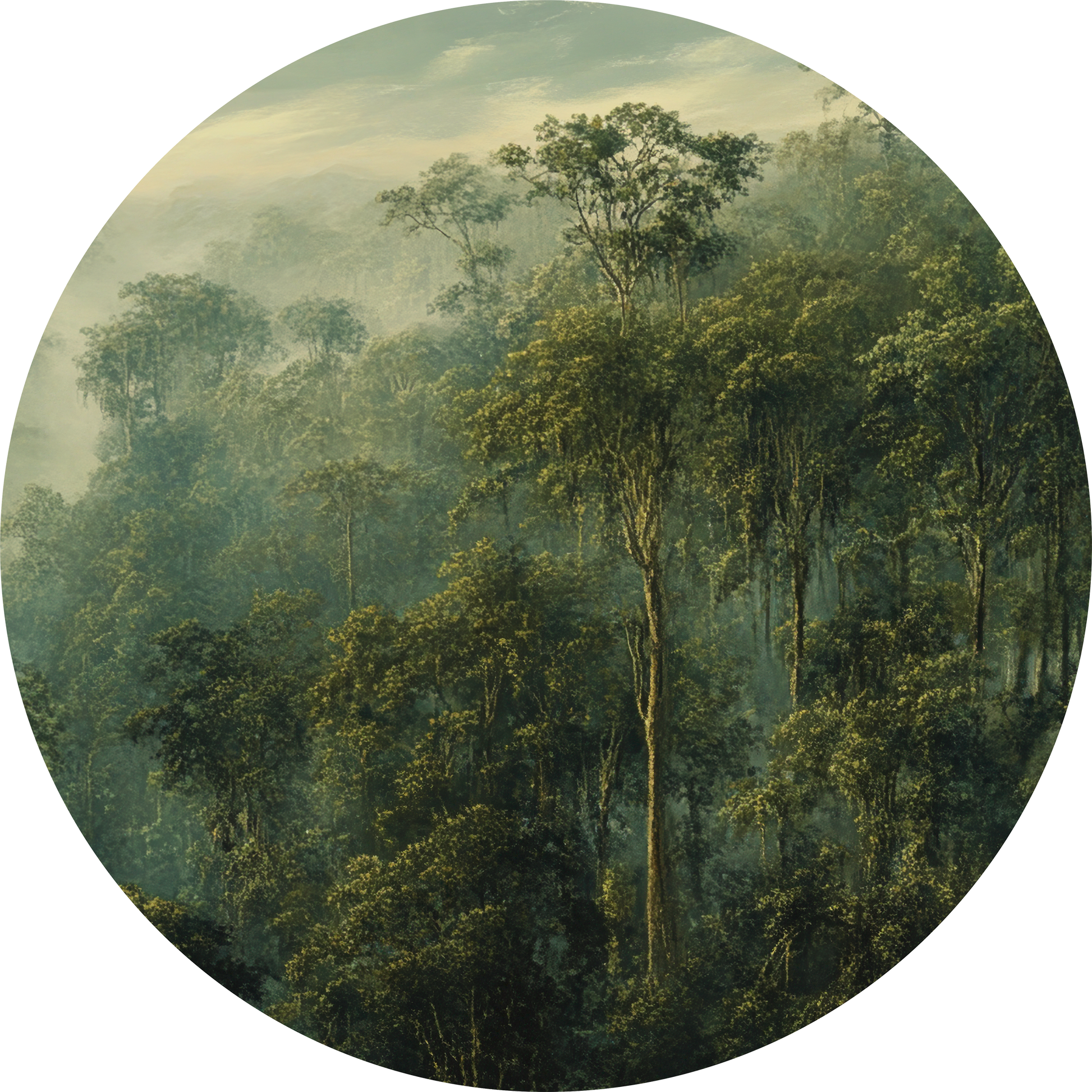 Morning Dew in the Jungle transports you to the magical depths of a tropical rainforest in the first light of day. Fine mist drifts between mighty trees, while soft morning light bathes the lush greenery in a tranquil, almost spiritual atmosphere. This circular wall design creates an extraordinary spatial effect – intense, calming, and connected to nature. Ideal for living rooms, libraries, or creative workspaces where peace and inspiration are needed. A design for all those who long for a retreat full of naturalness and depth.
