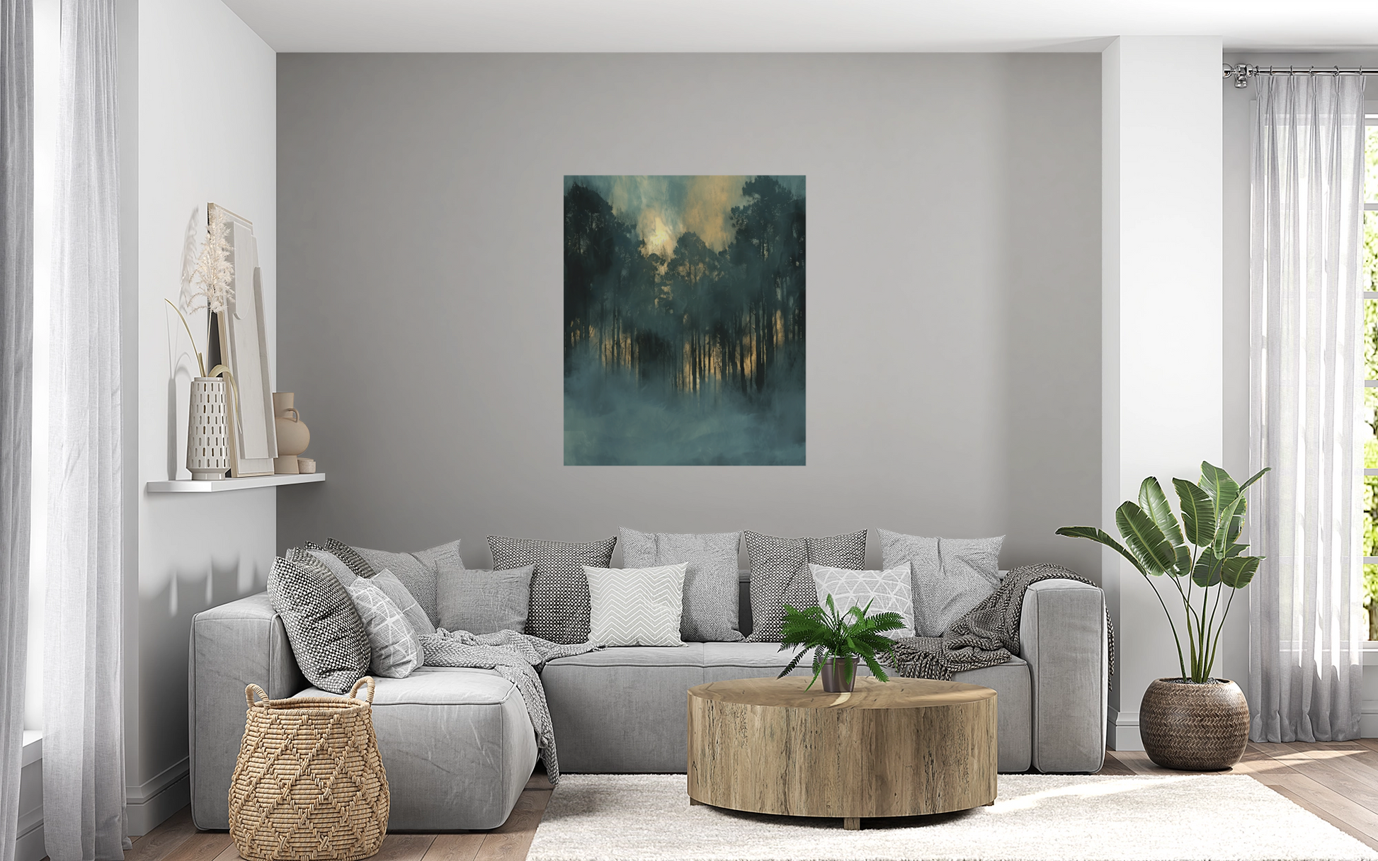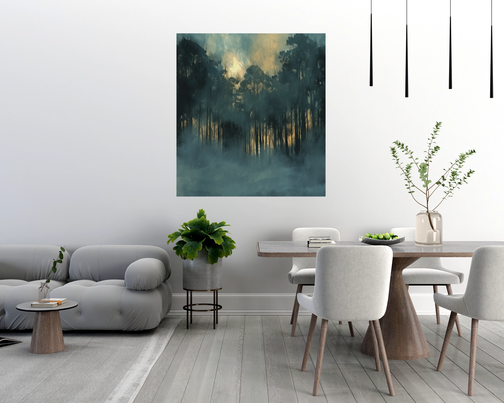 A touch of magic and tranquility hangs over this mystical forest panorama. In soft blue tones and deep black, silhouettes of tall trees blend with thick clouds of fog, while the sunset light casts golden accents through the trunks. "Forest of Twilight" is more than just a wallpaper—it's a window into another world. Ideal for quiet rooms, creative corners, or as a contemplative focal point. This self-adhesive digital wallpaper in 100 × 120 cm format is easy to apply and creates a unique atmosphere in just a few minutes—mysterious, calming, and profound.