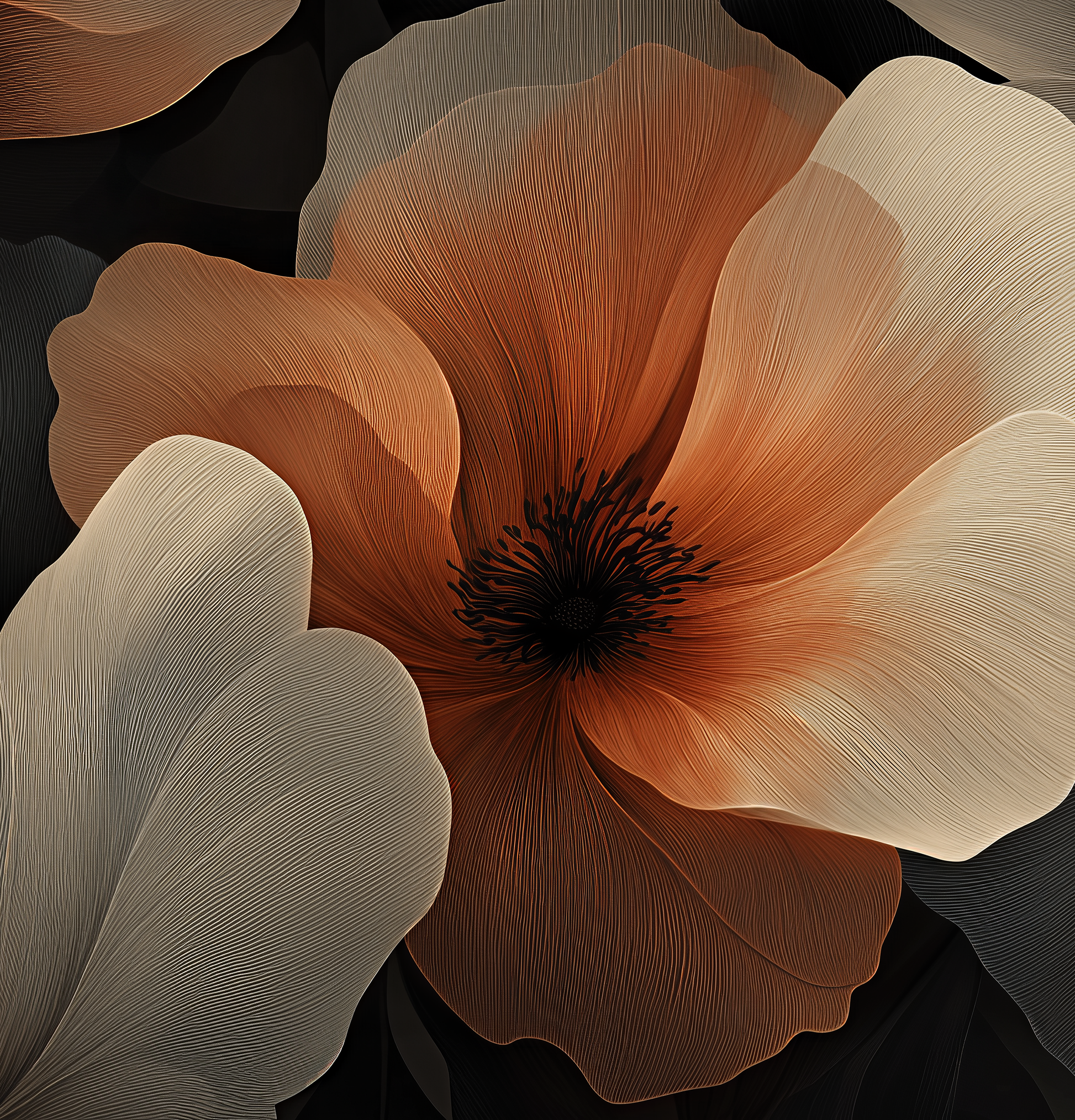 "Amber Whisper" is a floral work of art full of depth, harmony, and movement. The delicate, almost woven lines give the blossoms an organic lightness – like layers of silk opened by the wind. The color palette of warm amber, delicate sand, and soft black creates a sophisticated contrast, making the forms almost luminous. The design plays with the interplay of light and shadow, proximity and distance – like a silent whisper that fills the room without overwhelming it. It is particularly suitable for minimalist interiors, luxurious bedrooms, stylish reception rooms, or creative retreats. Thanks to the self-adhesive backing on a non-woven backing, application is effortless and clean – no paste required. "Amber Whisper" combines modern elegance with natural depth and becomes a tranquil focal point in any stylish room.