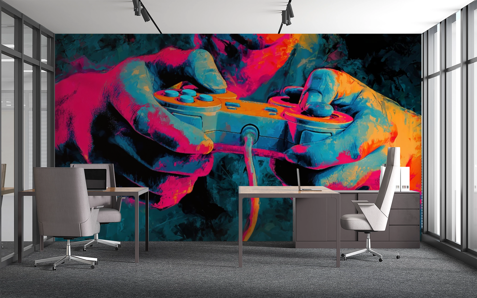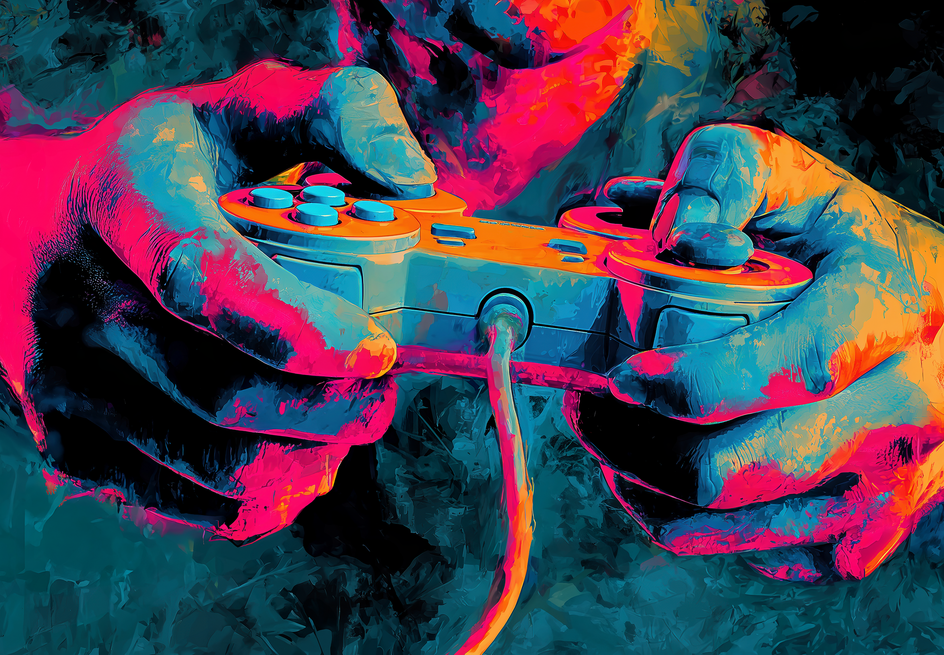 This digital wallpaper is a visual power-up for anyone who loves gaming. The motif depicts a pair of hands with a controller in an intense color riot of neon pink, cyan, violet, and electric orange. The scene appears frozen in a moment of maximum concentration—as if you were feeling the pulse of the virtual world. The colors literally explode, making the classic gamer controller appear like an iconic symbol. Perfect for gaming rooms, teen rooms, or modern spaces with a touch of urban art. The high-resolution digital graphic combines pop culture with art—loud, energetic, and confident. Ideal for individualists, creators, and gamers who want to make a bold statement on their walls.