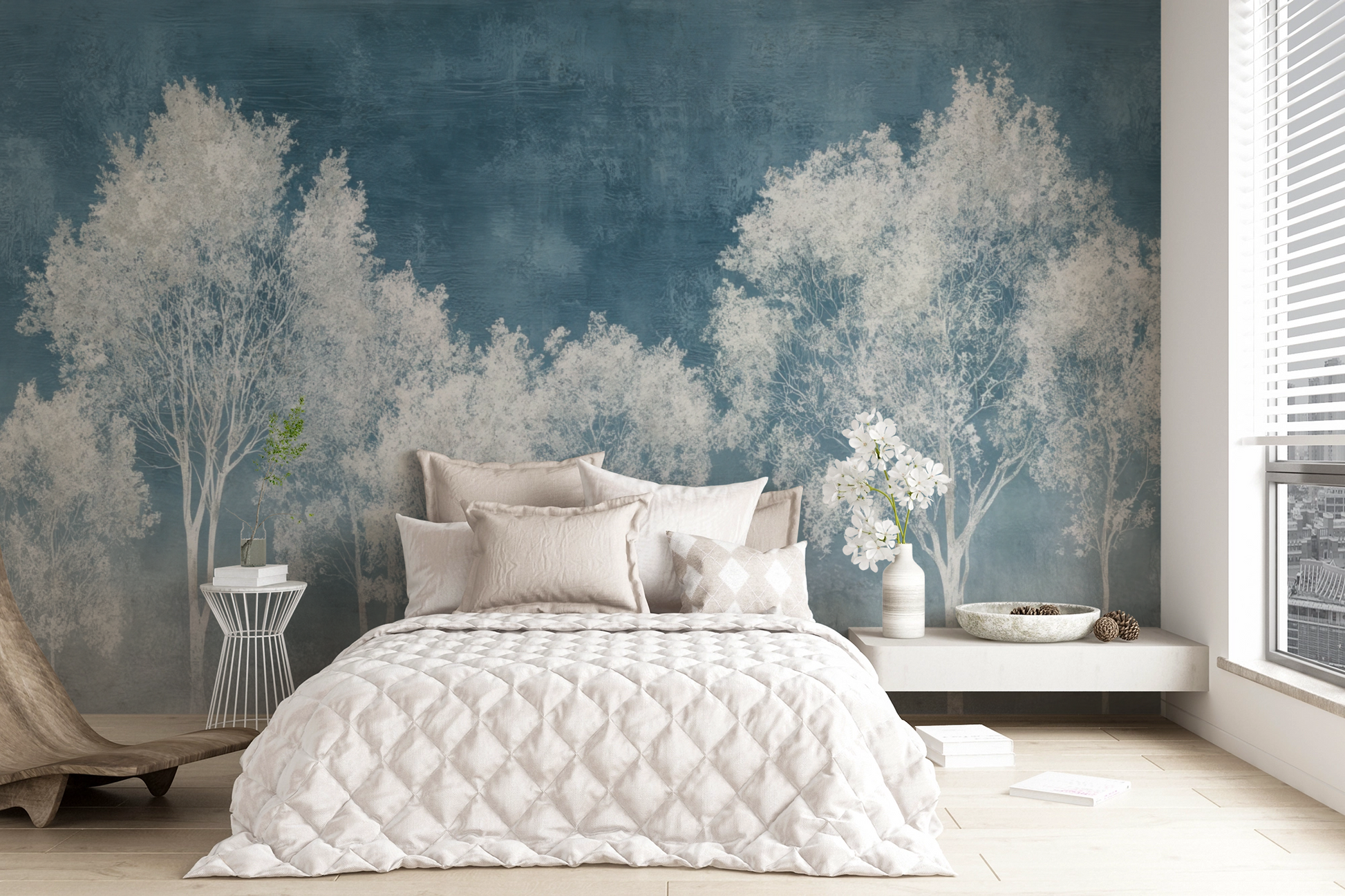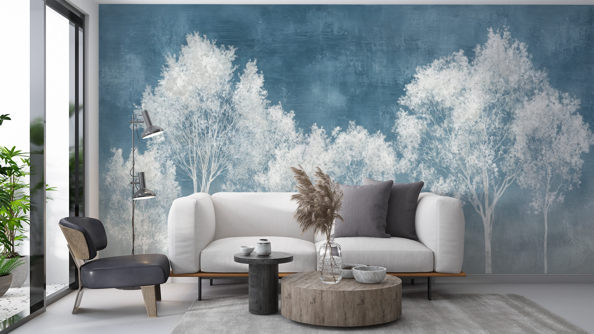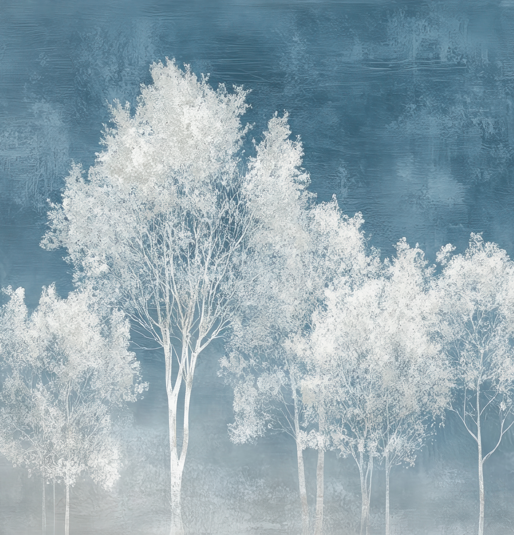 "Nordwind" is a tribute to the quiet power of nature. Delicate treetops appear as if drawn from mist—almost floating on a background of cool blue. This wall design combines clarity, lightness, and depth in an aesthetic overall image. The digital wallpaper visually opens up spaces while creating a restrained, almost meditative effect. It combines beautifully with light wood tones, linen fabrics, or natural stone—perfect for puristic interiors with calm and substance.