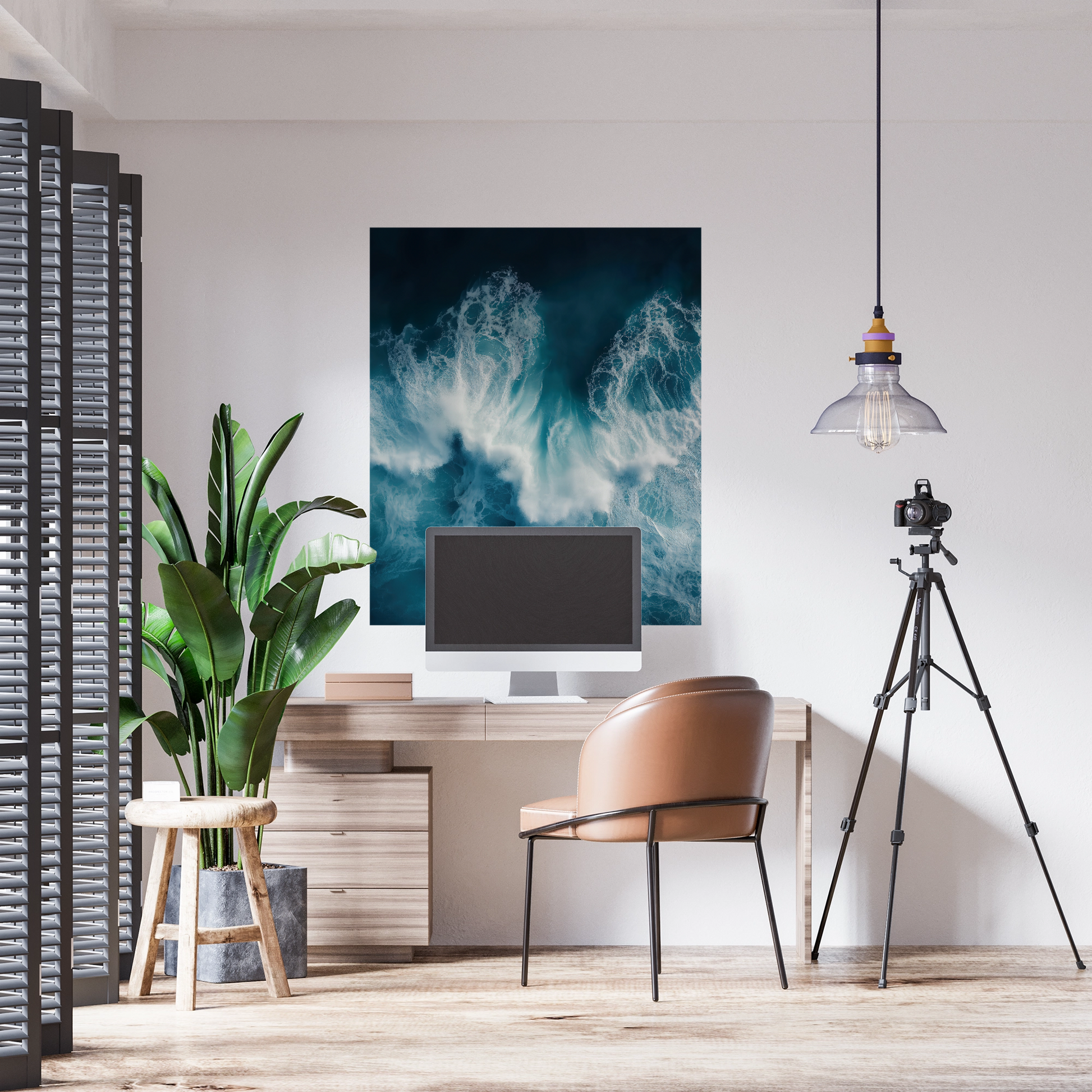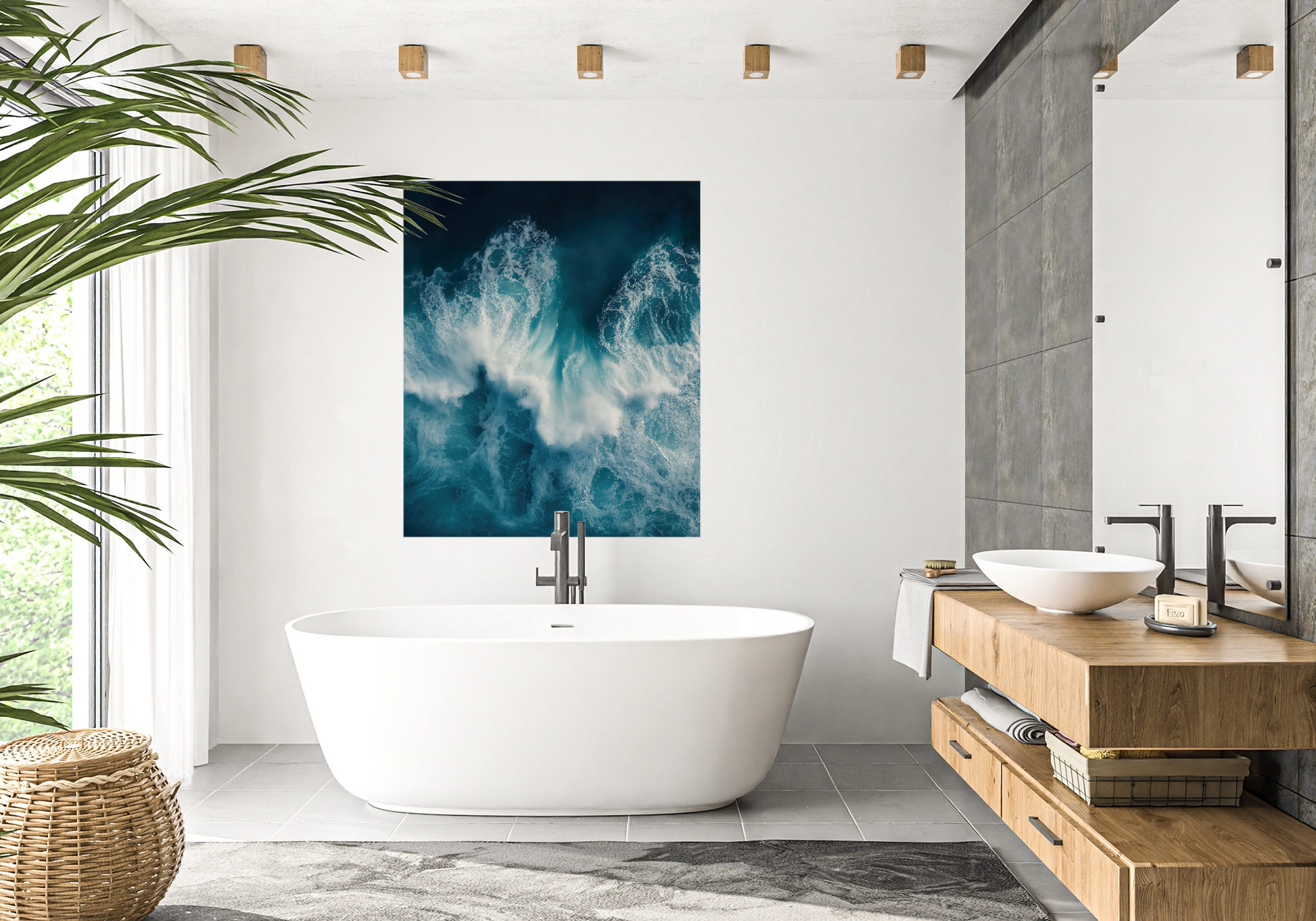 This striking digital wallpaper motif brings the ocean to life in its most powerful yet poetic form. Viewed from a bird's eye view, the design captures the moment when spray and current collide – like a rhythmic heartbeat of nature. The intensely vibrant blue tones merge with delicate, almost drawn foam structures, creating a dynamic composition of energy and depth. Ocean is perfect for modern spaces where the element of water is presented as a symbol of vitality, renewal, and freedom – whether in the living room, spa zones, or creative workspaces. This wallpaper brings the sea into the home – not as a still life, but as a powerful, constantly renewing inspiration.