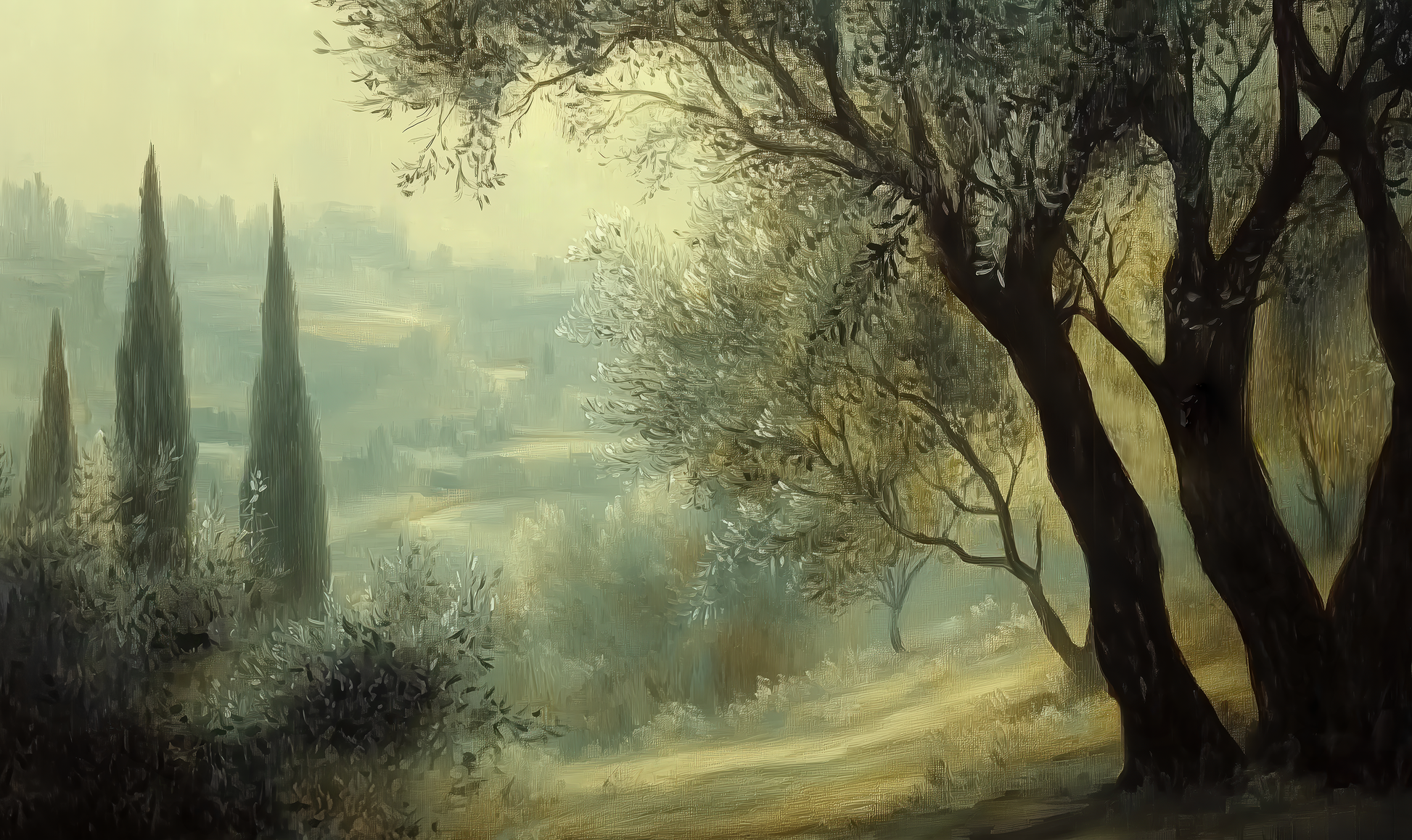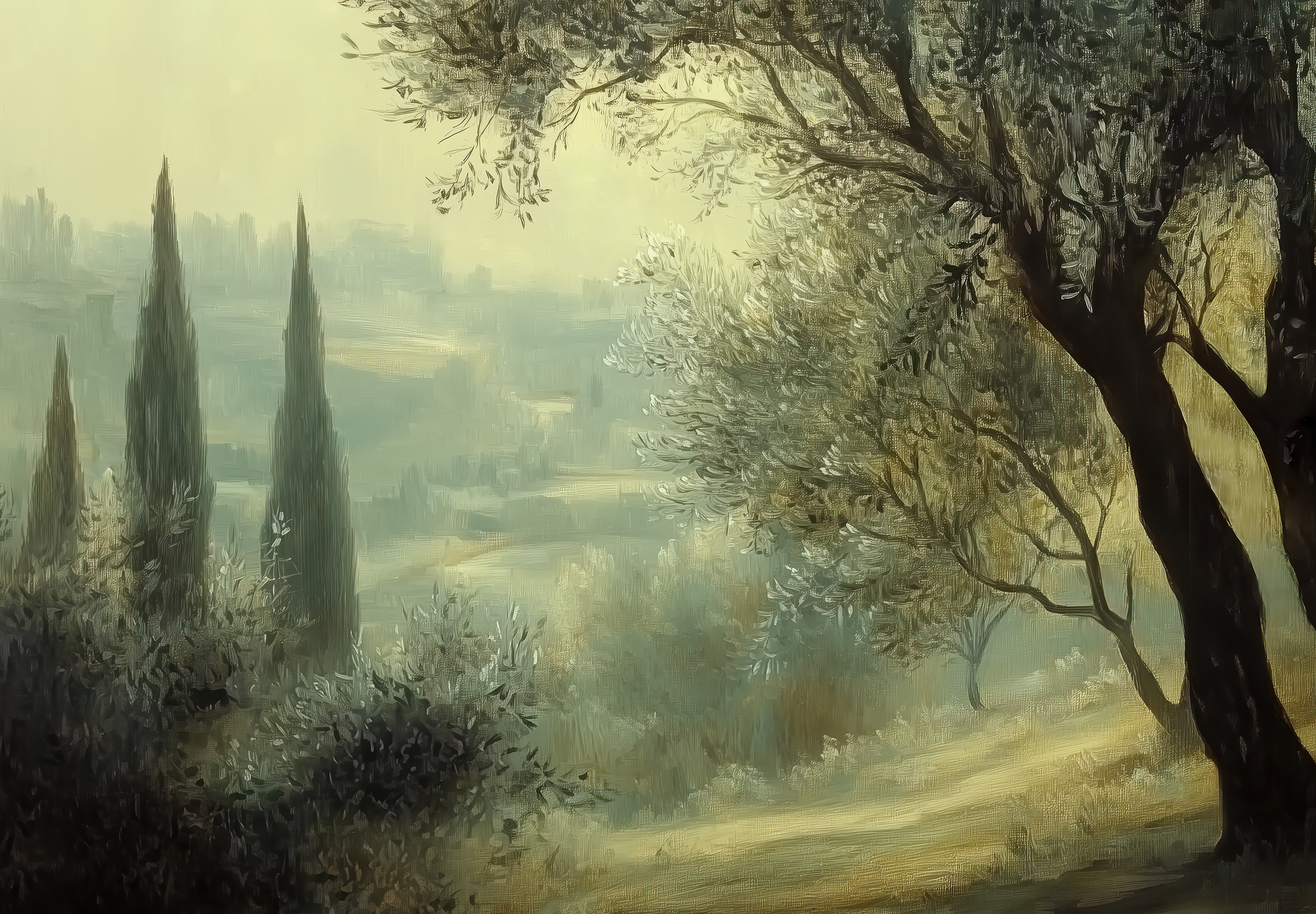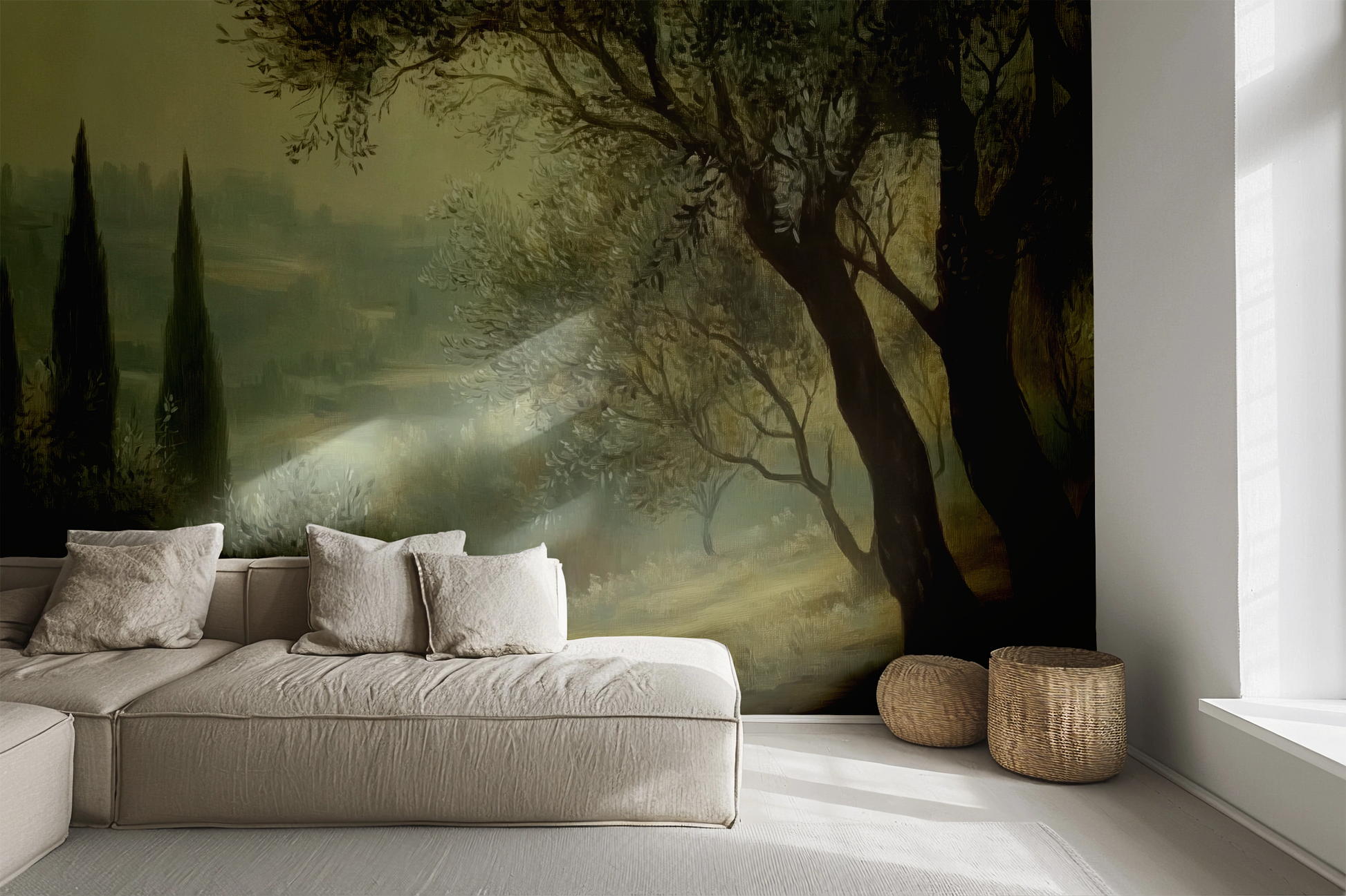 This poetic wall motif transports you to the rolling hills of Tuscany, where the first rays of sunlight break through the gnarled branches of a centuries-old olive tree. Warm reflections dance on the soft ground, while in the background, delicate cypresses and a pastel-colored horizon create an atmospheric depth. The design combines Mediterranean nature with picturesque serenity, creating an atmosphere of calm, grounding, and southern lightness. Ideal for living rooms, bedrooms, or spaces that call for inspiring expansiveness and natural elegance.