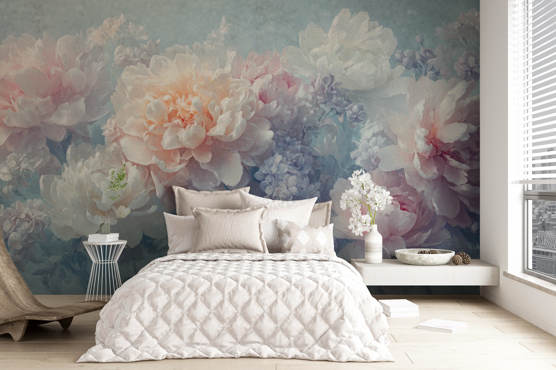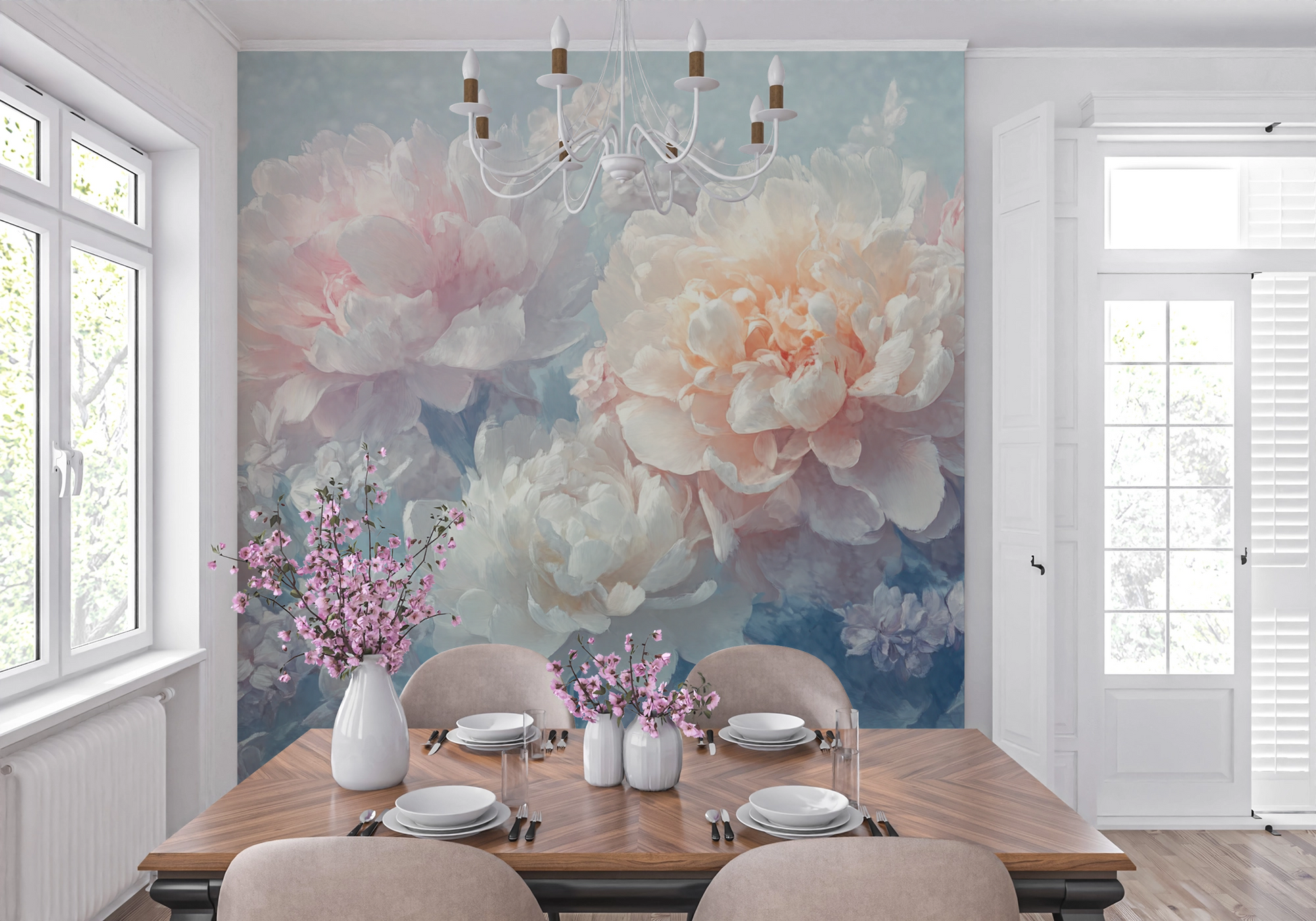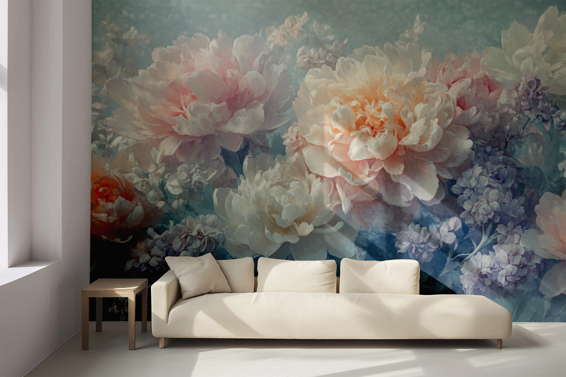This romantic floral composition enchants with lush peonies and delicate lilacs in soft pastel shades—from delicate rose to ivory to light lavender. The soft, almost watercolor-like texture lends the design a dreamy lightness, making it a stylish eye-catcher in modern interiors. "Lilac Dream" brings feminine elegance, freshness, and harmony to the room—ideal for bedrooms or living areas that should radiate calm, grace, and emotional warmth. The motif looks particularly sophisticated when combined with light-colored furniture, linen, or velvet.