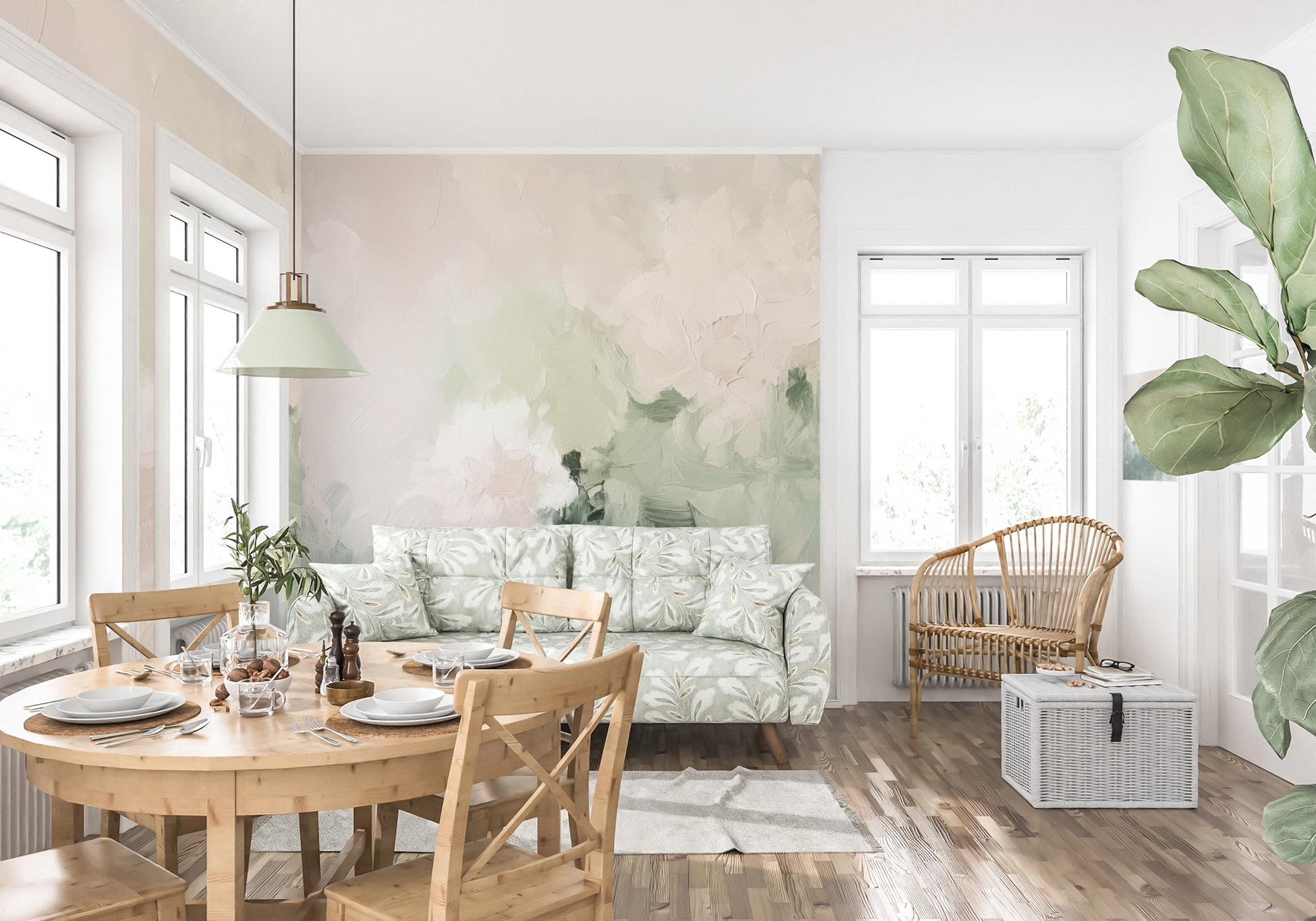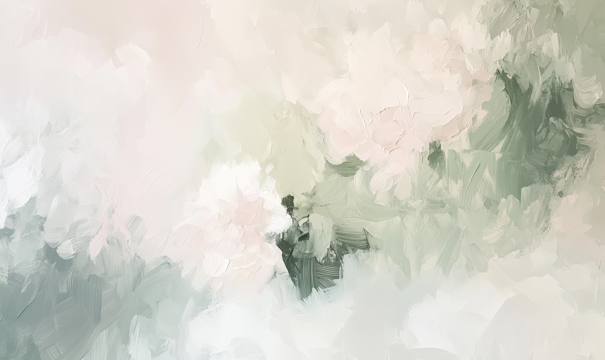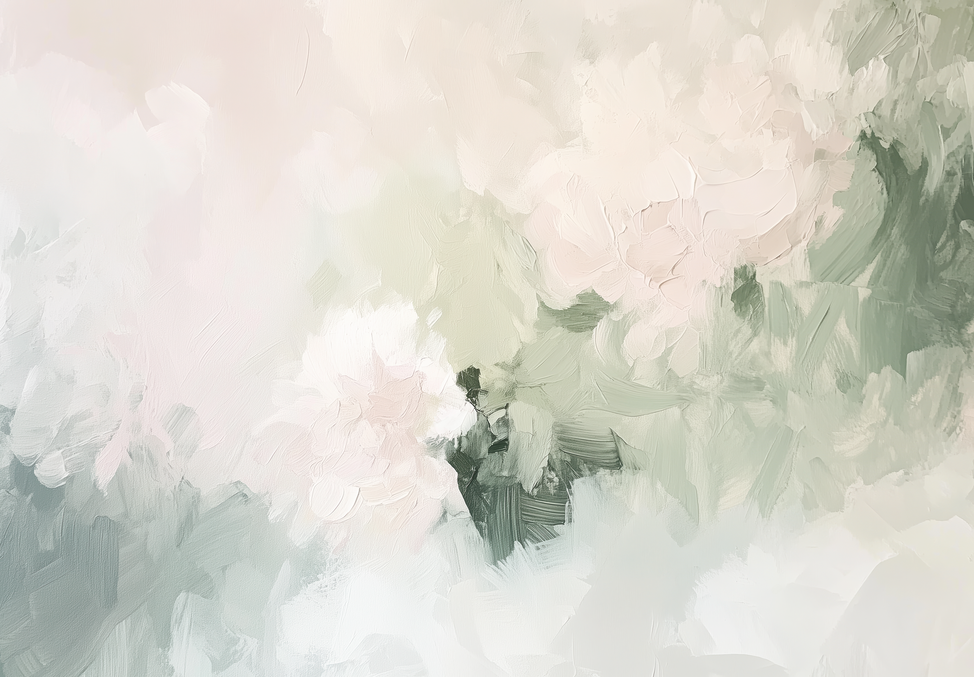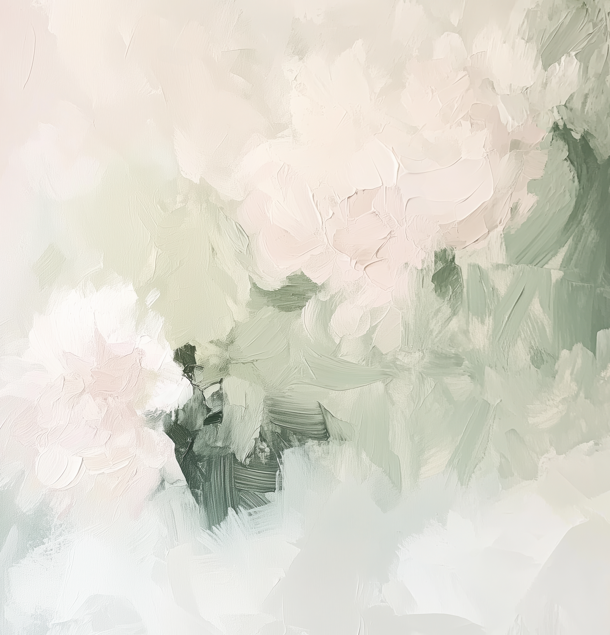 "Rose Dew" lends any room a gentle, almost weightless elegance. In delicate pastel shades—from powdery rose to delicate sage green to airy white—abstract blossoms and leaves flow gently into one another. The painterly surface is reminiscent of delicate brushstrokes, like a floral poem on canvas.