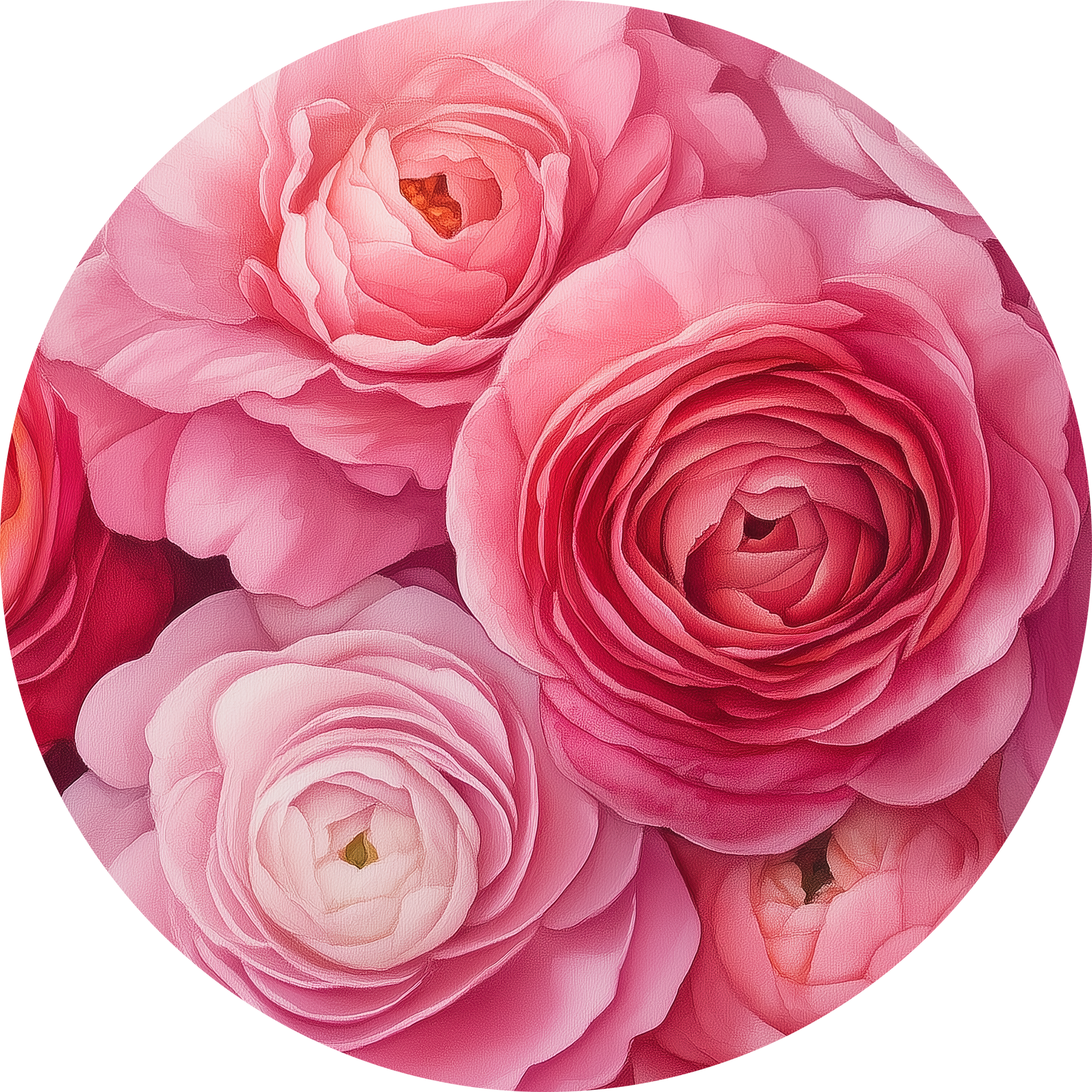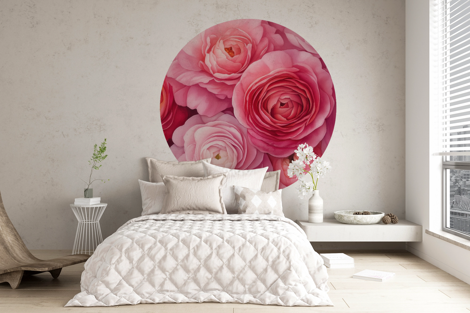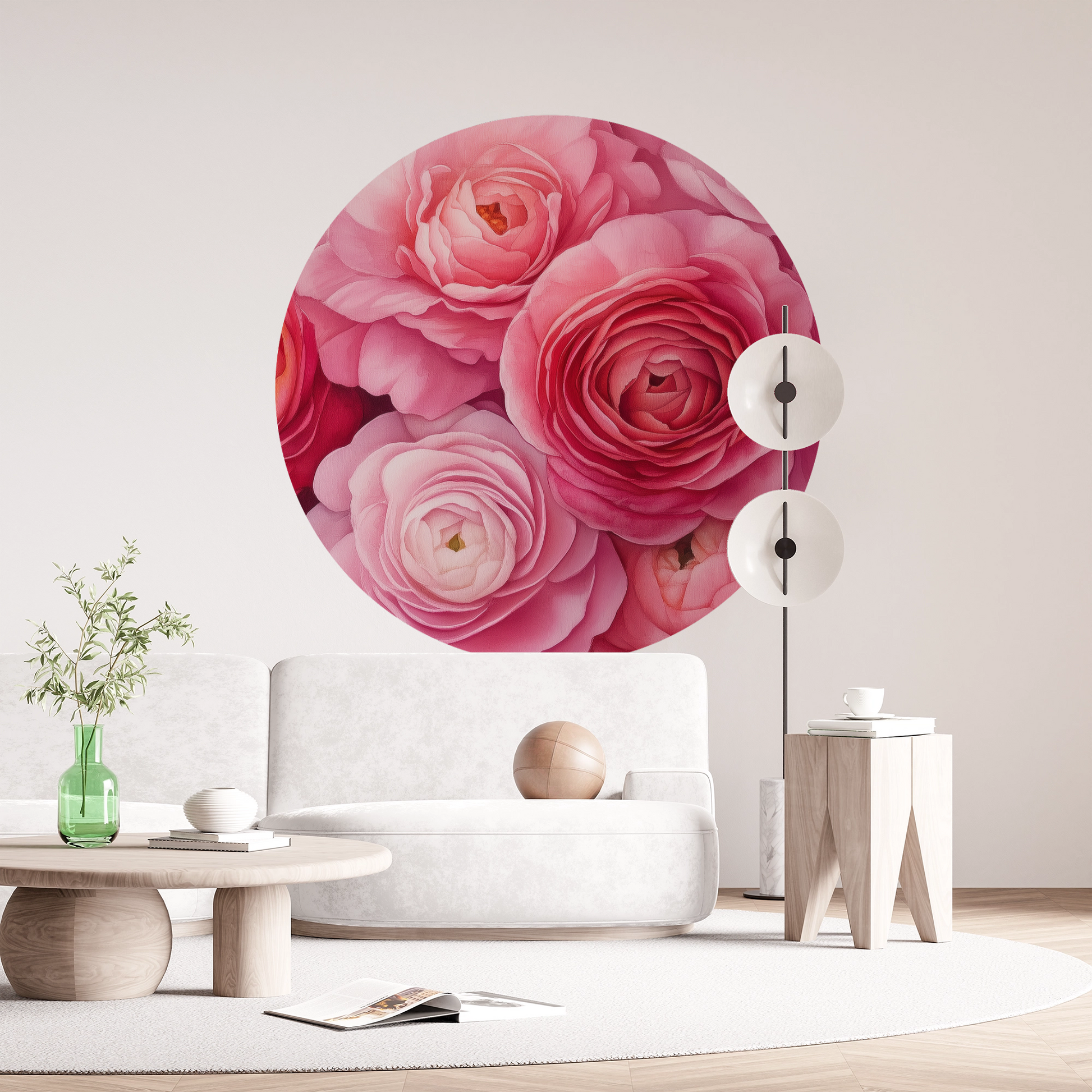 This circular digital wallpaper depicts a sensual sea of ranunculus blossoms in delicate pink and vibrant rose tones. The lush, artfully layered petals lend the design depth, elegance, and a warm, romantic radiance. "Rose Dream" is a stylish eye-catcher for interiors with a feminine, playful, or nostalgic touch—perfect above a bed, a dressing table, or as an accent element in the hallway. The motif looks particularly harmonious when combined with light wooden furniture, rose gold, or velvet—for a modern boudoir flair with emotional expression.