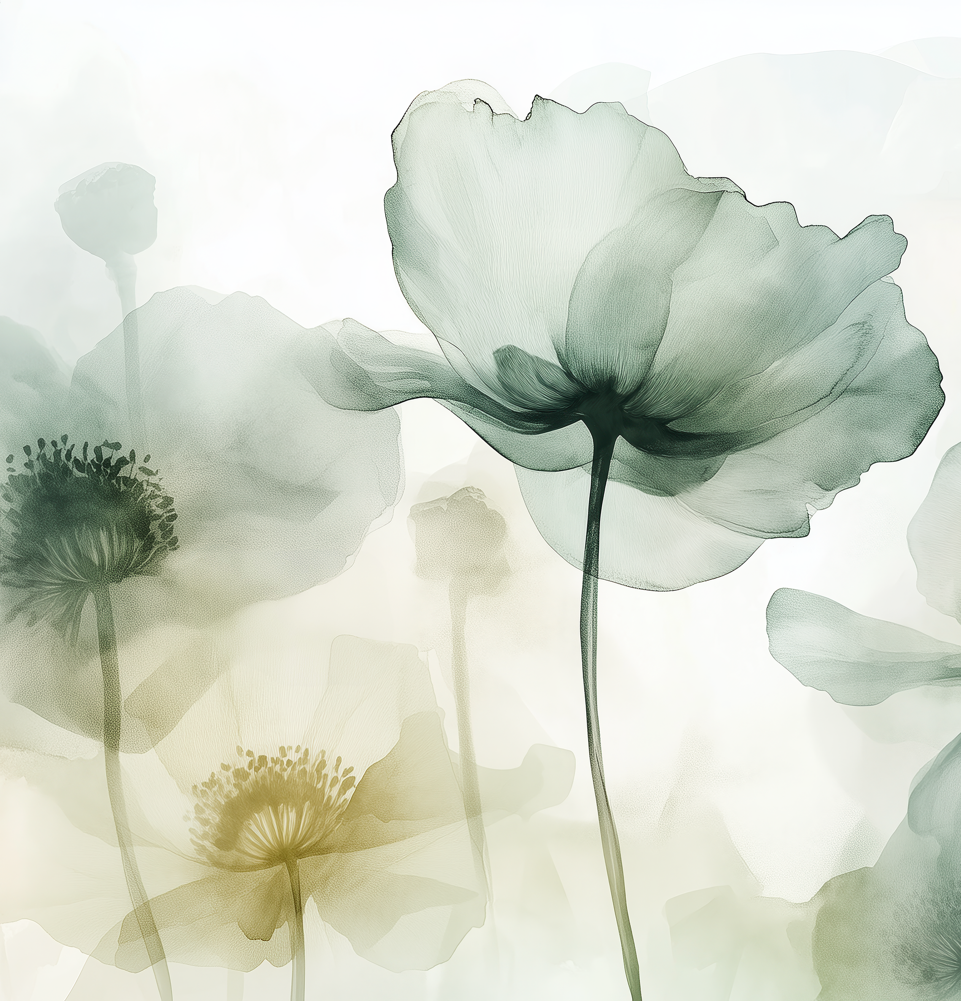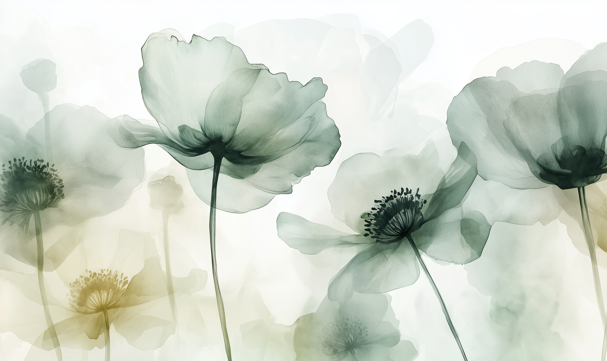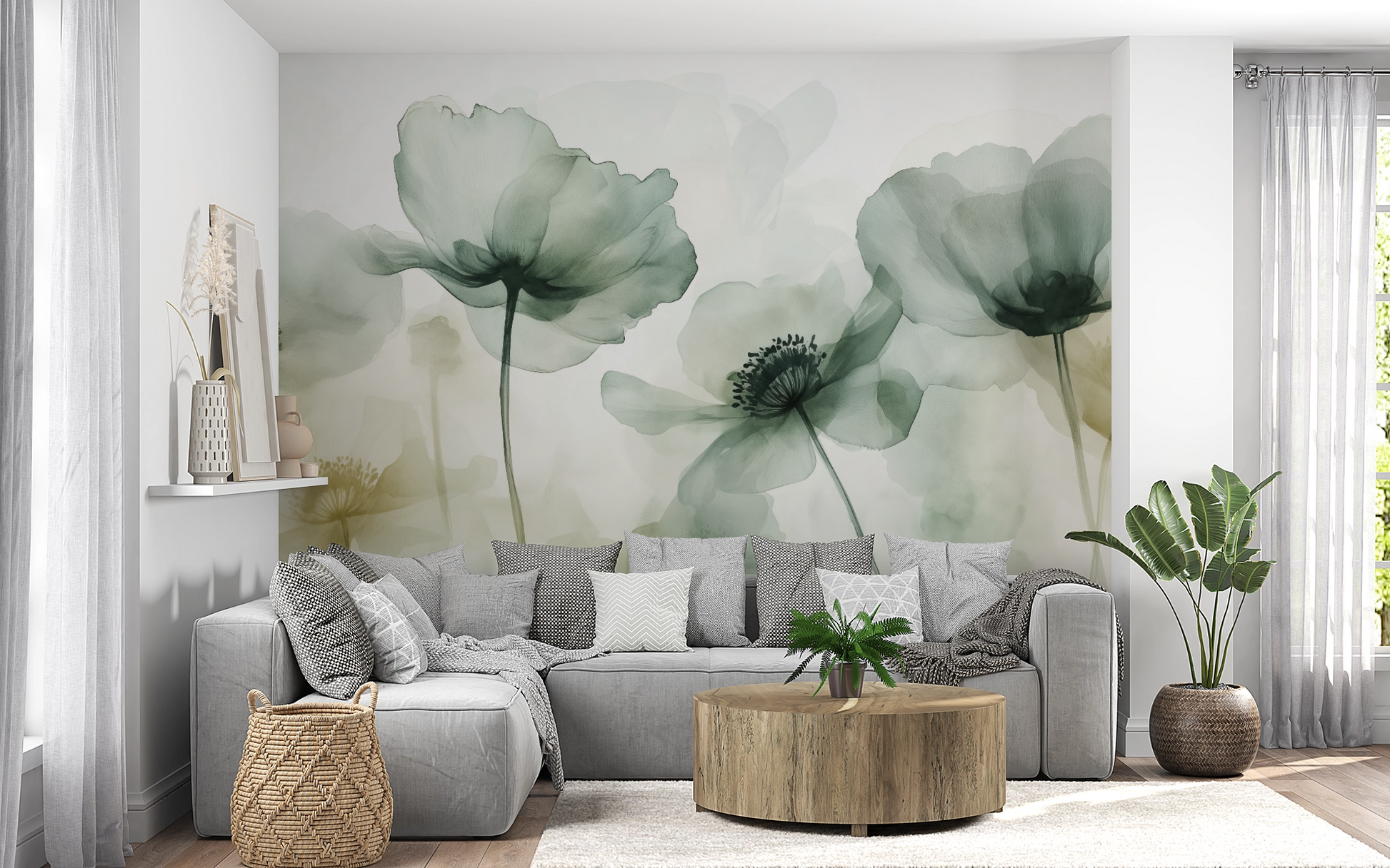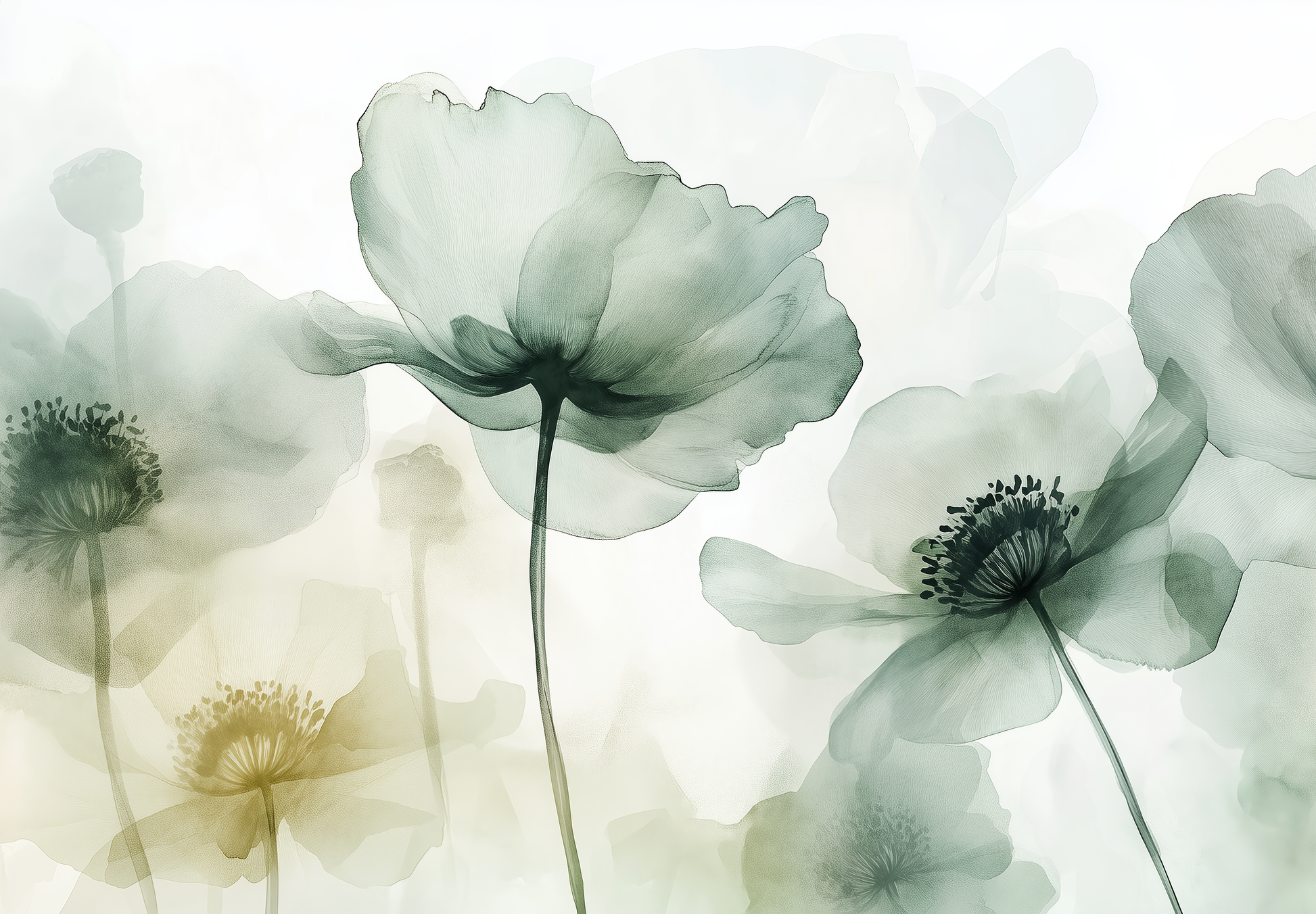 Delicate flowers in soft green tones dance in fine watercolor lines across a light background, lending the motif an almost weightless elegance. The composition appears airy, calming, and yet artfully vibrant—like a touch of nature in the room. Ideal for spaces that should exude calm, lightness, and style—be it the living room, bedroom, entryway, or office.