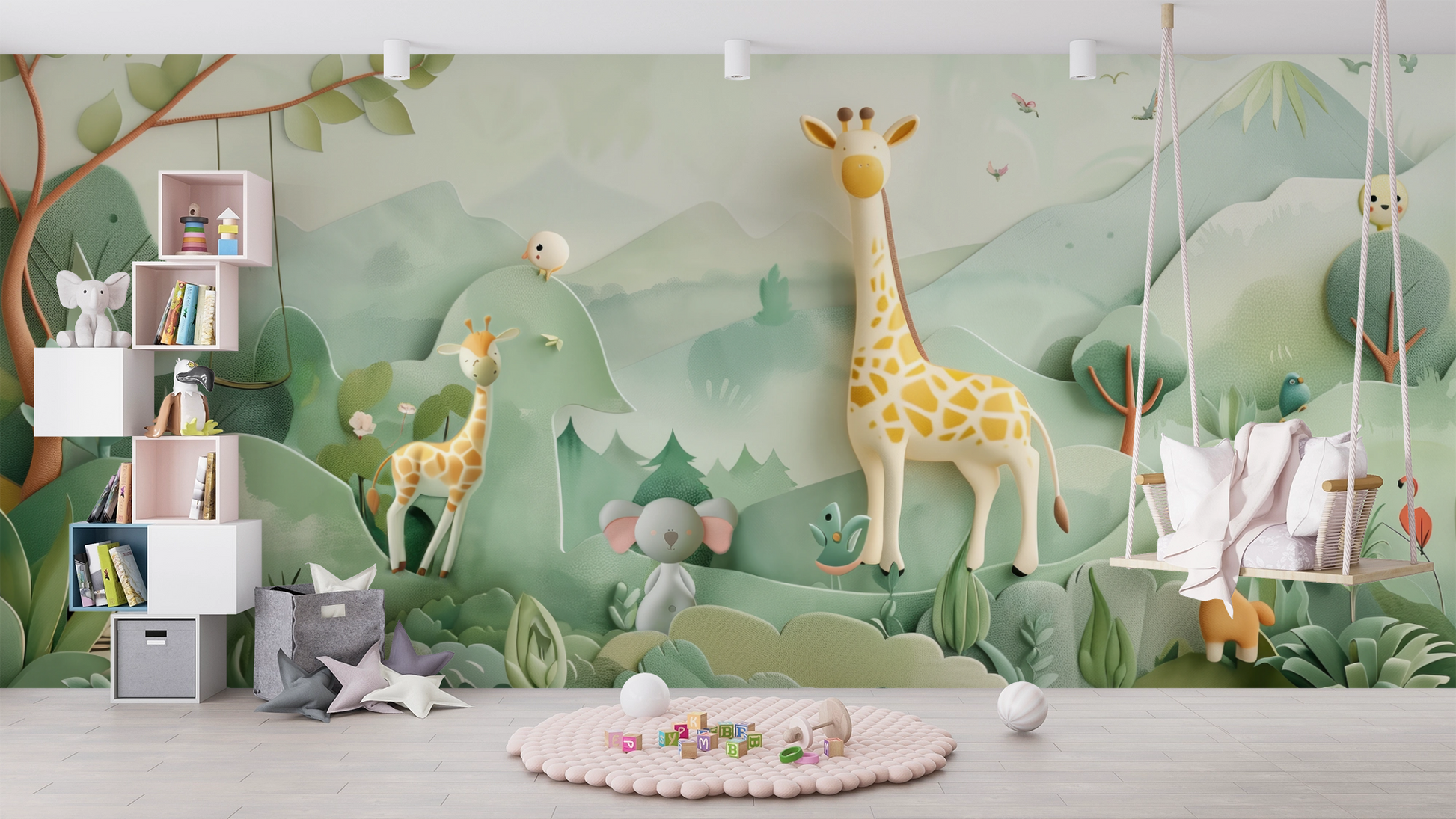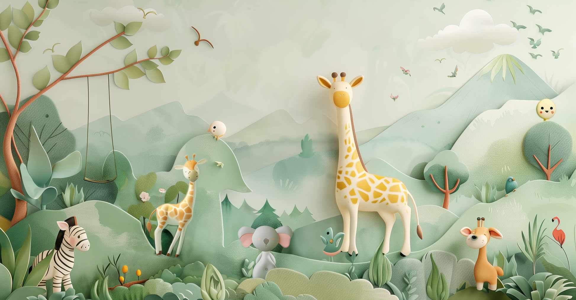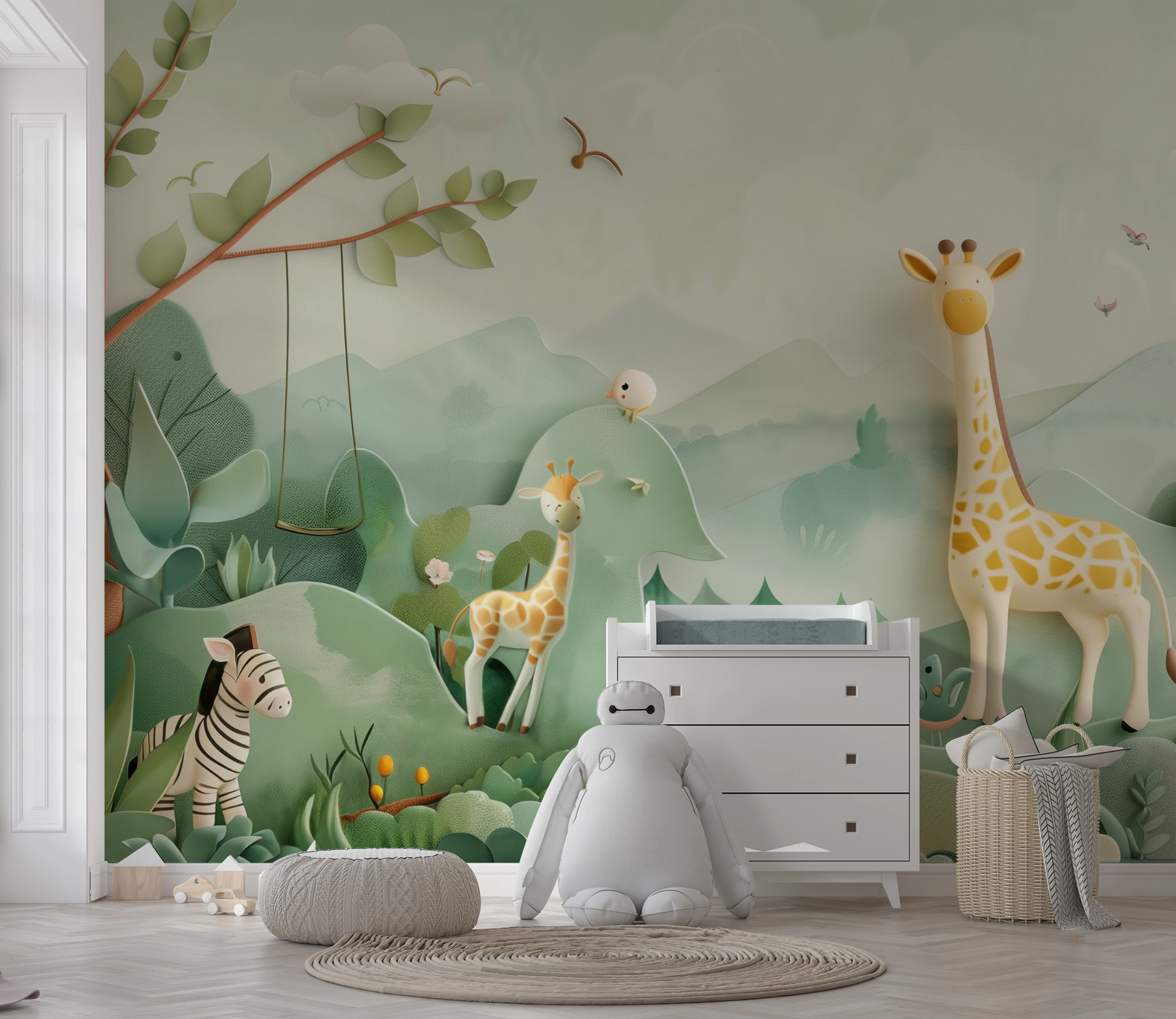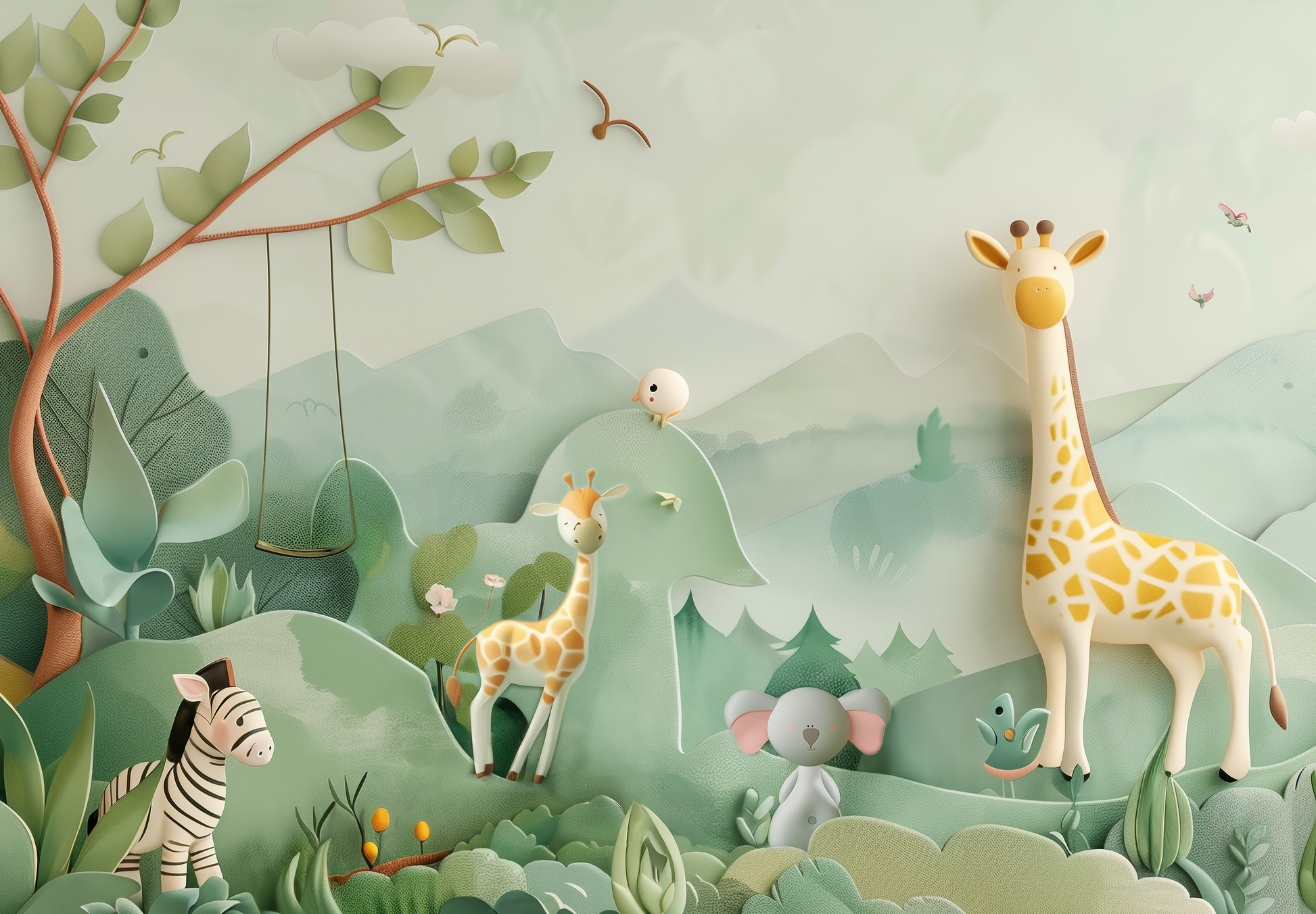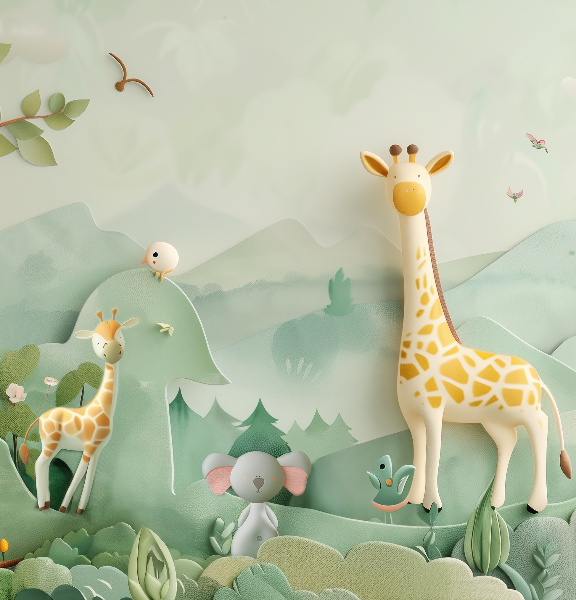 Savanna Friends is an enchanting children's wallpaper that brings a lovingly designed fantasy world to life. Cheerful giraffes, a curious zebra, and a playful kangaroo frolic in a stylized savannah landscape – created in a charming 3D collage style with soft shapes and friendly details. The color palette of mint green, cream, sandy yellow, and delicate pastels creates a calm yet vibrant atmosphere that promotes comfort and creativity in the children's room. Whether for a baby room, play area, or creative walls: this mural brings playful lightness, warmth, and imagination into the home. Savanna Friends is available as a high-quality wallpaper print – self-adhesive, easy to apply, and can be removed without leaving any residue.
