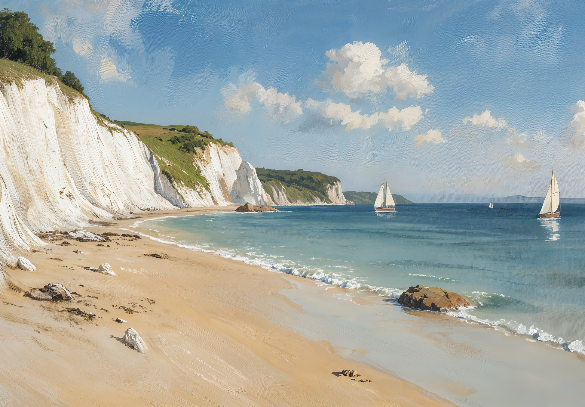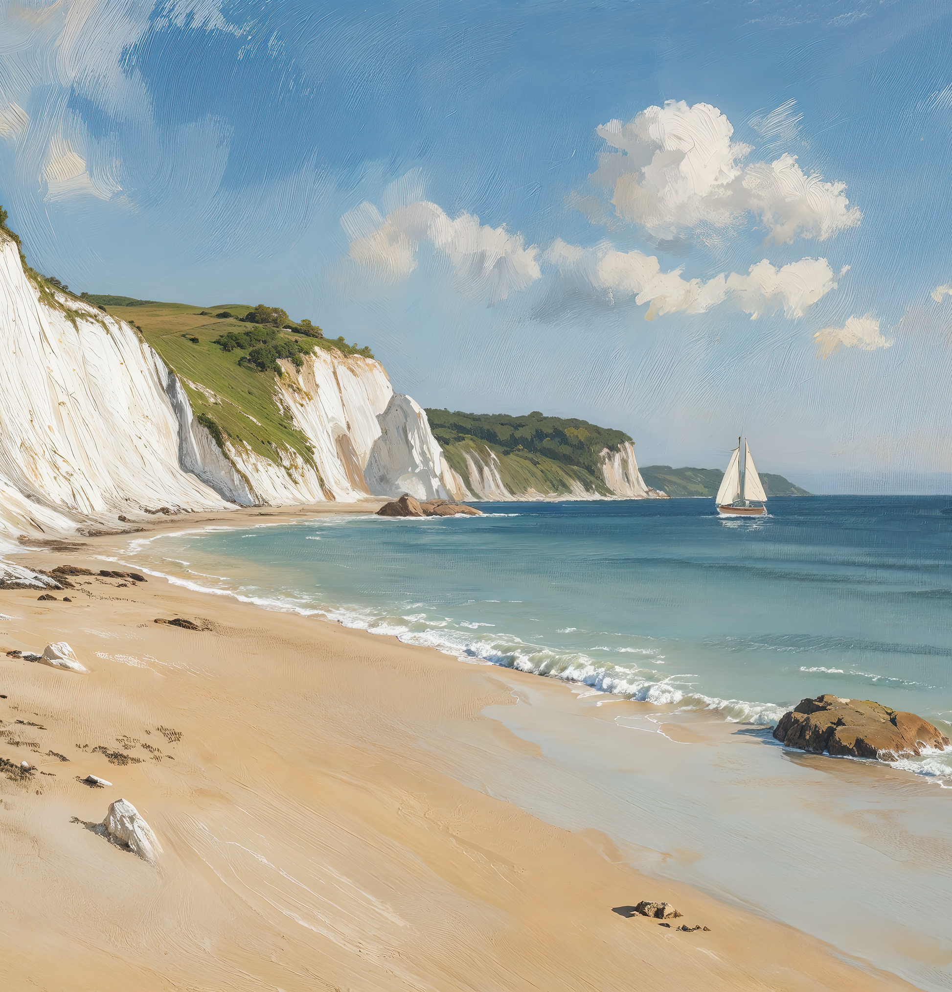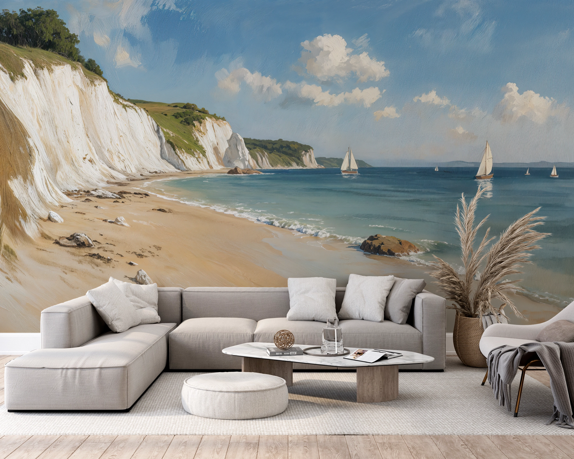 This mural captures the tranquil beauty of a perfect summer day on the coast—where the soft blue of the sky blends with the deep turquoise of the sea. In the foreground lies the warm, golden sand, gently caressed by the lapping waves. Mighty yet gentle, the white chalk cliffs nestle against the shoreline, providing a powerful frame to the scene.