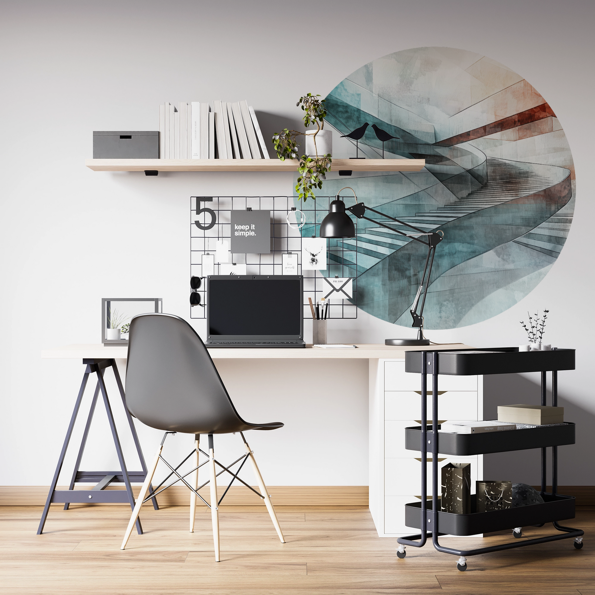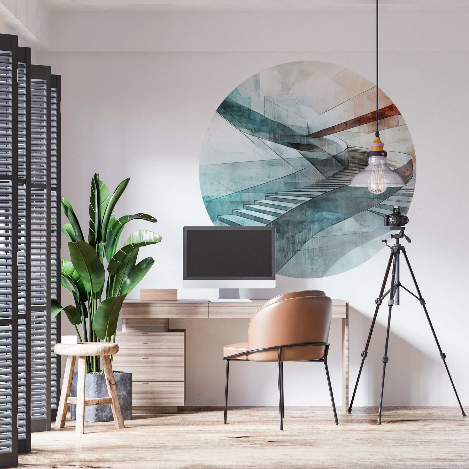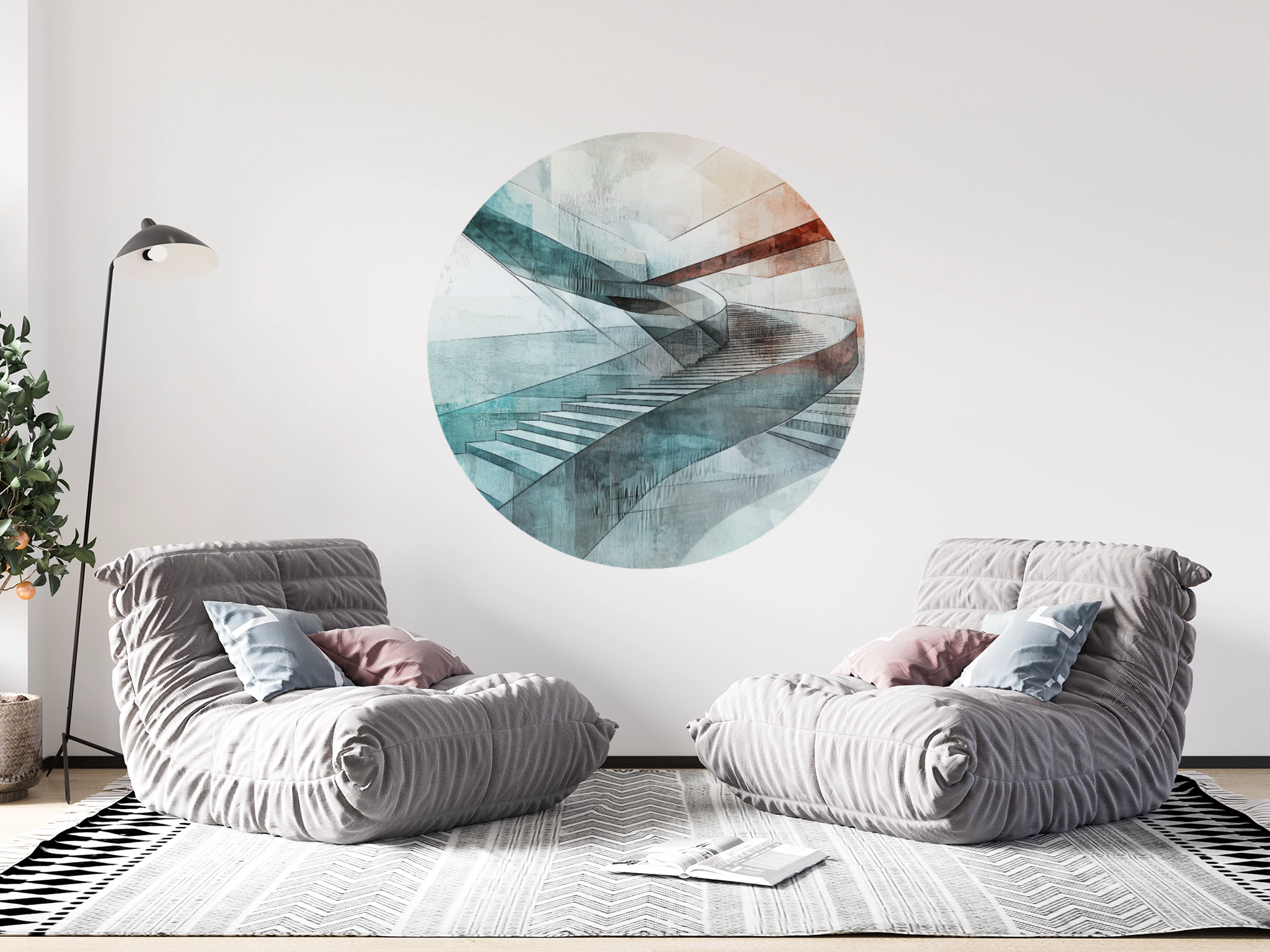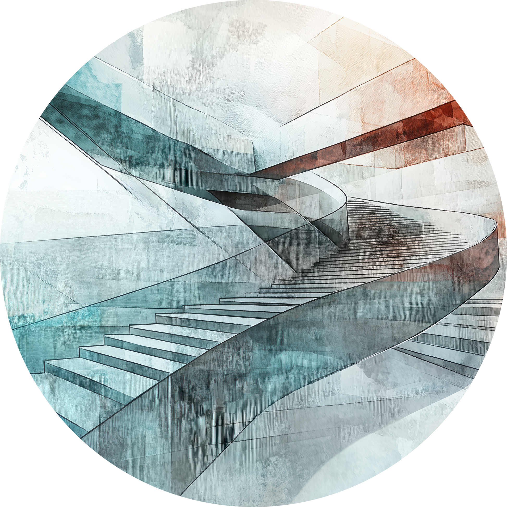 Steps of Abstraction combines architectural rigor with the lightness of watercolor textures. The curved staircase composition appears like an endless ribbon winding through a world of cool blues and warm terracotta tones. Precise lines and flowing color gradients merge into a modern work of art that exudes calm, structure, and movement simultaneously.