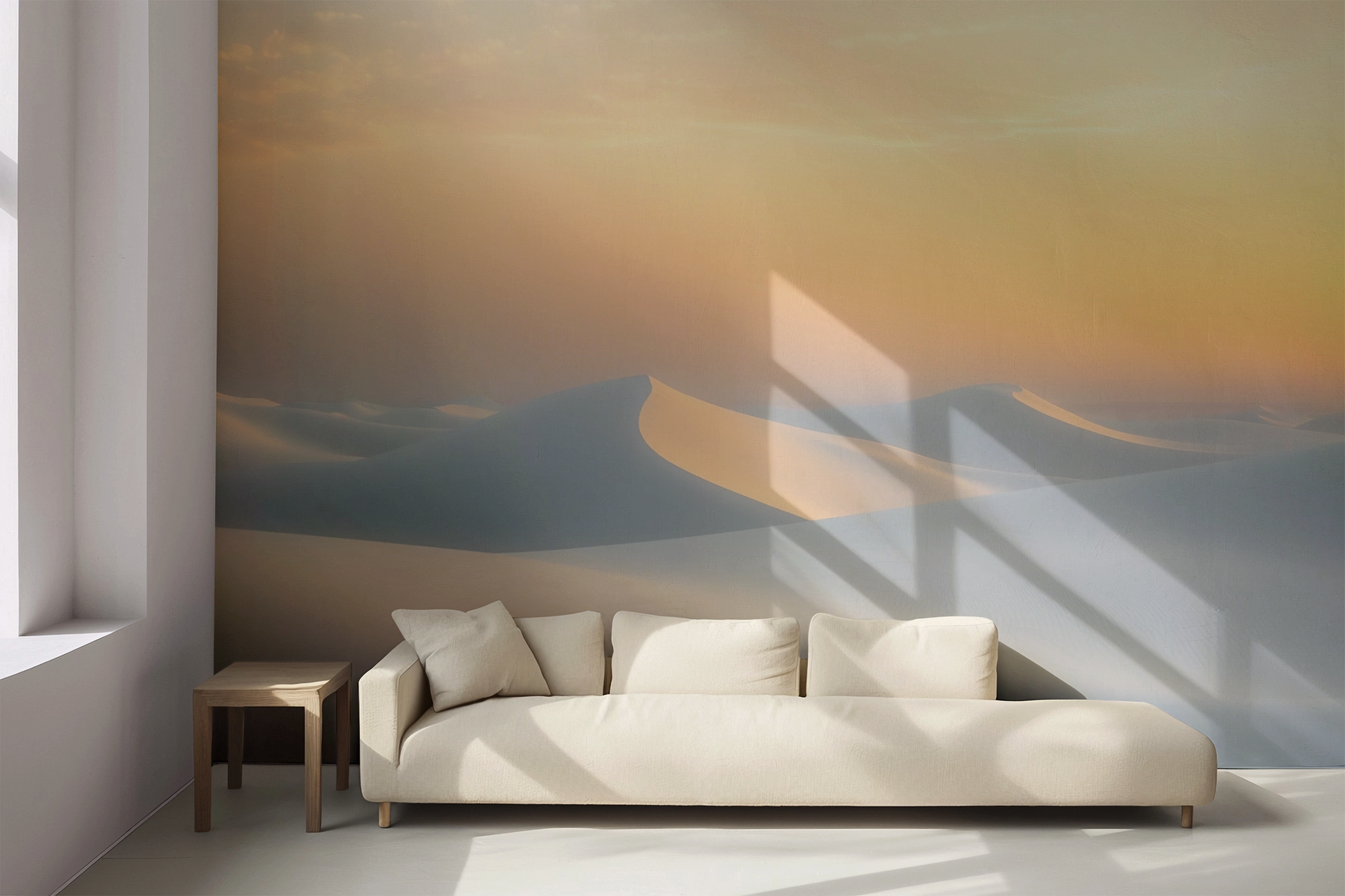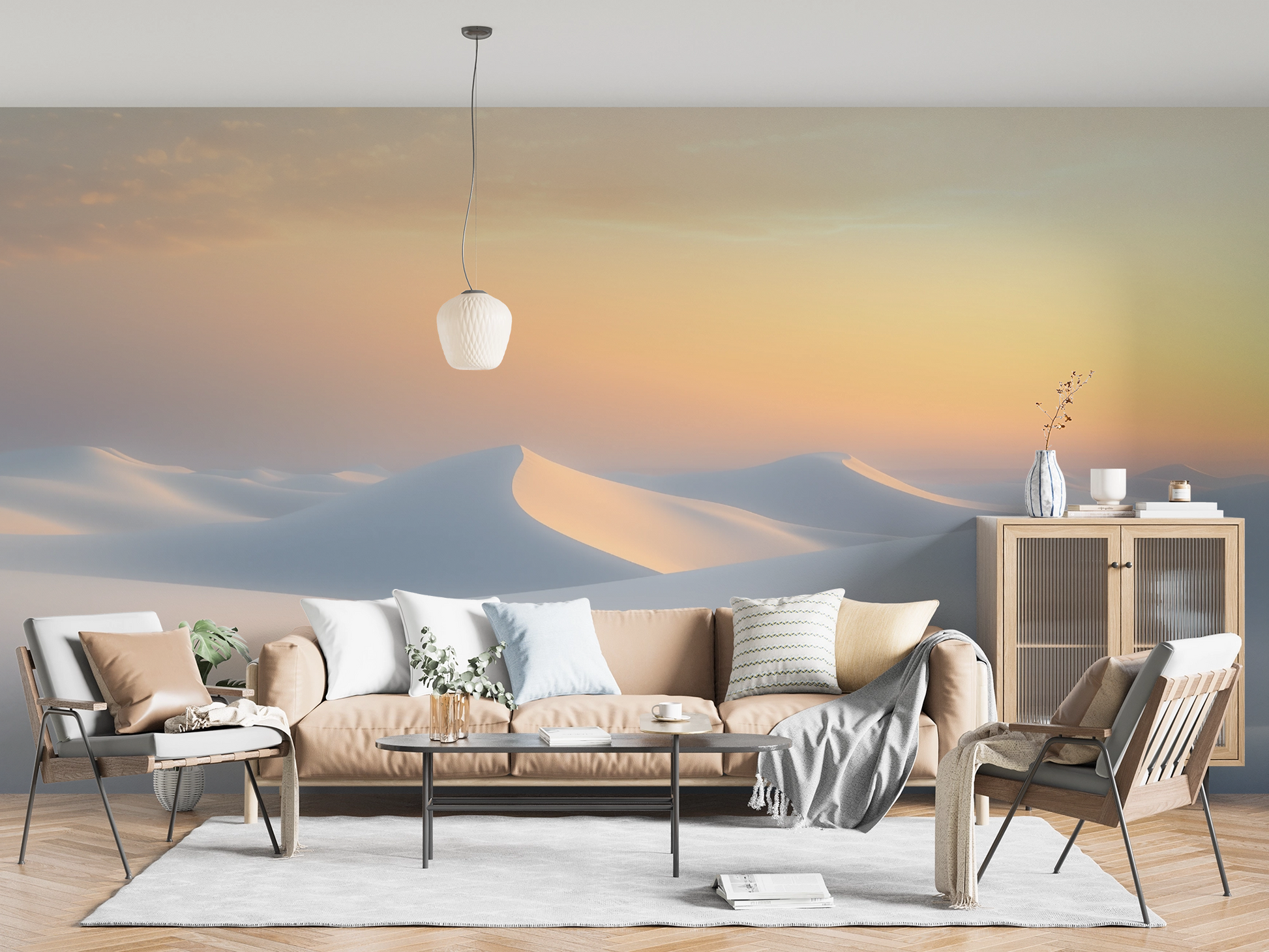 Gentle sand waves, endless expanses, and a touch of tranquility: Silent Dunes brings the meditative beauty of the desert to your wall as a digital mural. The gently rolling dunes appear as if drawn by the wind and are painted in subtle nuances of rose, apricot, light sand, and cool blue. The minimalist color palette creates an atmosphere of calm, lightness, and timeless elegance. This high-quality mural is perfect for modern living spaces, minimalist bedrooms, light-filled offices, or stylish reception areas. It looks particularly harmonious when combined with natural materials such as linen, light wood, or stone—for an ambience that exudes a sense of relaxation and a conscious aesthetic.