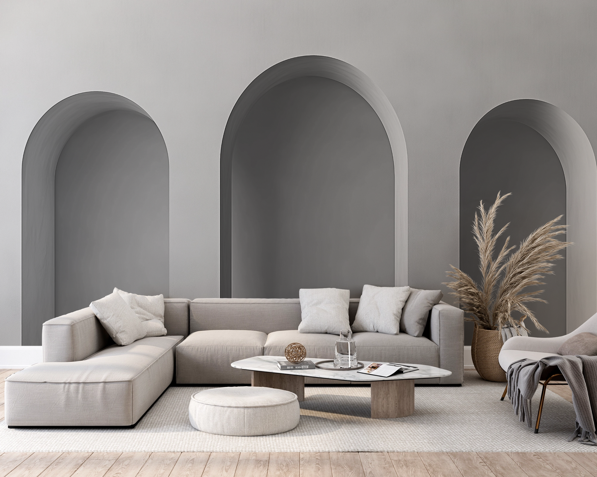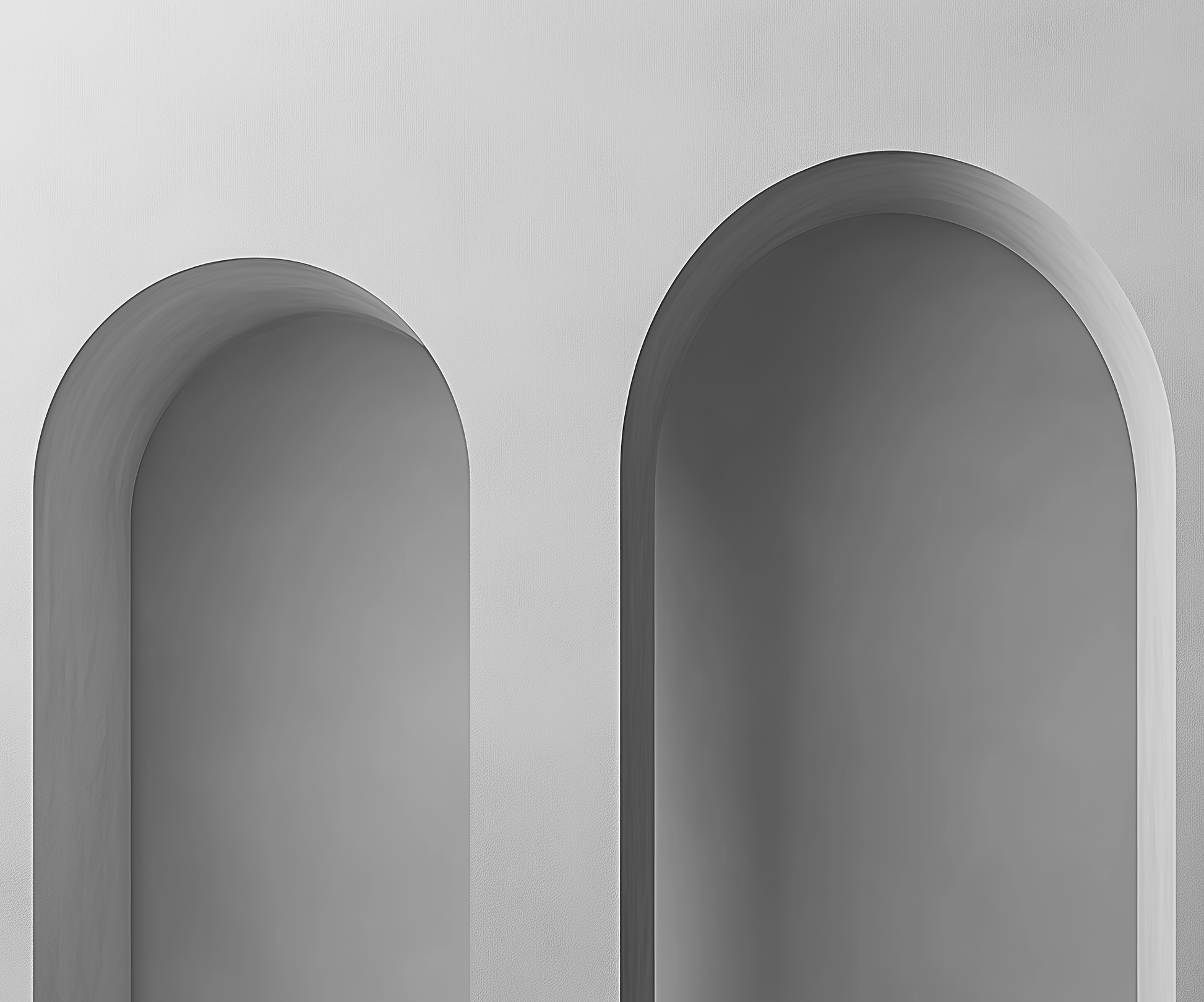 The design is a minimalist wall motif that plays with the quiet power of architecture. Three simple rounded arches of varying depths create a fascinating spatial effect and invite pause. The understated color scheme of light gray and white tones creates a sense of calm and clarity – ideal for modern interiors with a focus on light, geometry, and balance. Whether in the hallway, office, or living room: this wallpaper is a stylish haven of calm in any room. For design lovers who value the essentials.